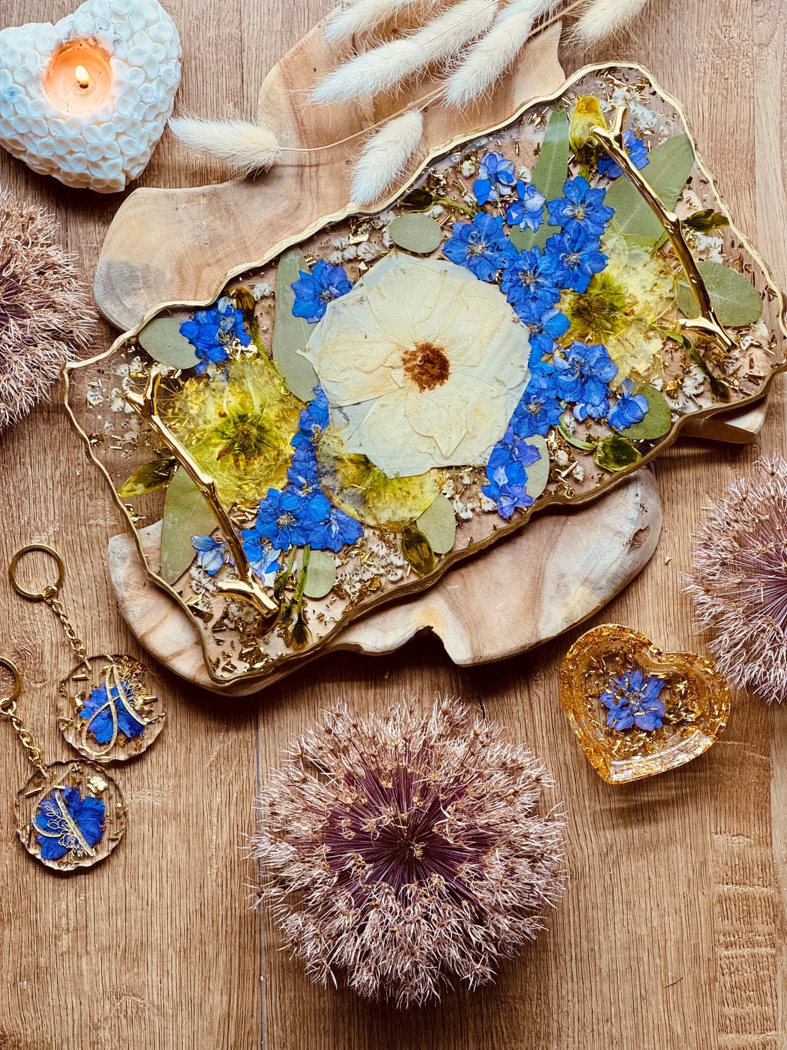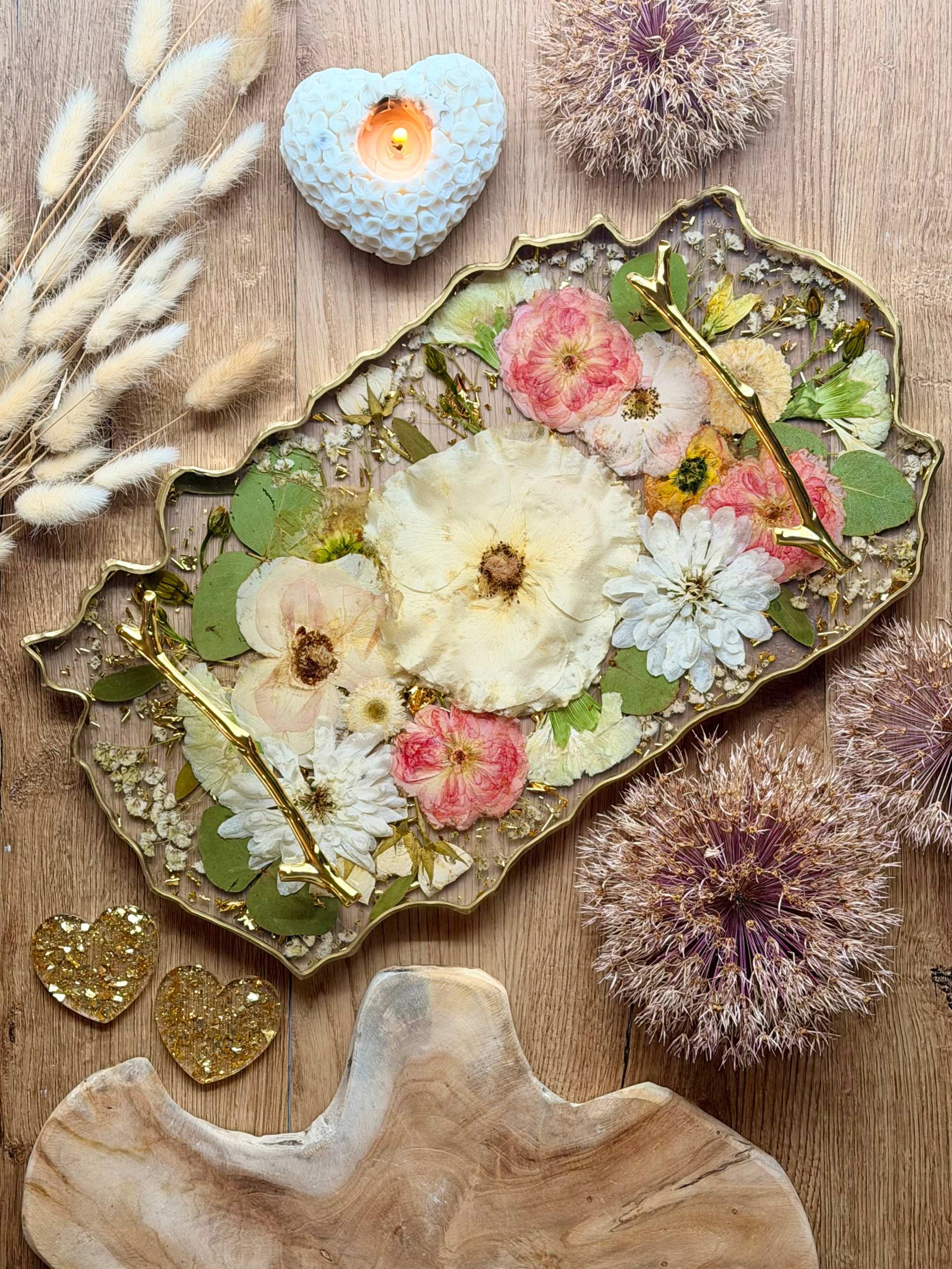 Die rechteckige Form wirkt modern, klar und zeitlos, ideal für jedes Interior. Gleichzeitig bietet sie viel Platz für die liebevolle Anordnung deiner gepressten Hochzeitsblumen. So entsteht ein Tablett, das nicht nur schön, sondern auch emotional wertvoll ist.