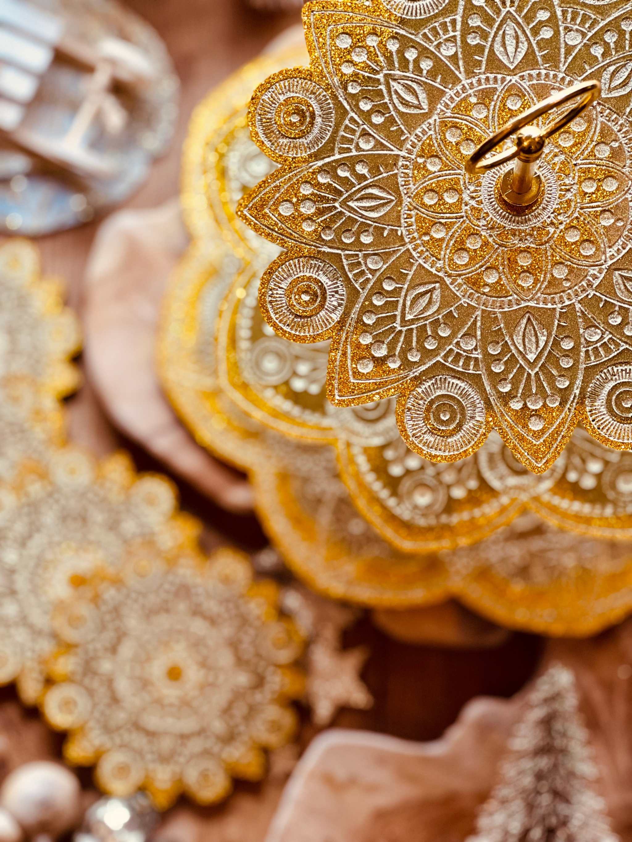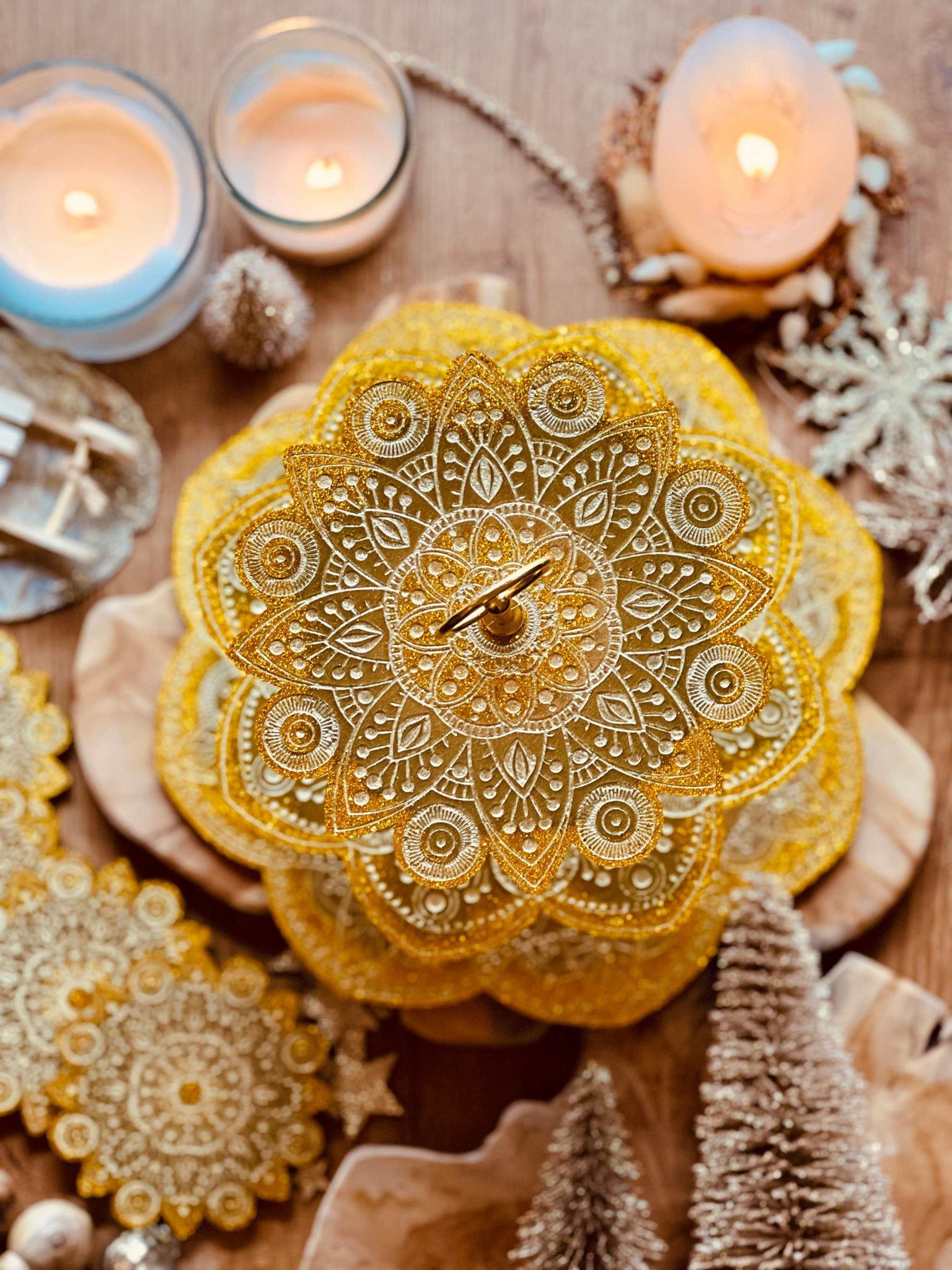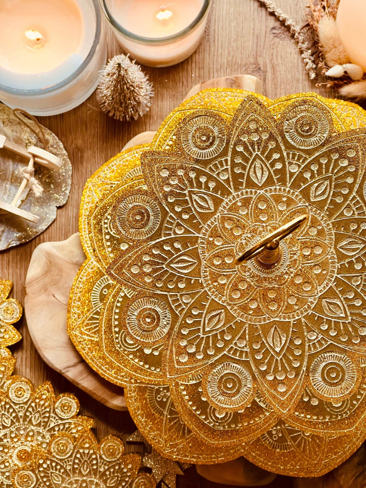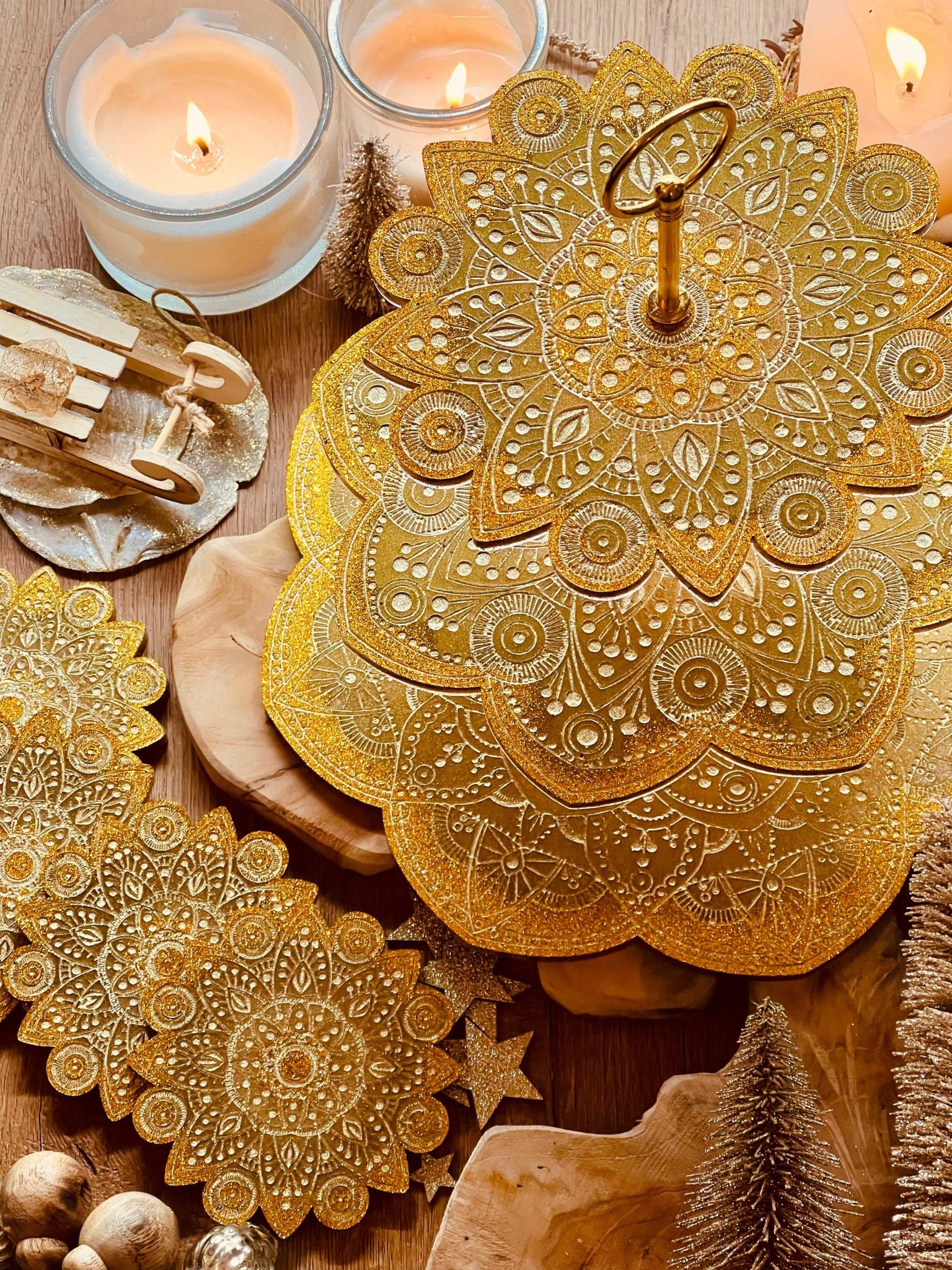 Deko Set mit Mandala Etagere und 4 Untersetzer aus Resin in Gold
