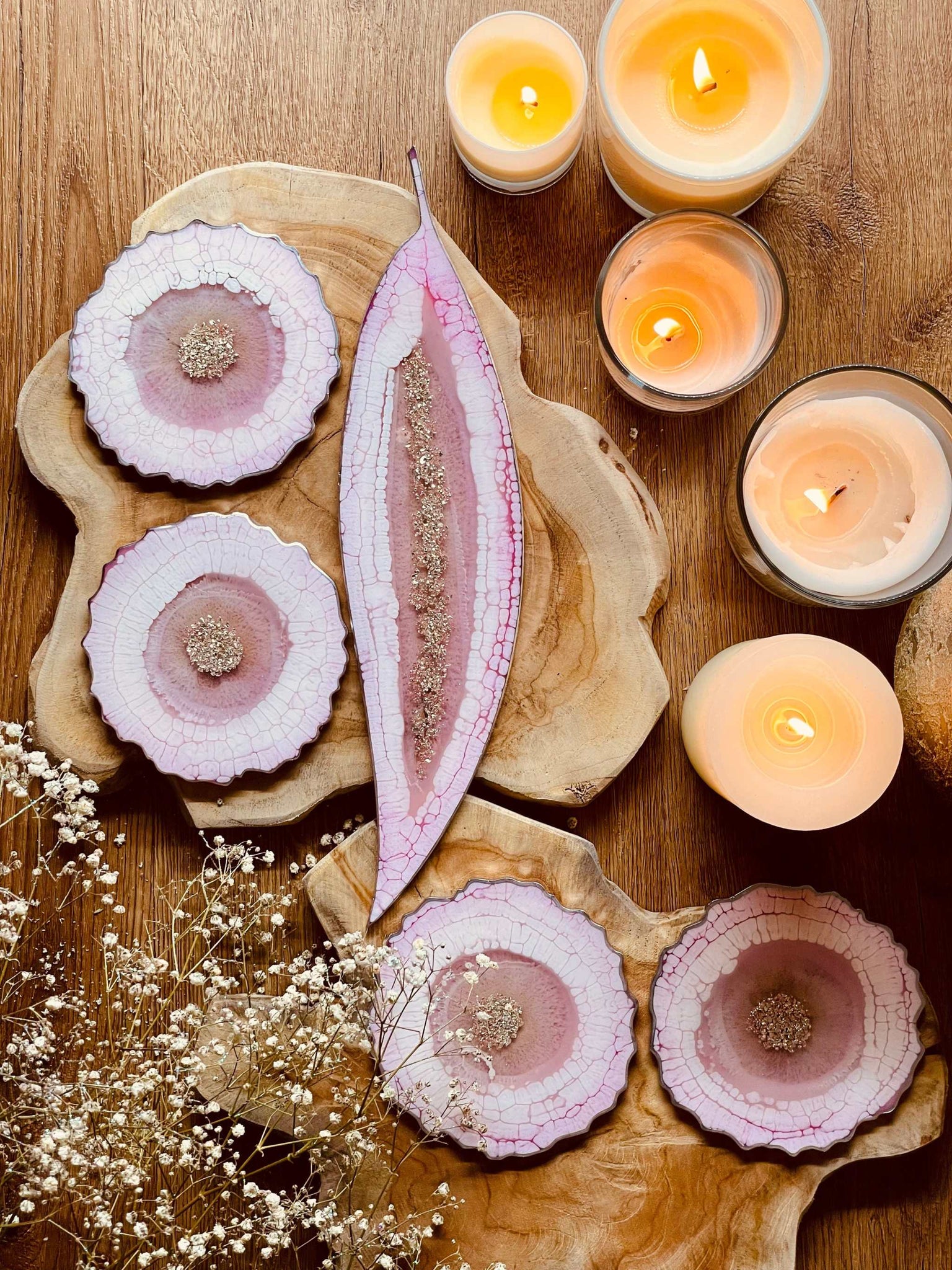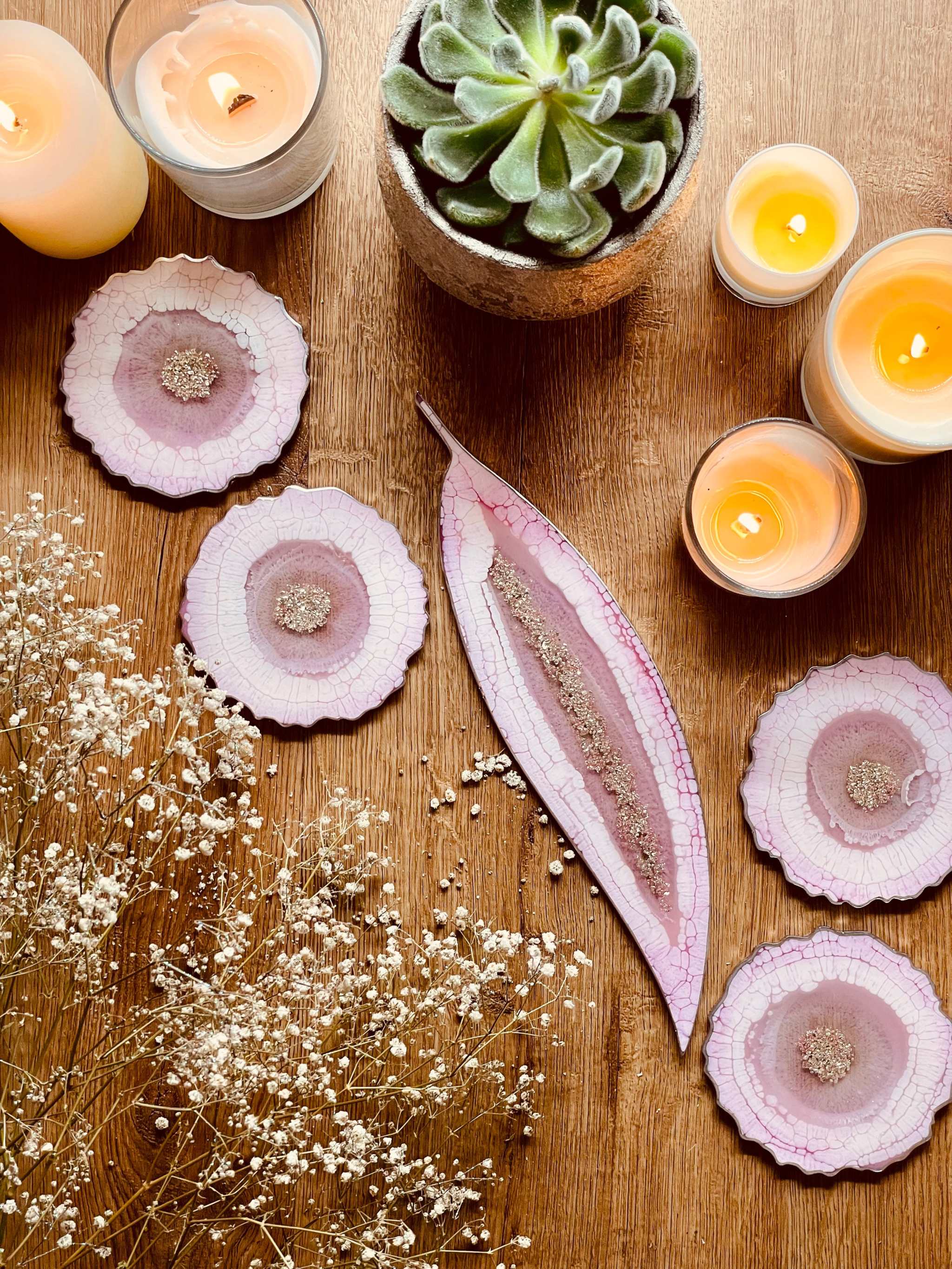 Tablett und 4 Untersetzer aus Resin in Rosa mit Silber im Leaf Design