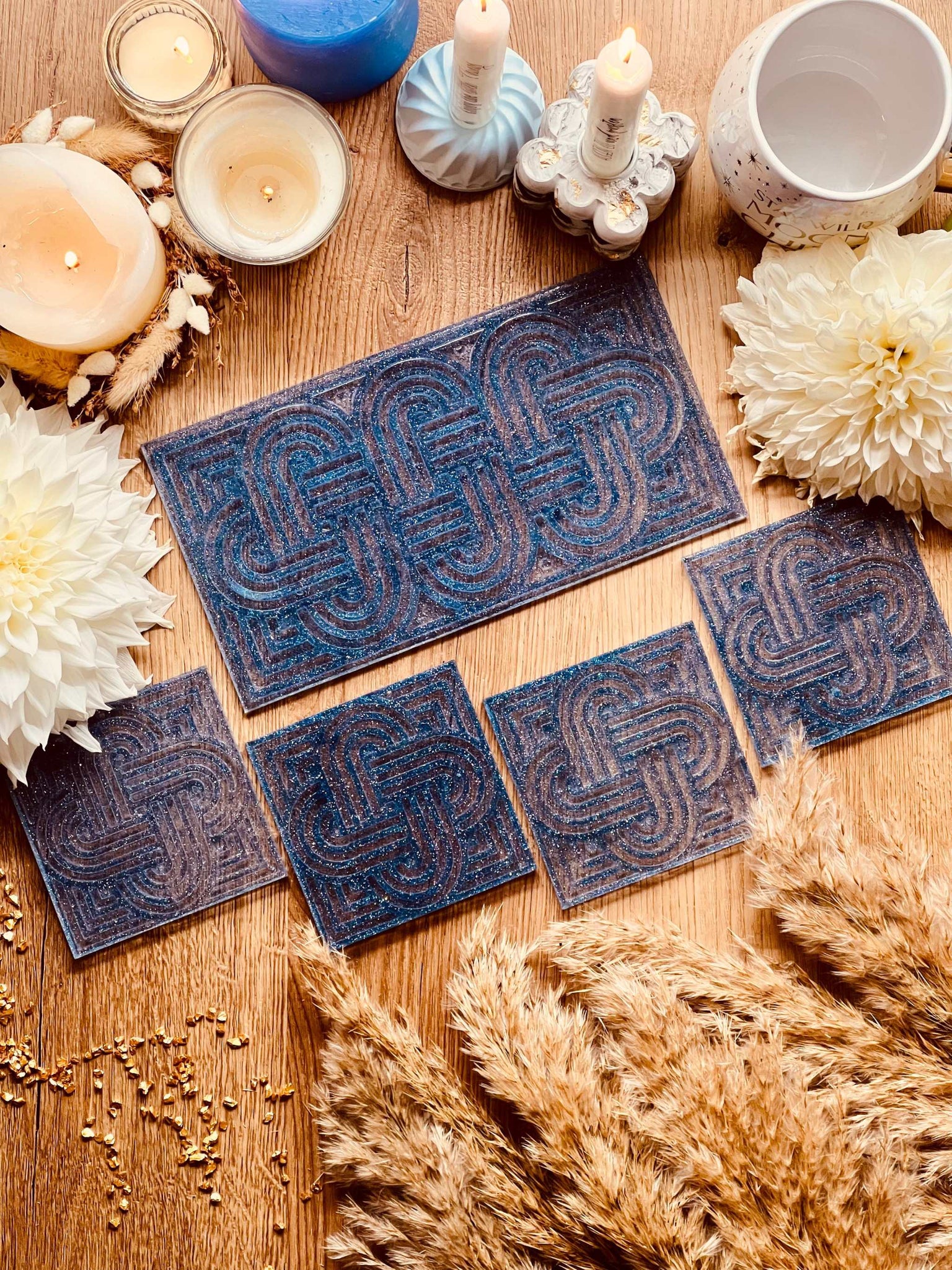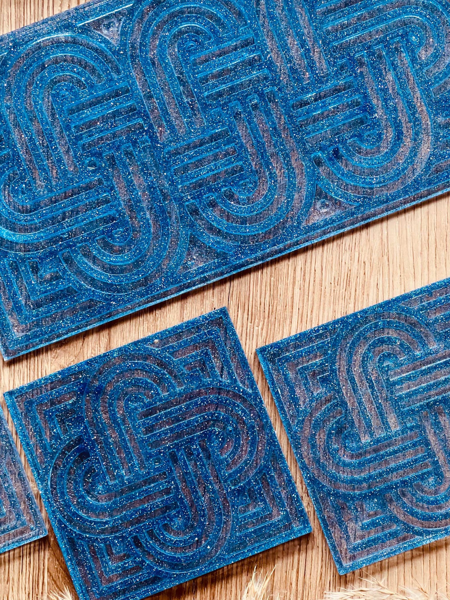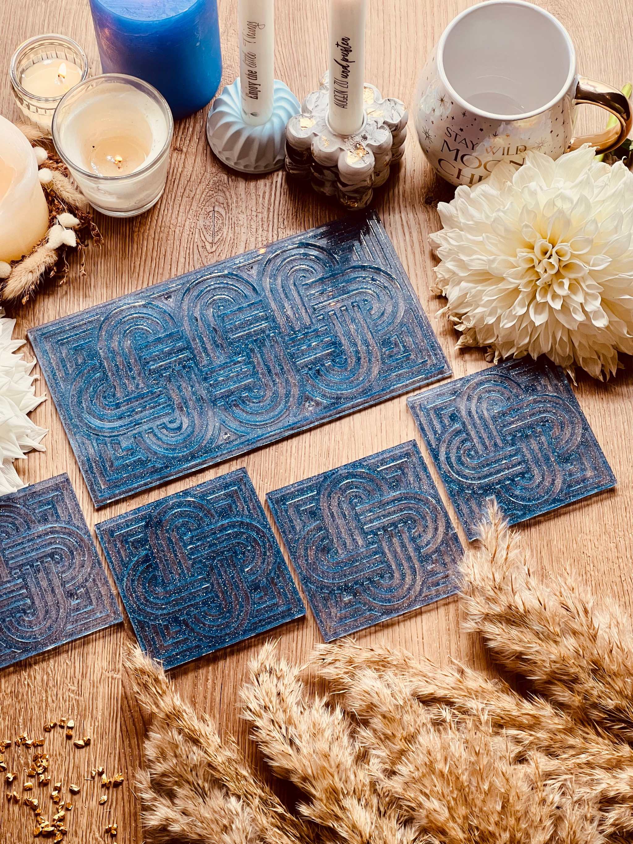 Tablett und 4 Untersetzer aus Resin in Blau mit Glitzer im Knot Design