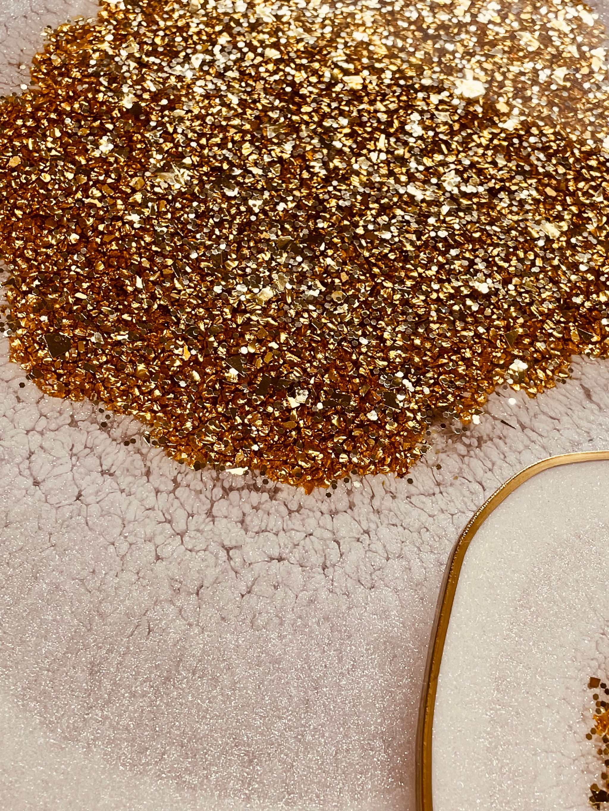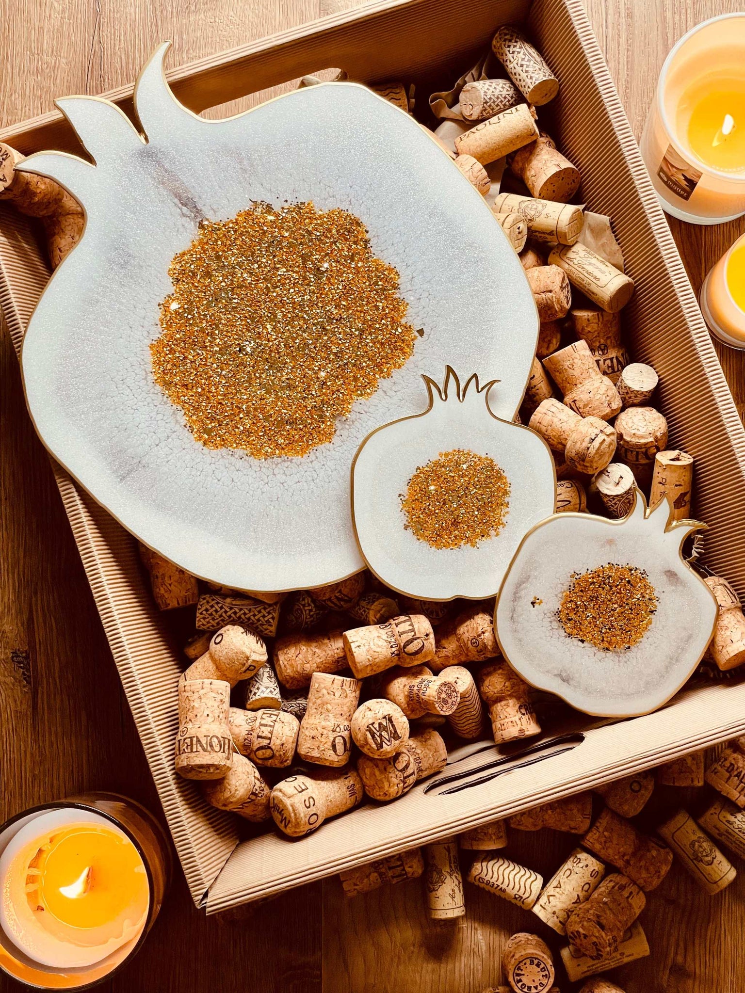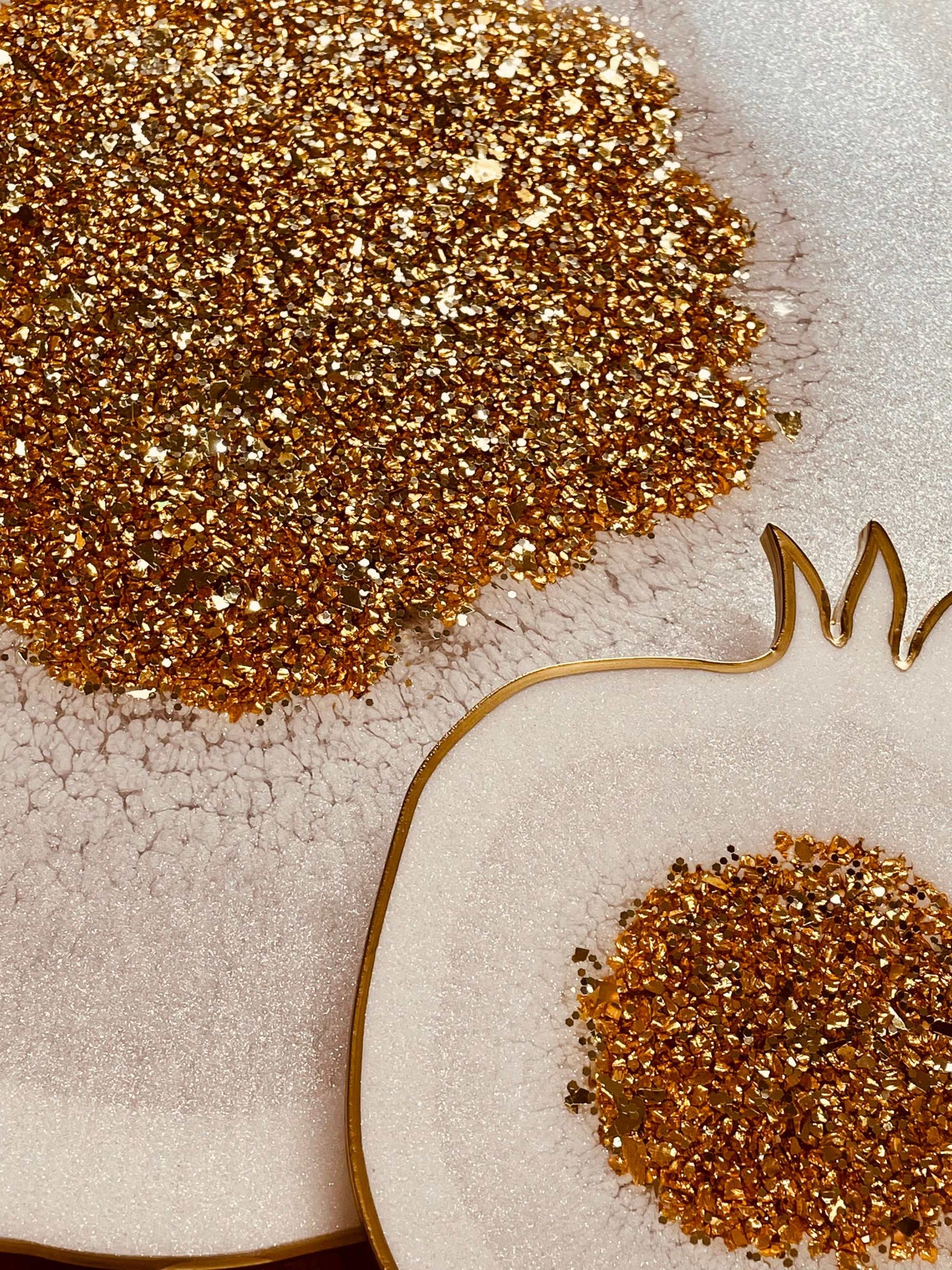 Tablett und 2 Untersetzer aus Resin in Weiß mit Gold im Granatapfel Design