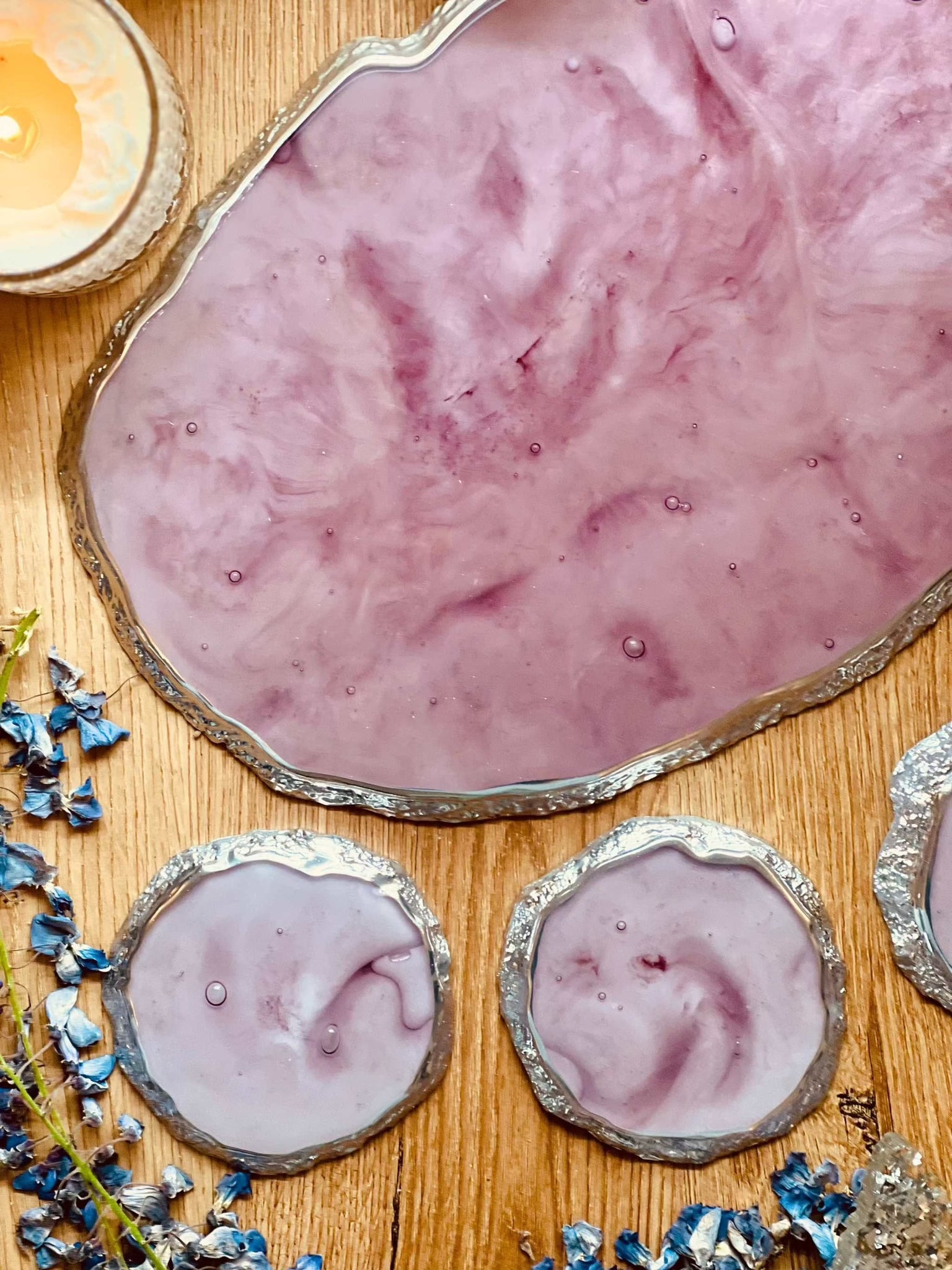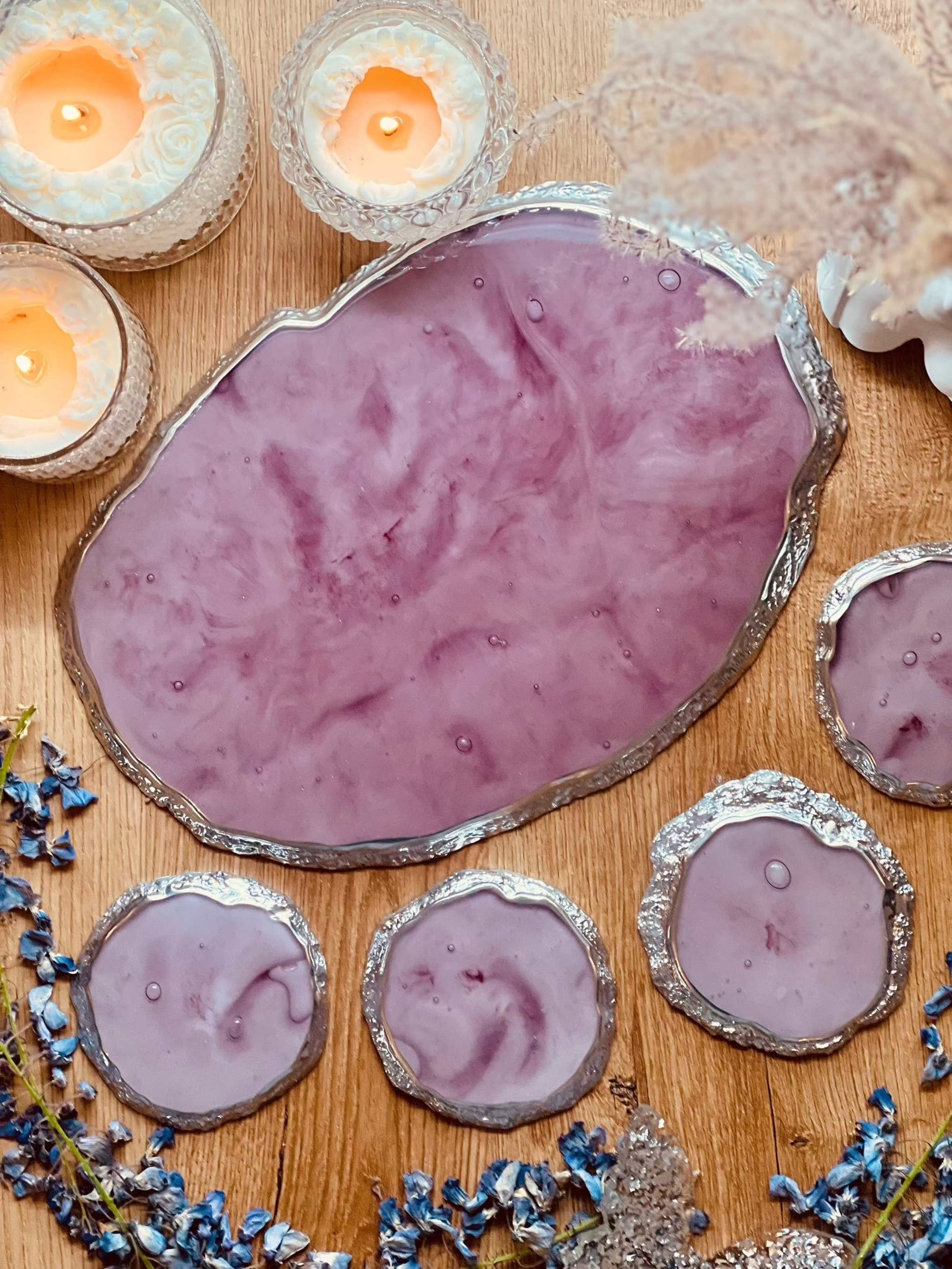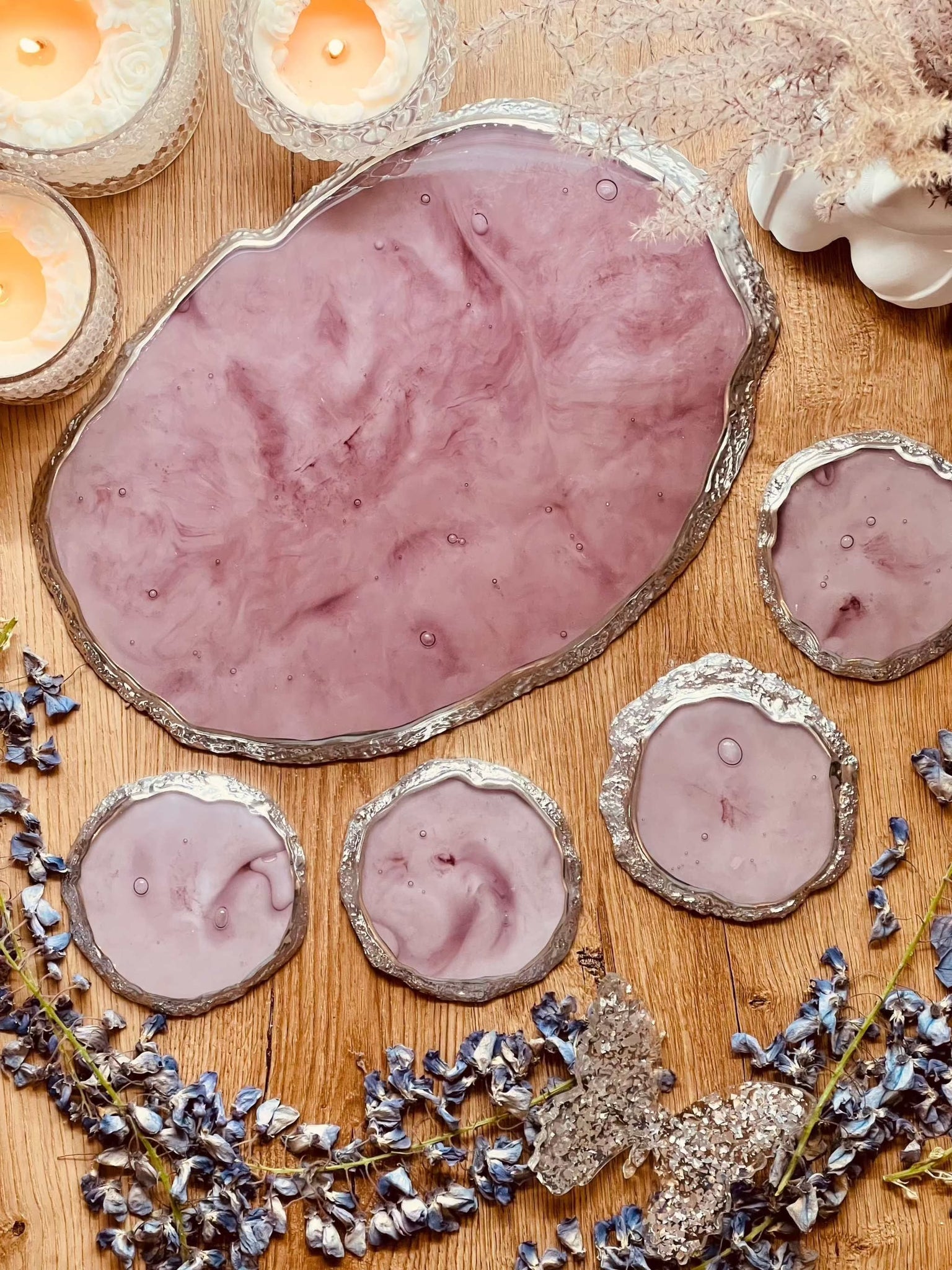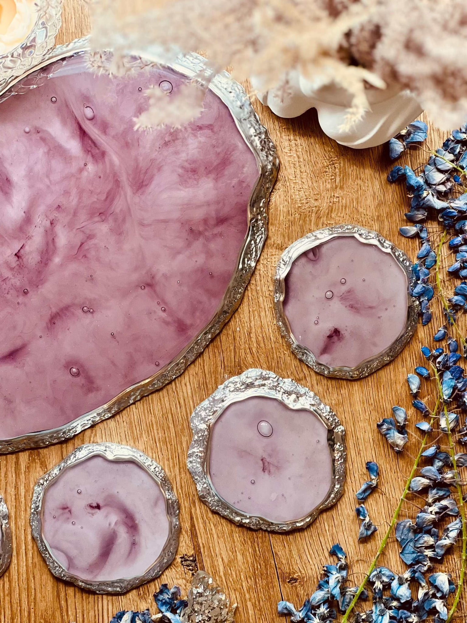 Tablett und 4 Untersetzer aus Resin in Pflaume mit Silber im Silk Design