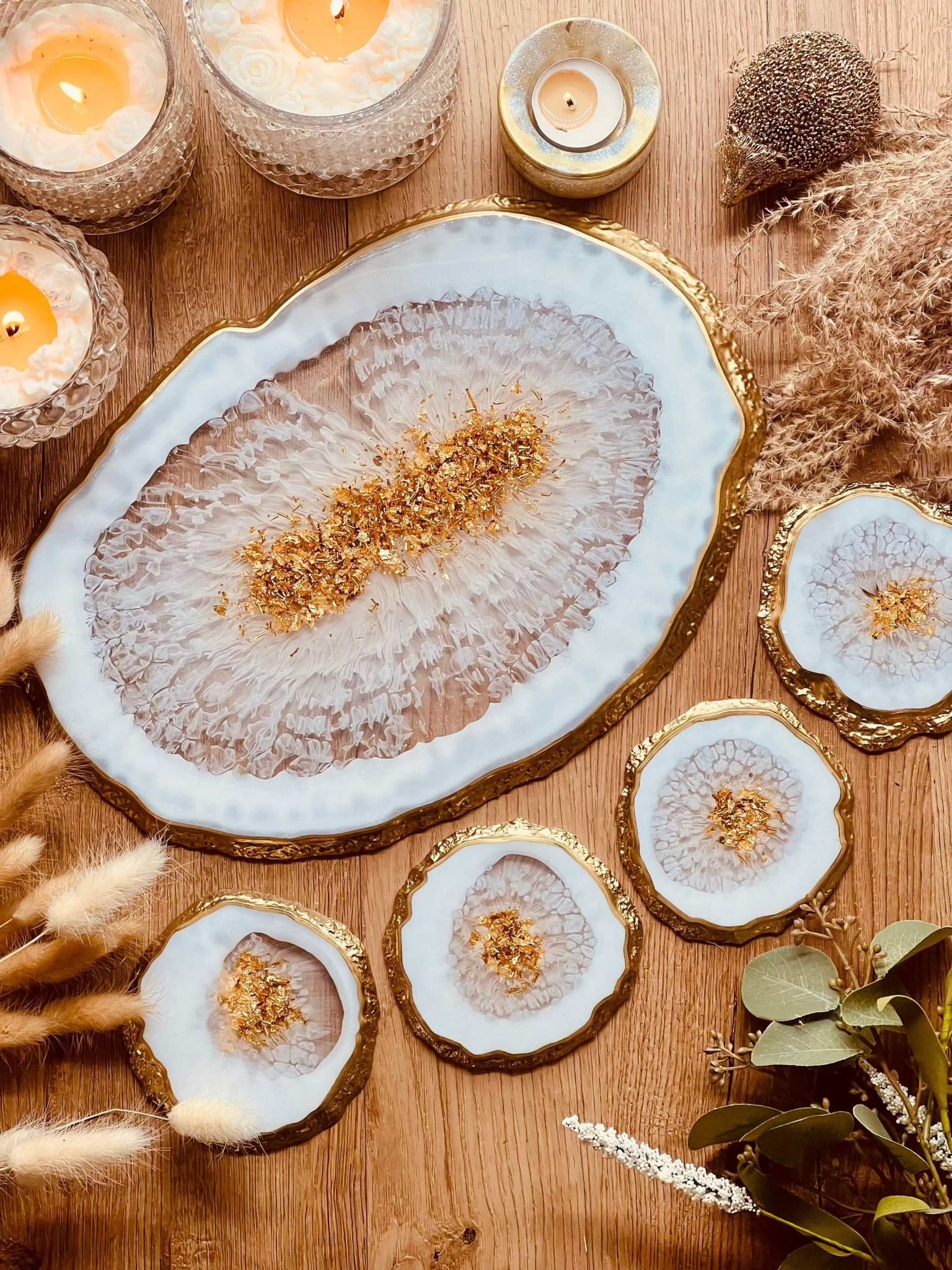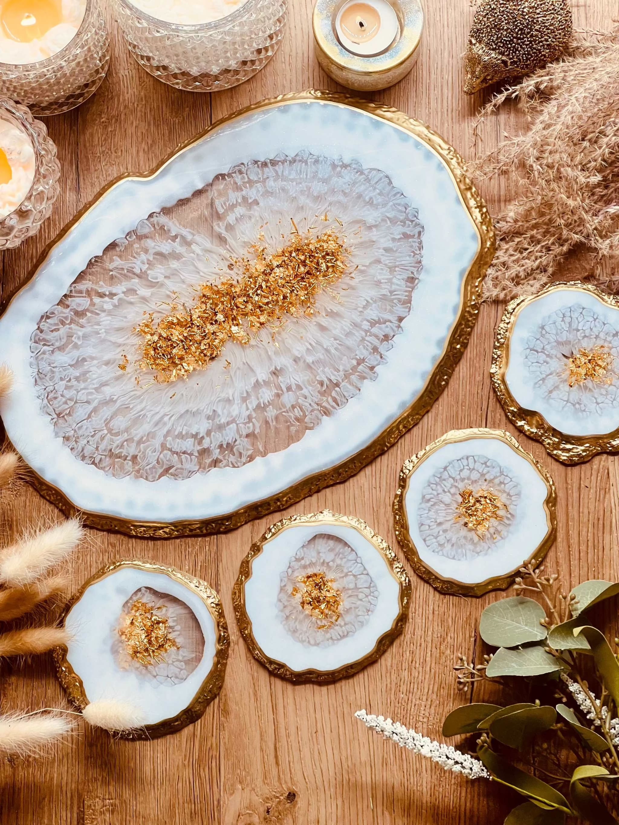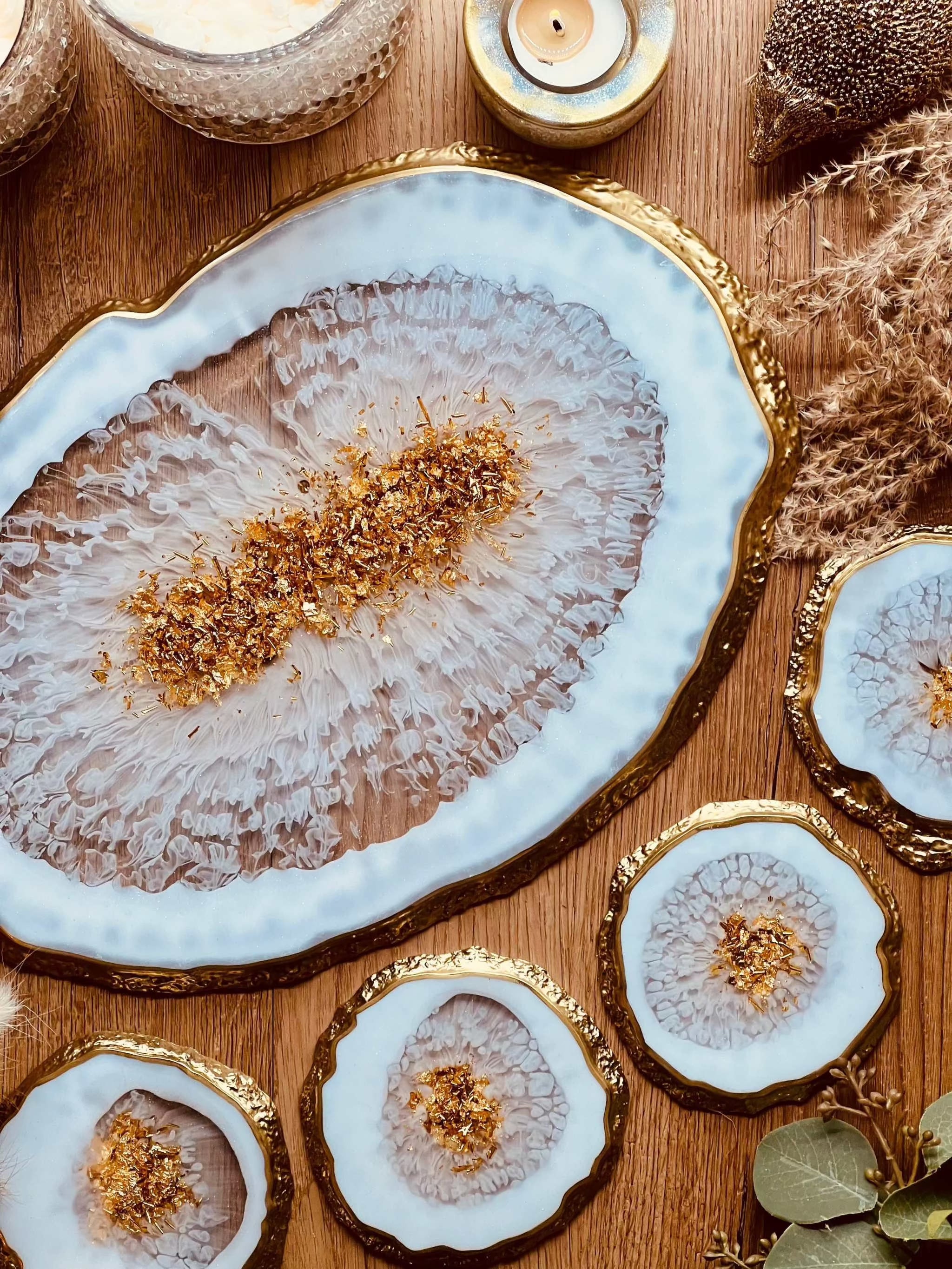 Tablett und 4 Untersetzer aus Resin in weiss mit Gold im Achat Design