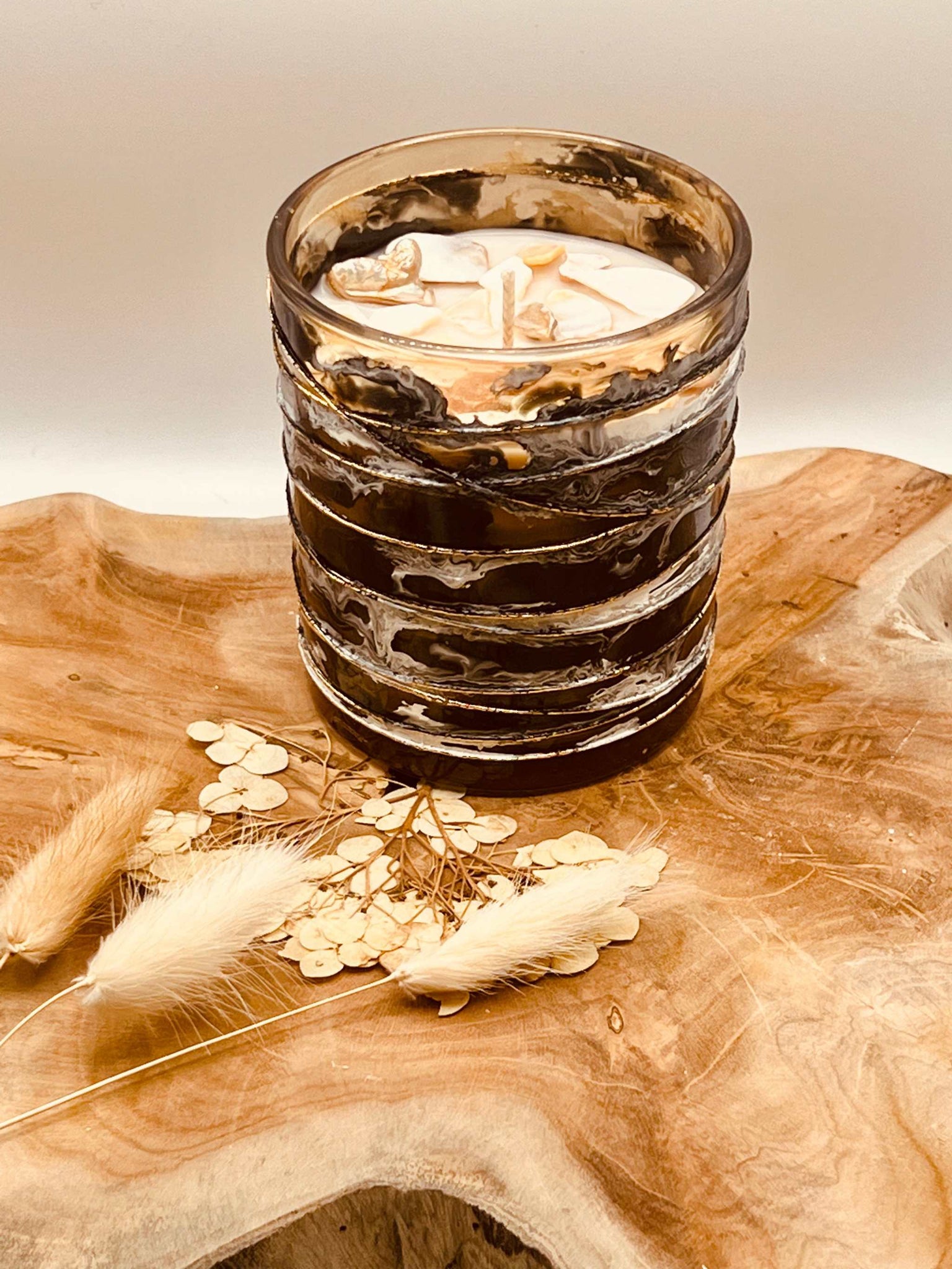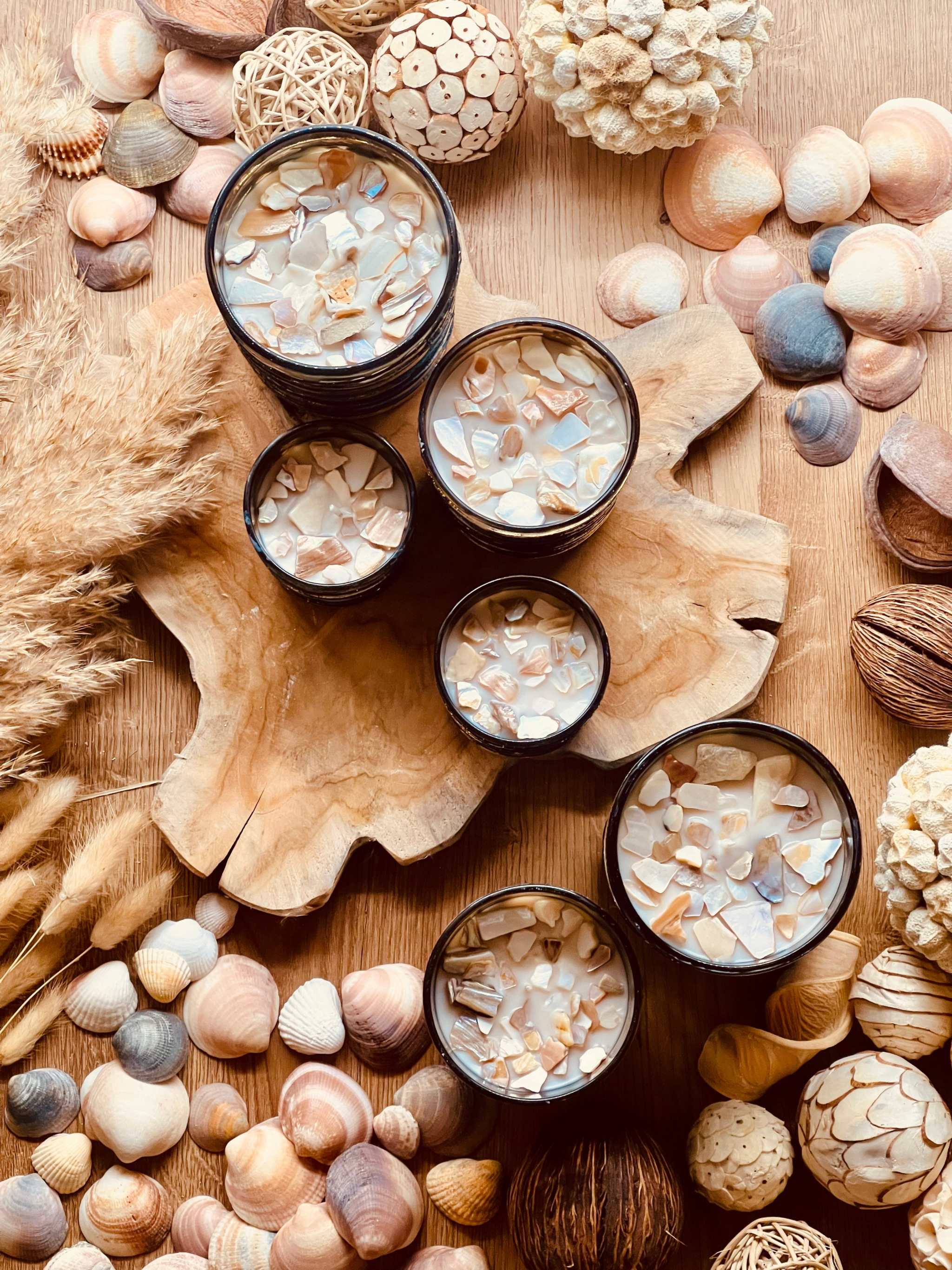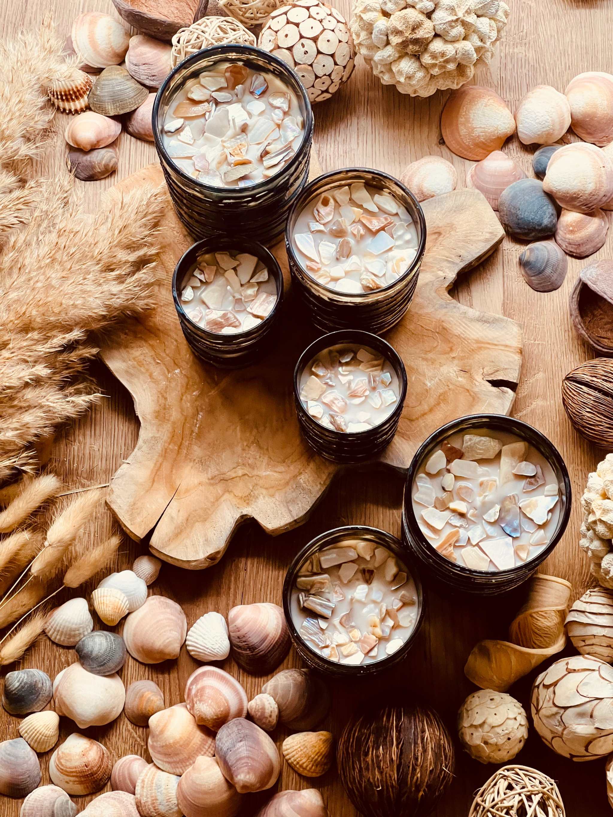 Kokosduft-Kerze in Designerglas, handgefertigt – ein luxuriöses Geschenk und tropisches Deko-Highlight mit Muscheldetails aus Perlmutt.