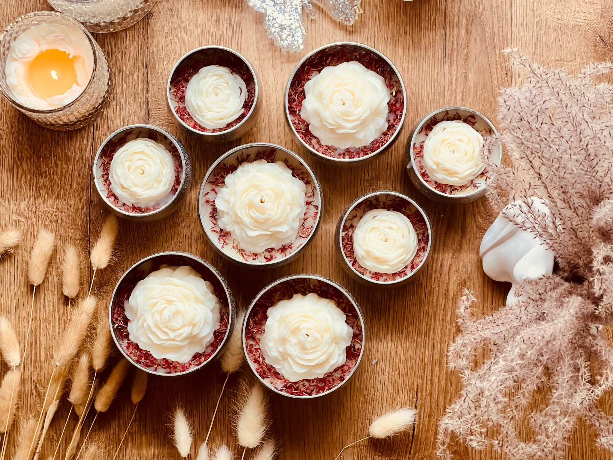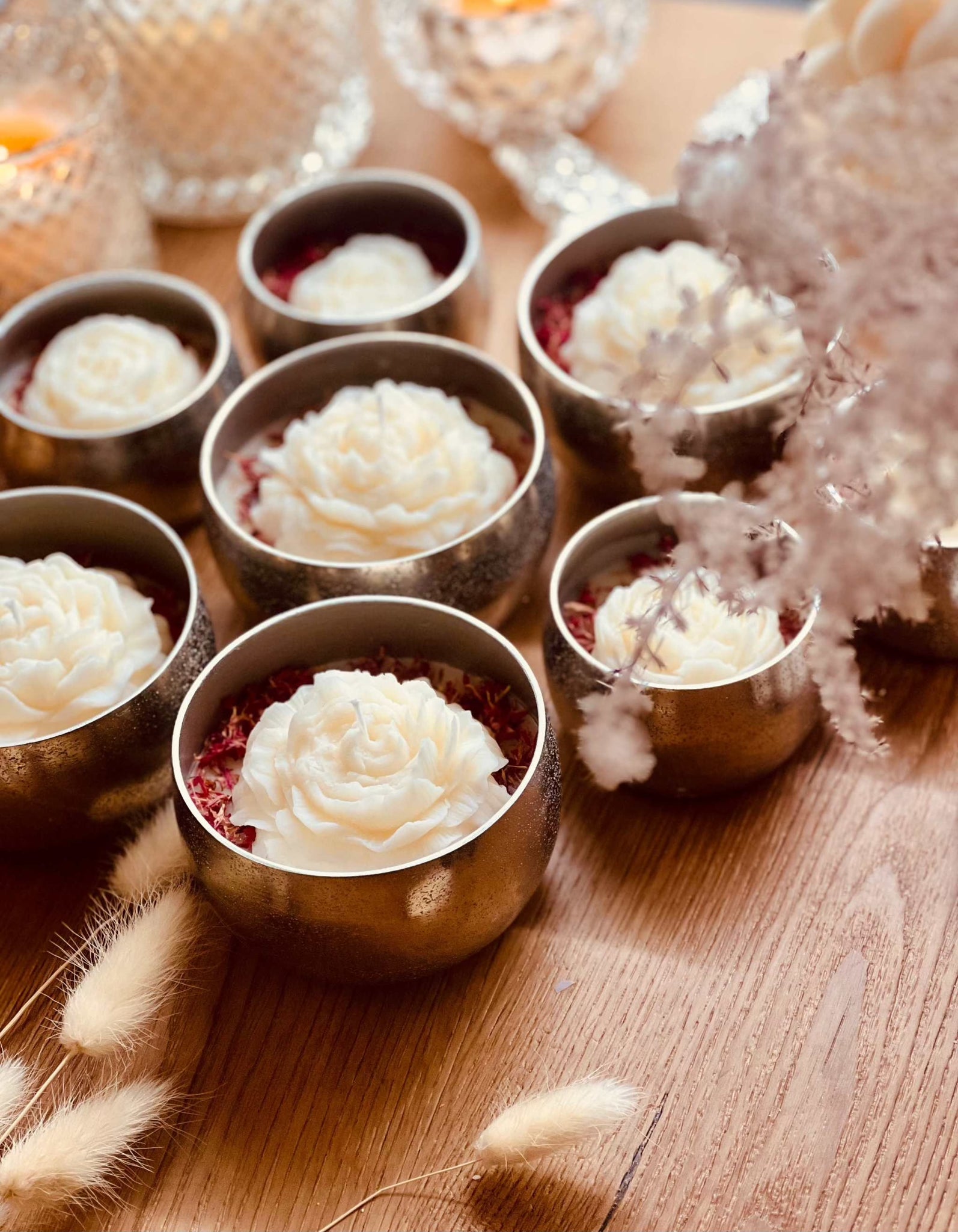Kerze im Glas mit Parfumduft und großer, detailreicher Wachsrose – ein elegantes Geschenk und dekorativer Hingucker.