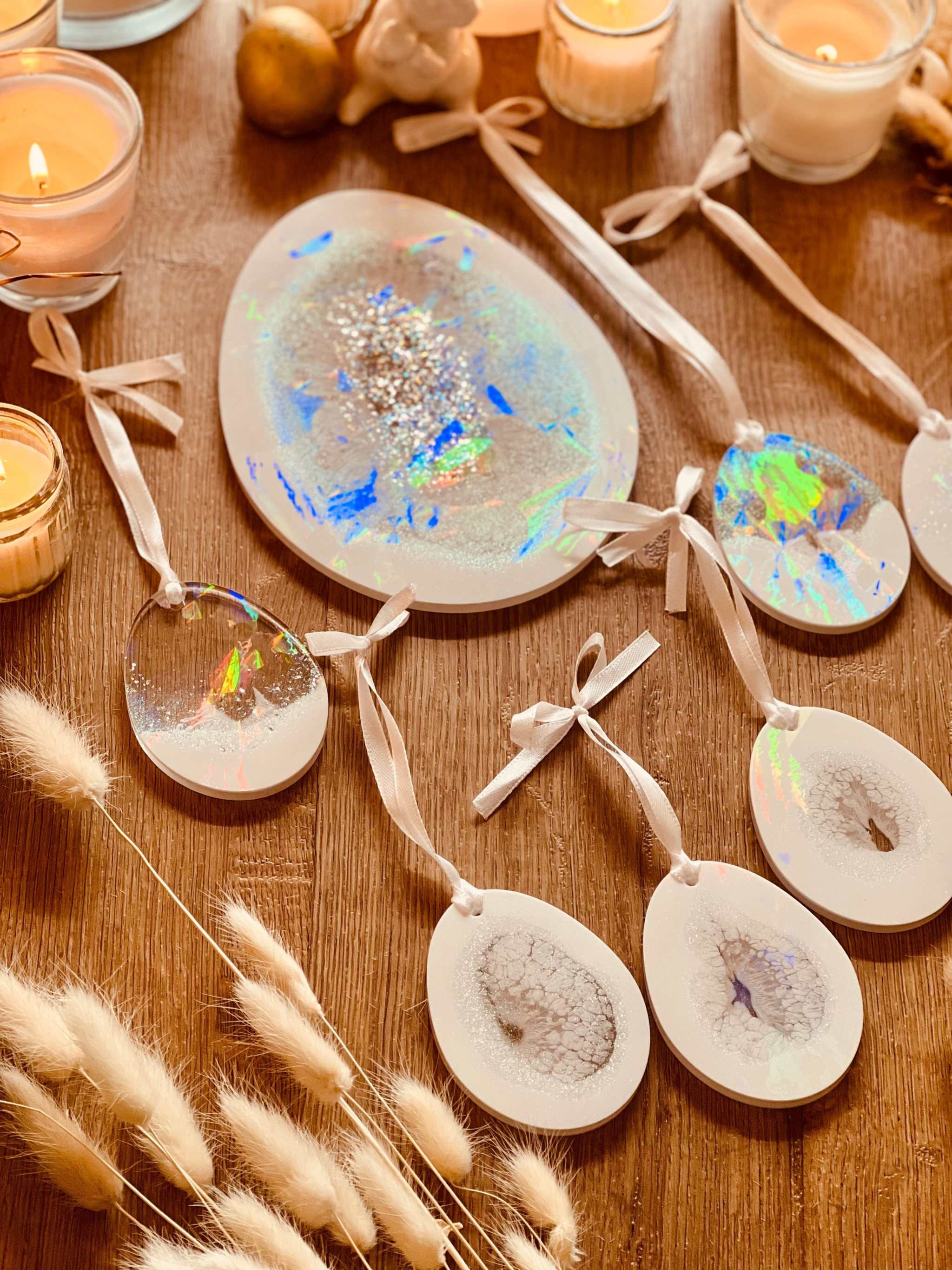 Mit diesen Ostereier Anhängern aus Resin wird deine Oster Deko zu einem funkelnden Highlight. Die glänzenden Details und die moderne Farbgebung machen sie zur perfekten Dekoration für dein Osterfest. Ob als stilvolle Tischdeko, im Osterstrauch oder als exklusives Geschenk – diese Ostereier sorgen für ein festliches Ambiente in deinem Zuhause.