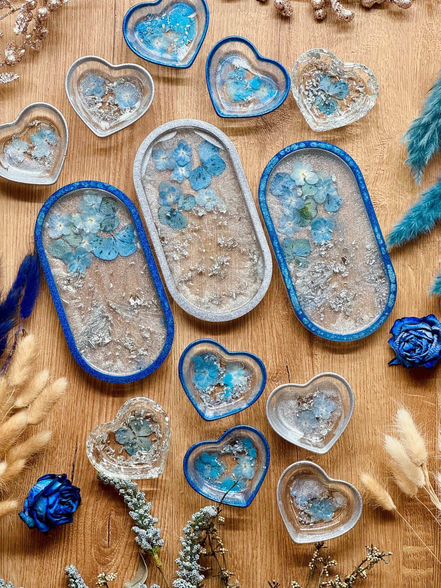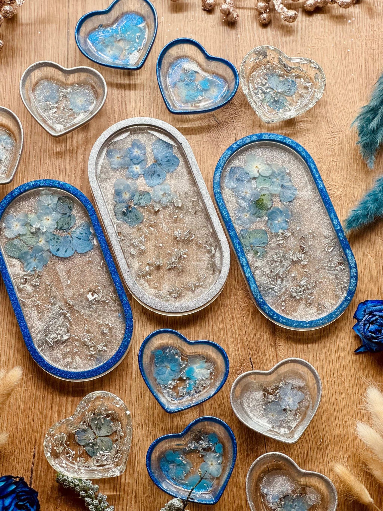 Schmuckschalen aus Resin in Blau mit Silber und Blumen