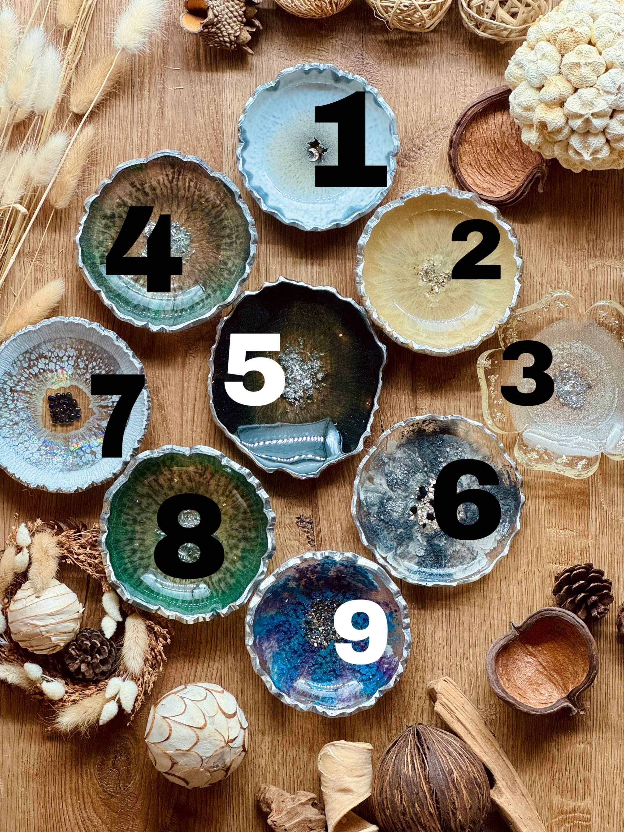 Handgemachte Schmuck- oder Ringschalen aus Resin in verschiedenen Farben mit silbernen Details. Alle meine Artikel sind einzigartige Unikate. Schmuckschalen sind die perfekte Dekoration in jedem Bade-oder Schlafzimmer und ein individuelles Geschenk für deine Liebsten.