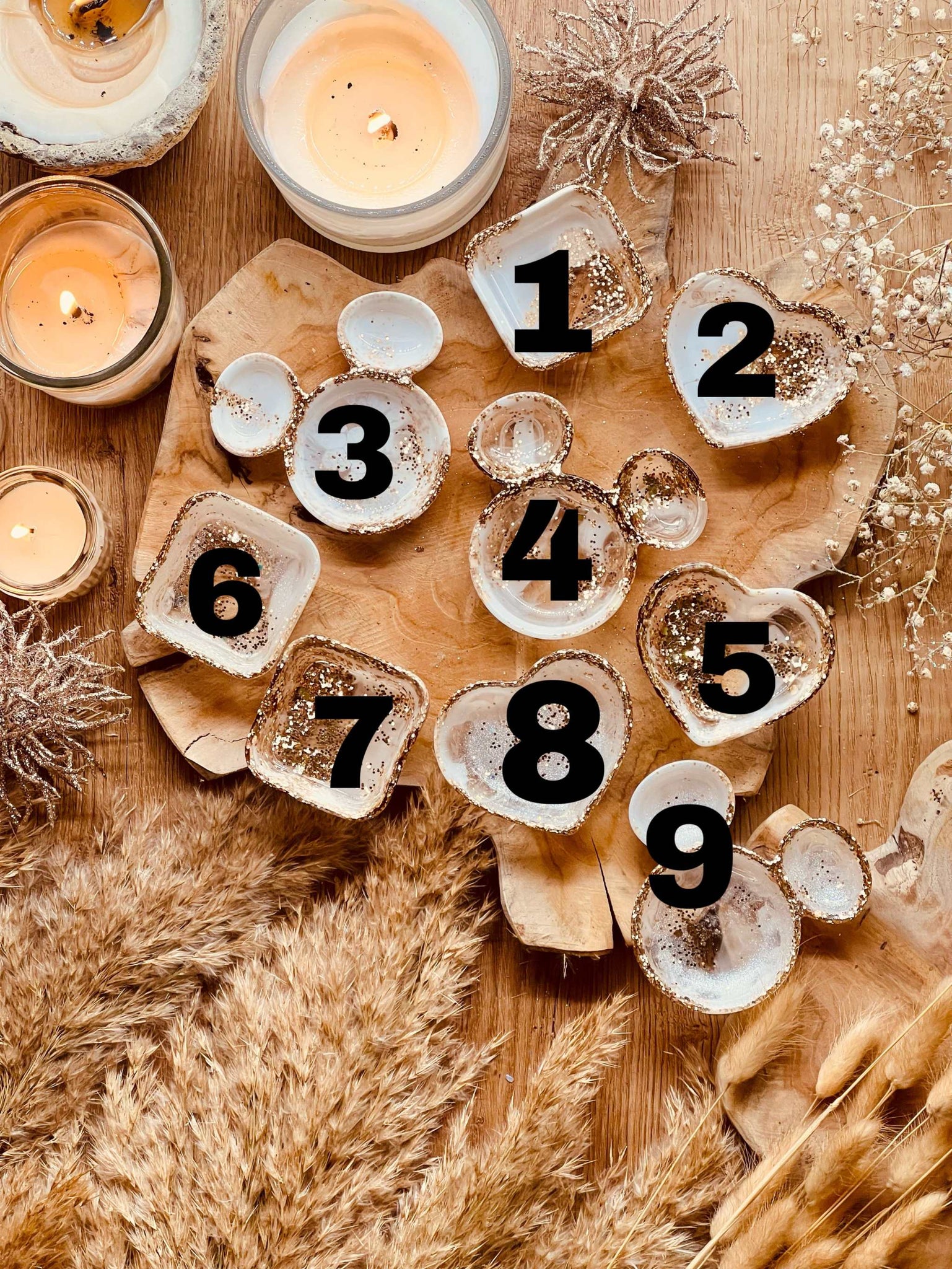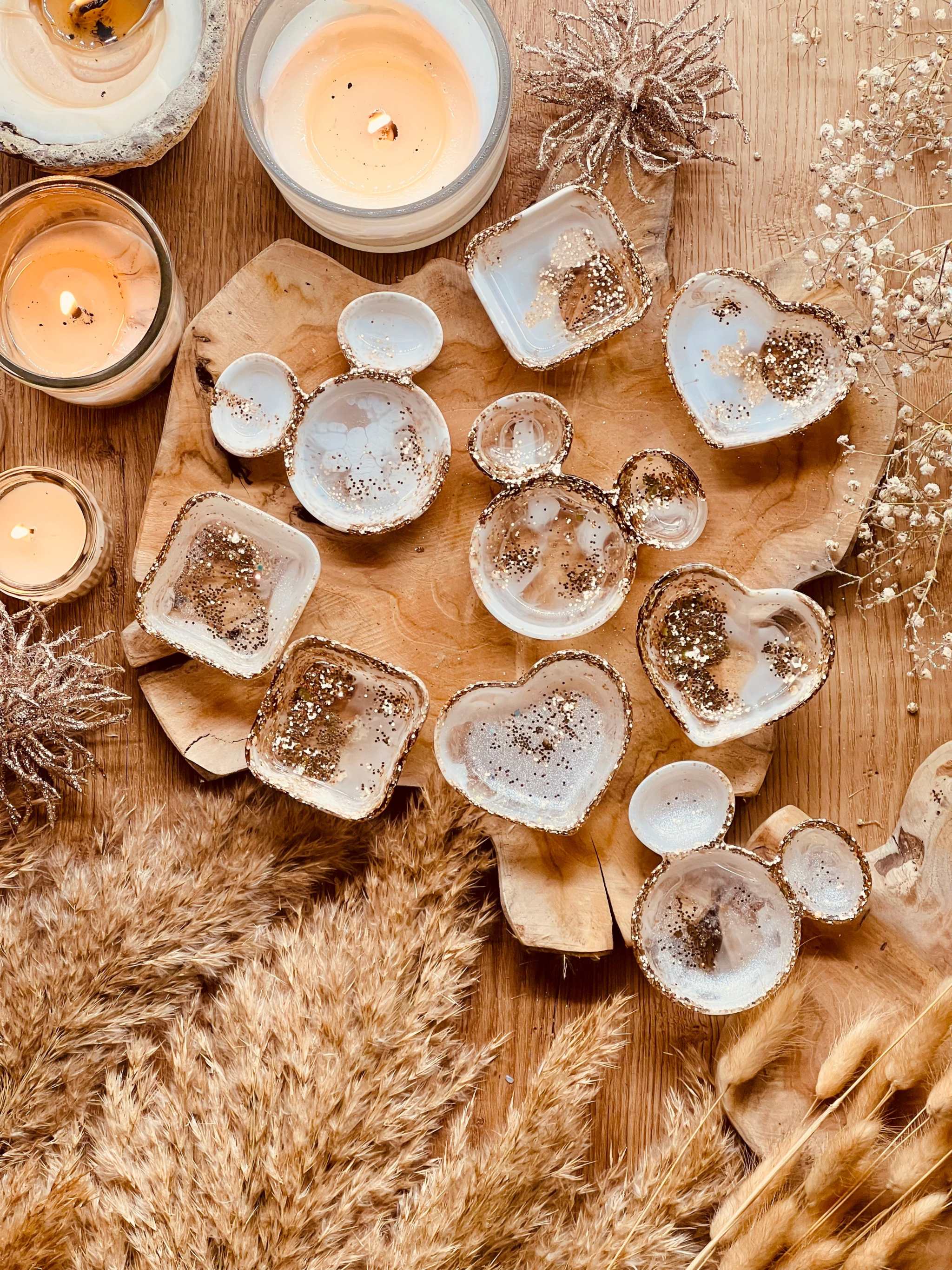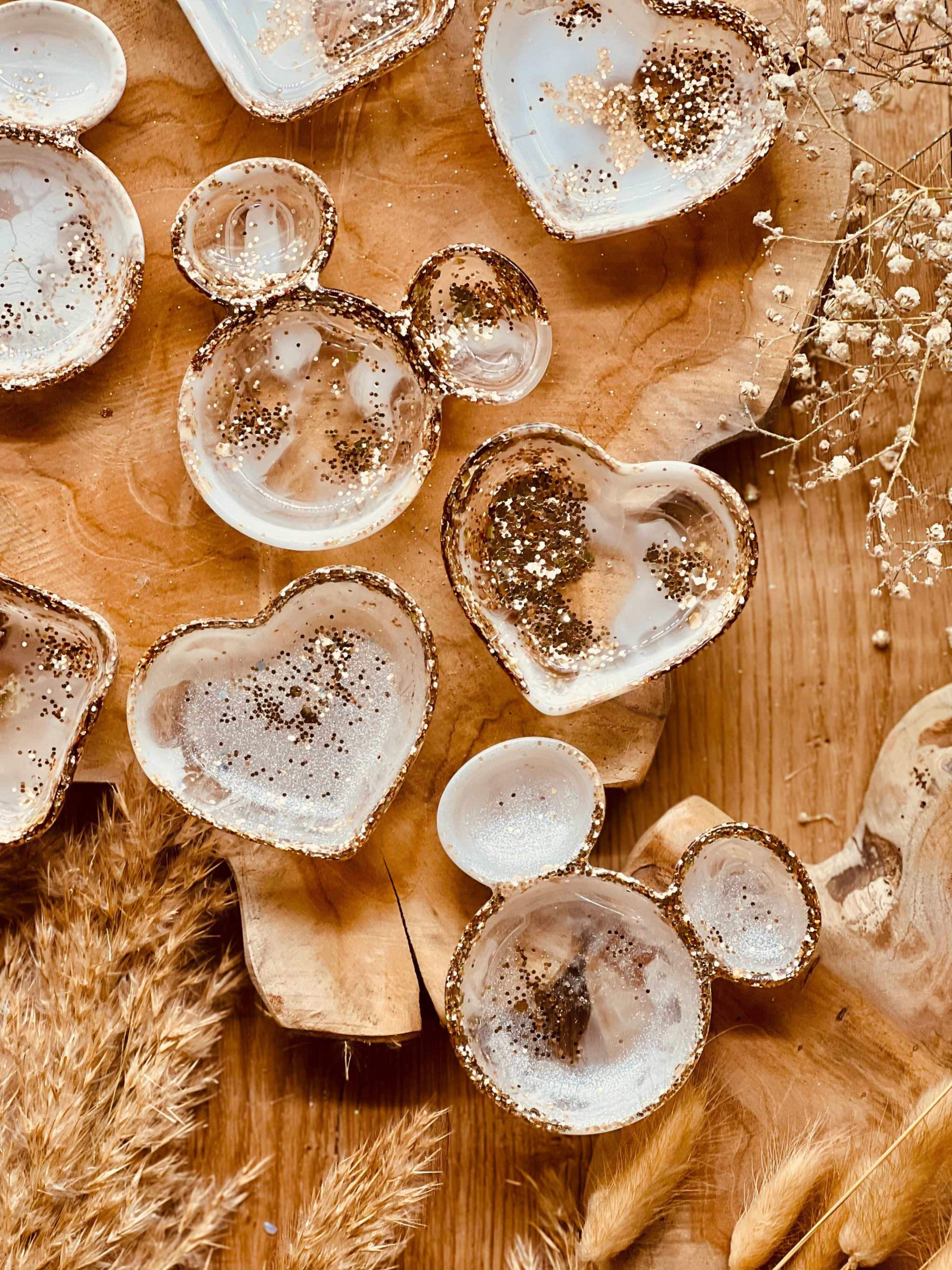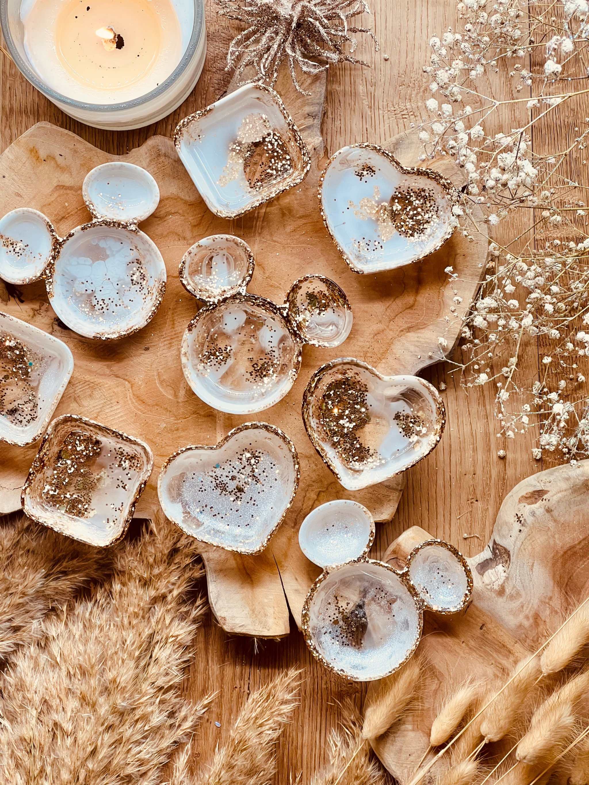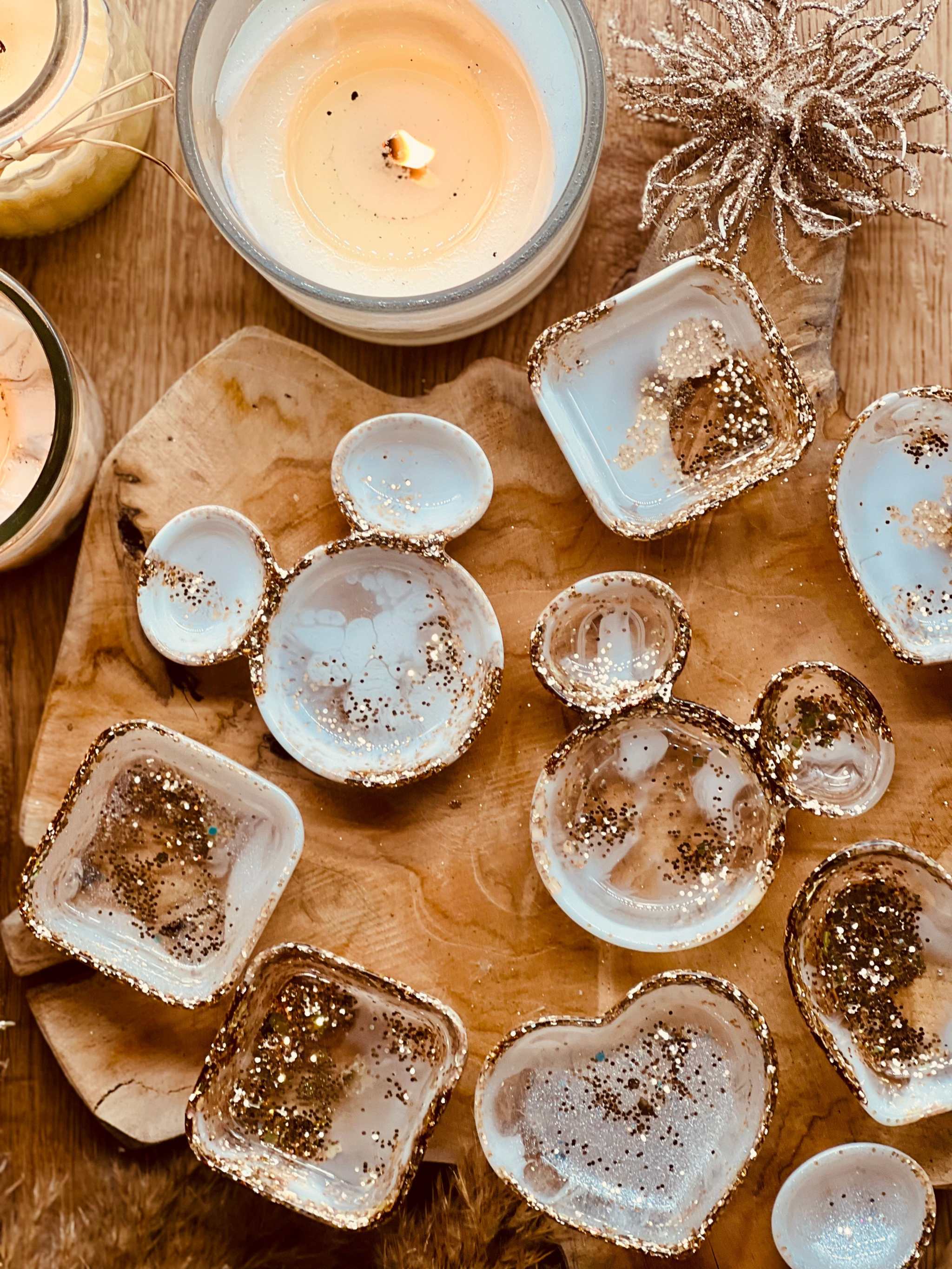 Schmuckschalen aus Resin in Weiss mit Gold in verschiedenen Formen