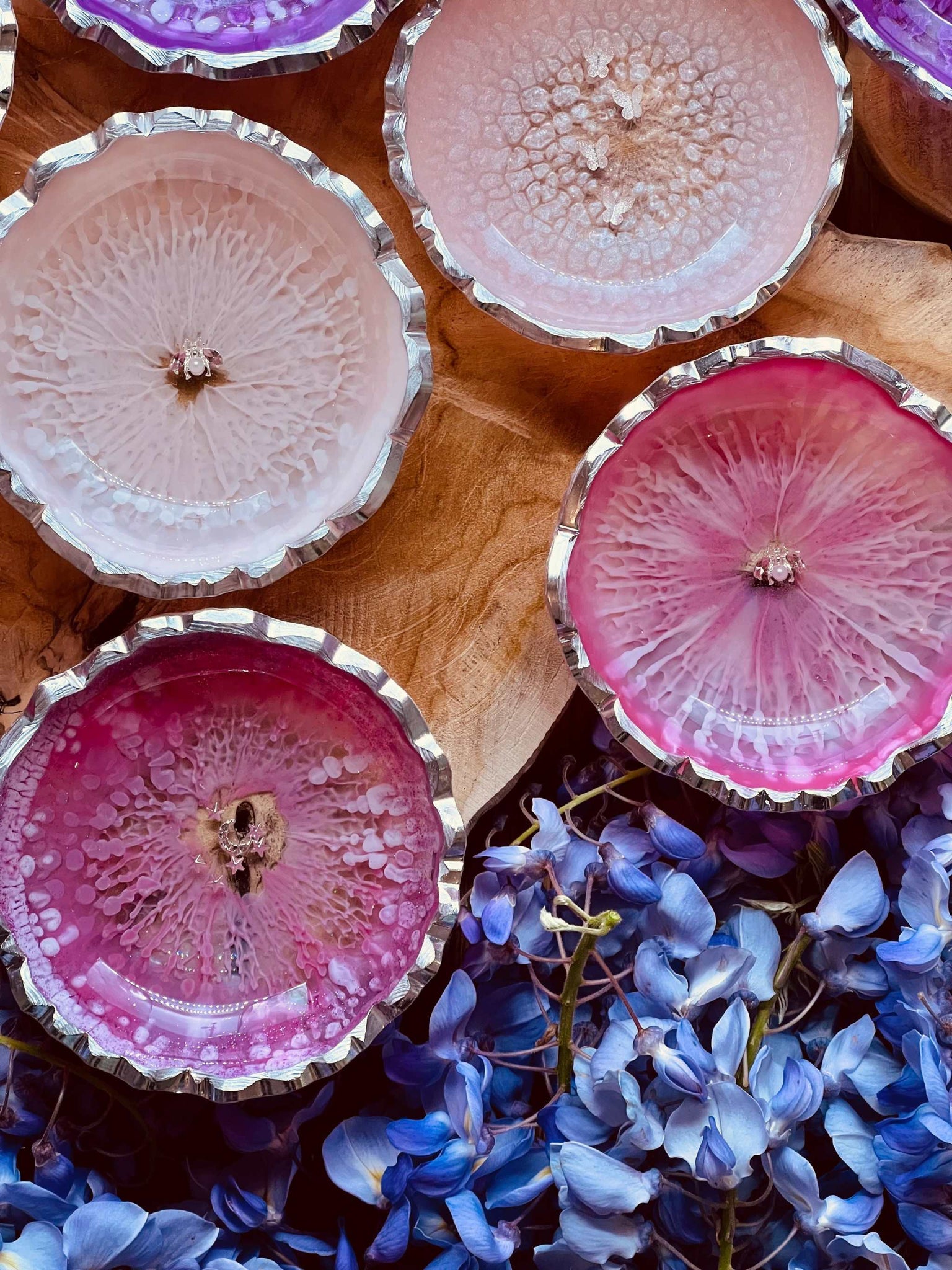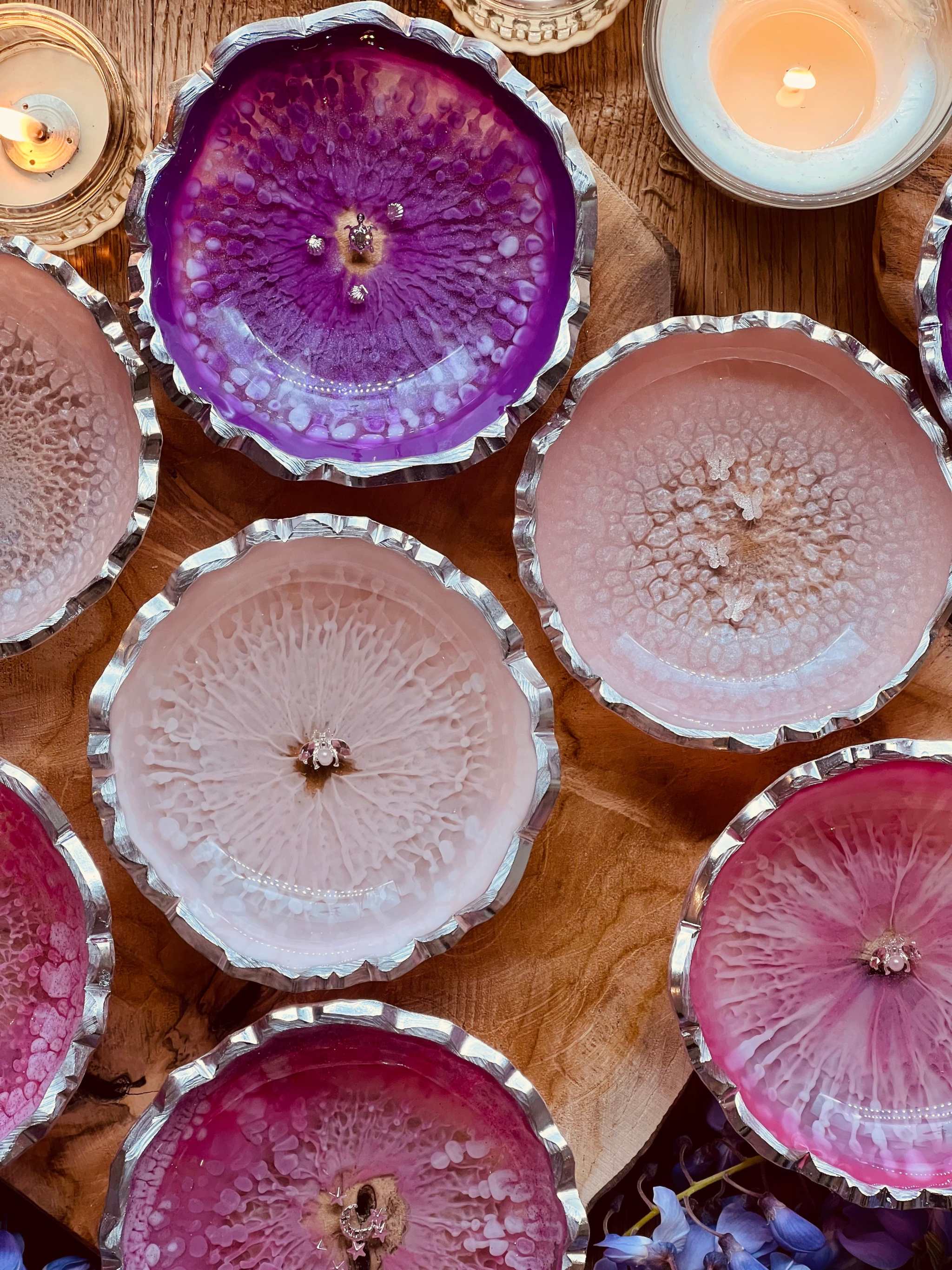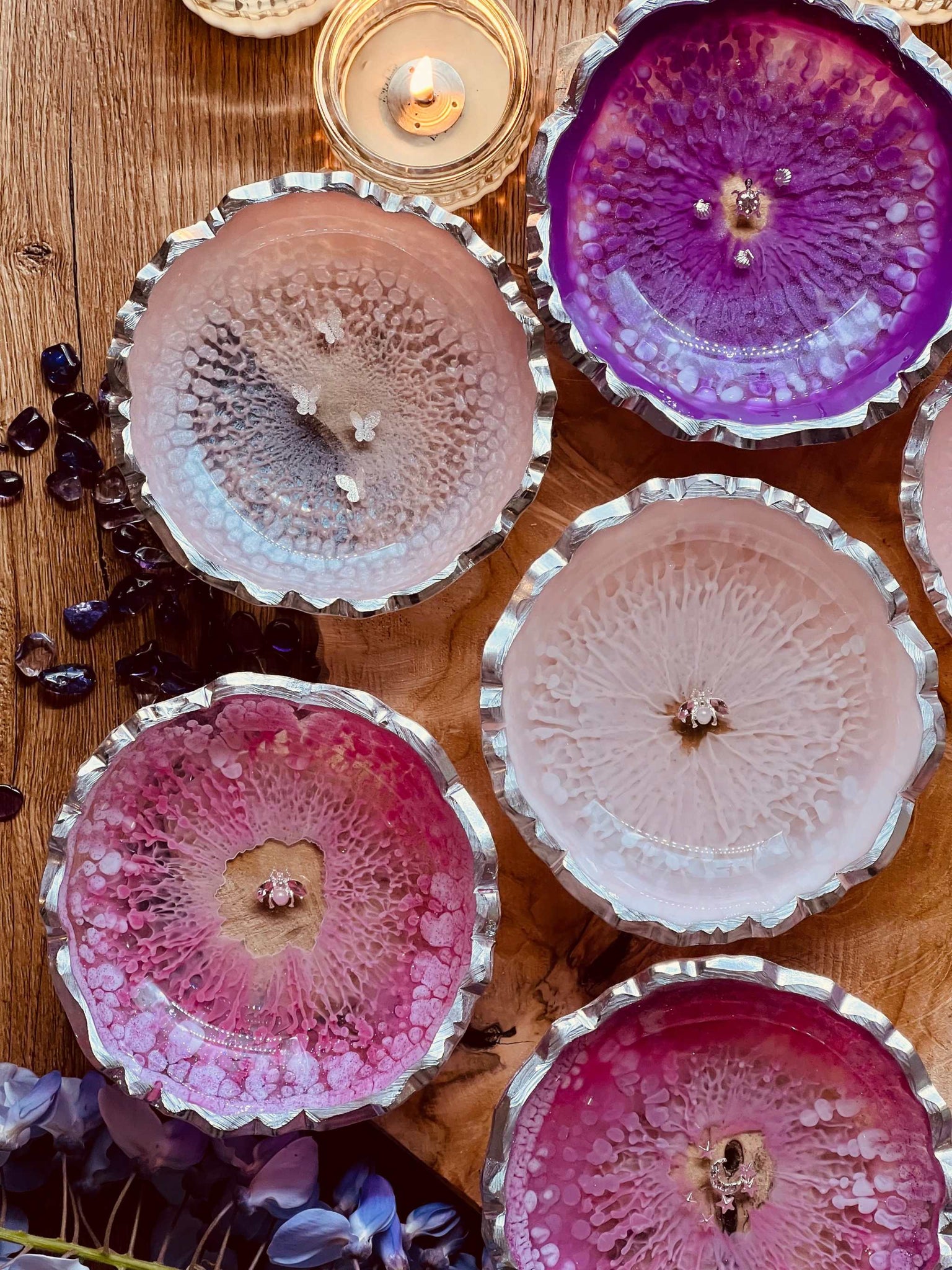 Schmuckschalen aus Resin in Pinktönen mit Silber