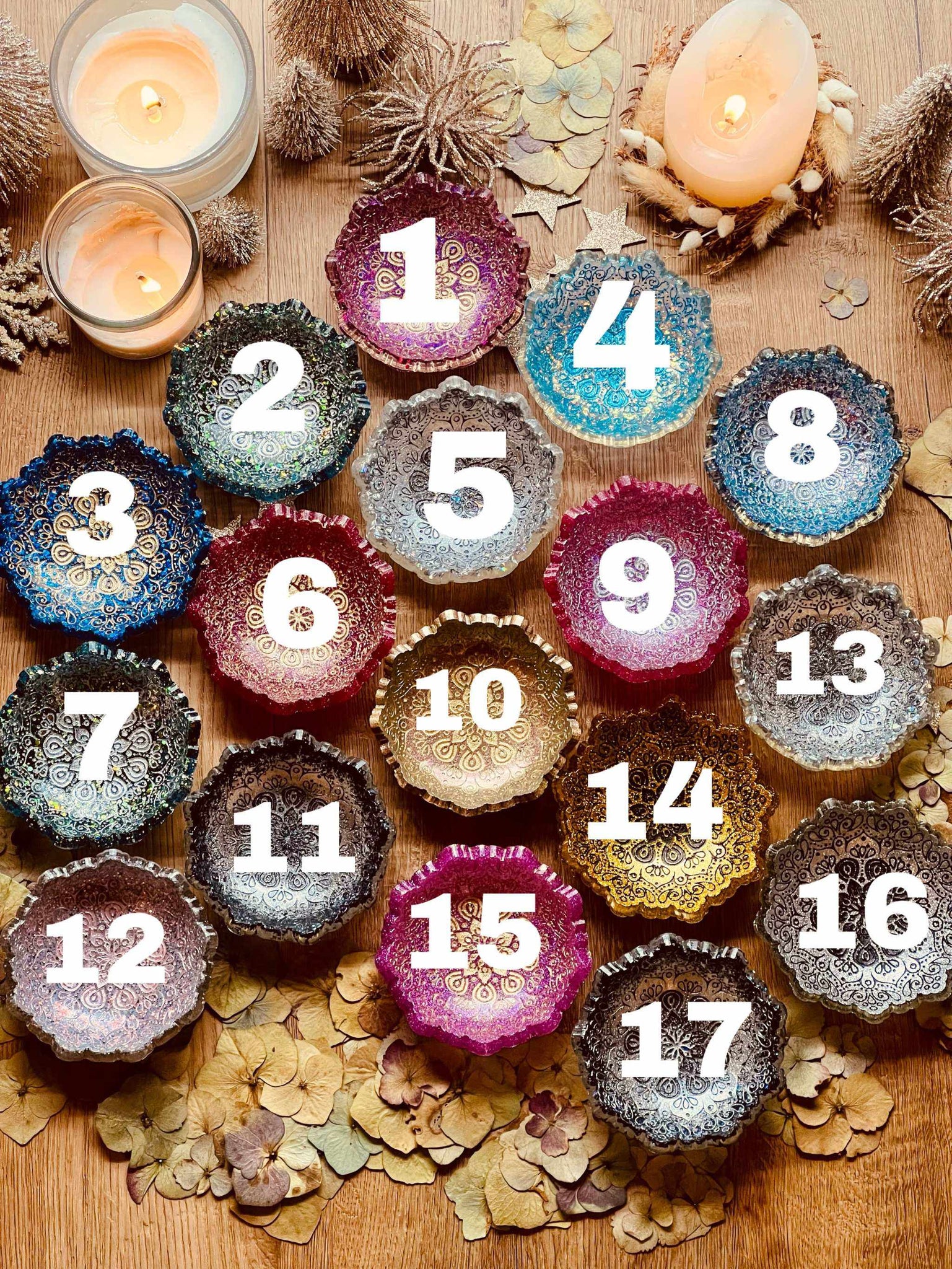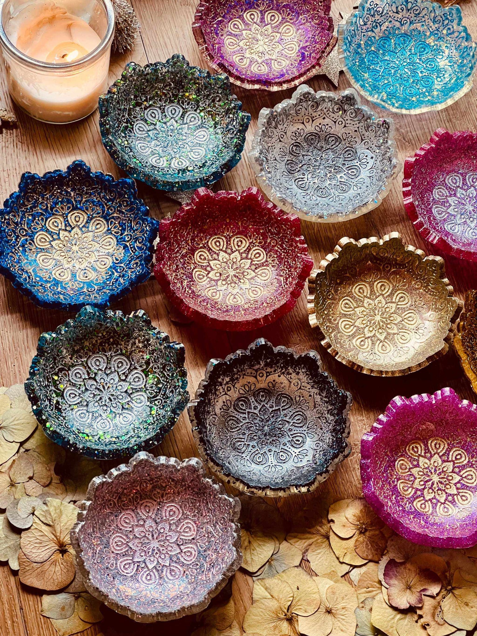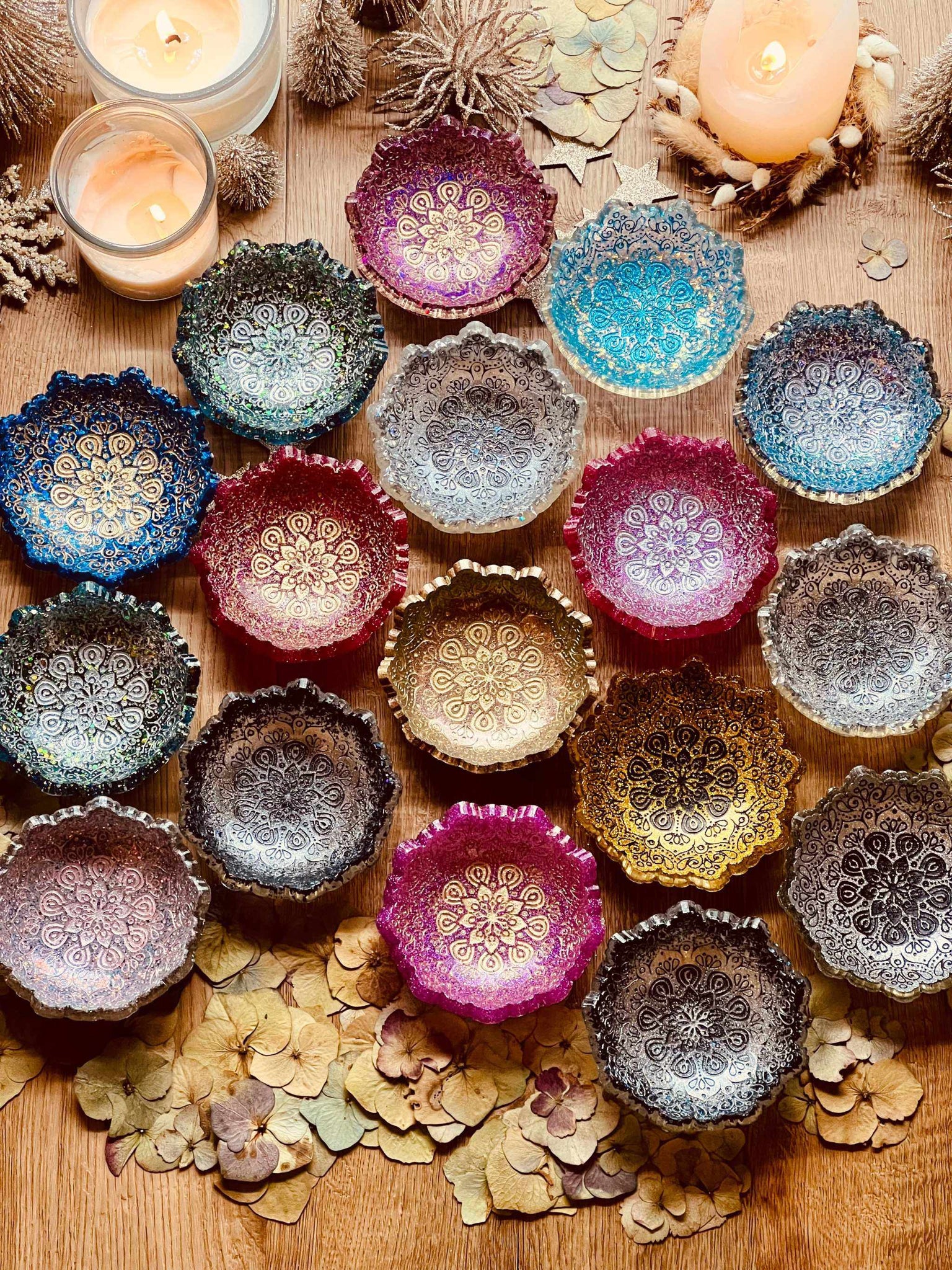 Mandala Schmuckschalen aus Resin in verschiedenen Farben