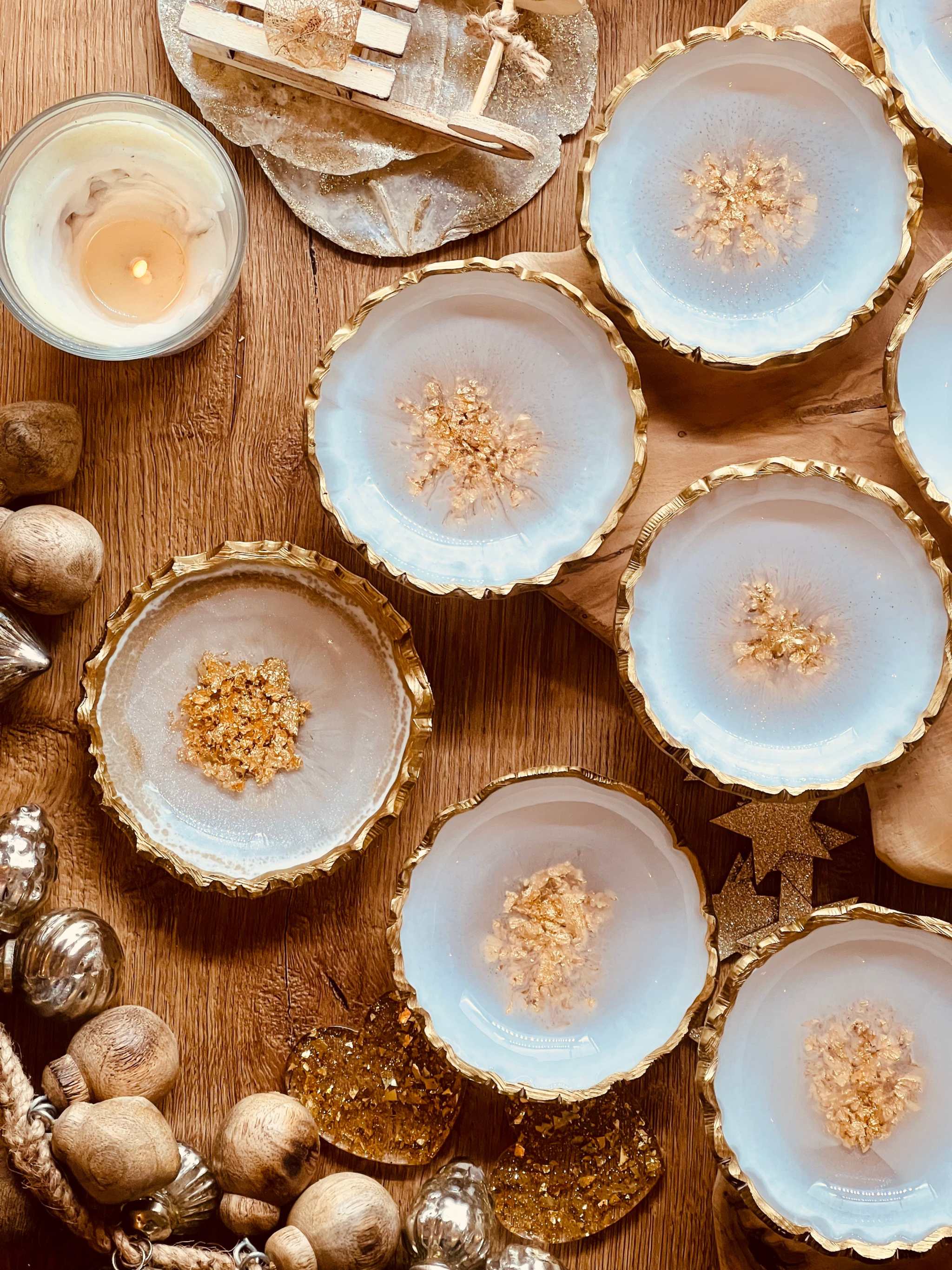 Handgemachte Schmuck- oder Ringschalen aus Resin in weiss mit goldenen Details. Alle meine Artikel sind einzigartige Unikate. Schmuckschalen sind die perfekte Dekoration in jedem Bade-oder Schlafzimmer und ein individuelles Geschenk für deine Liebsten.