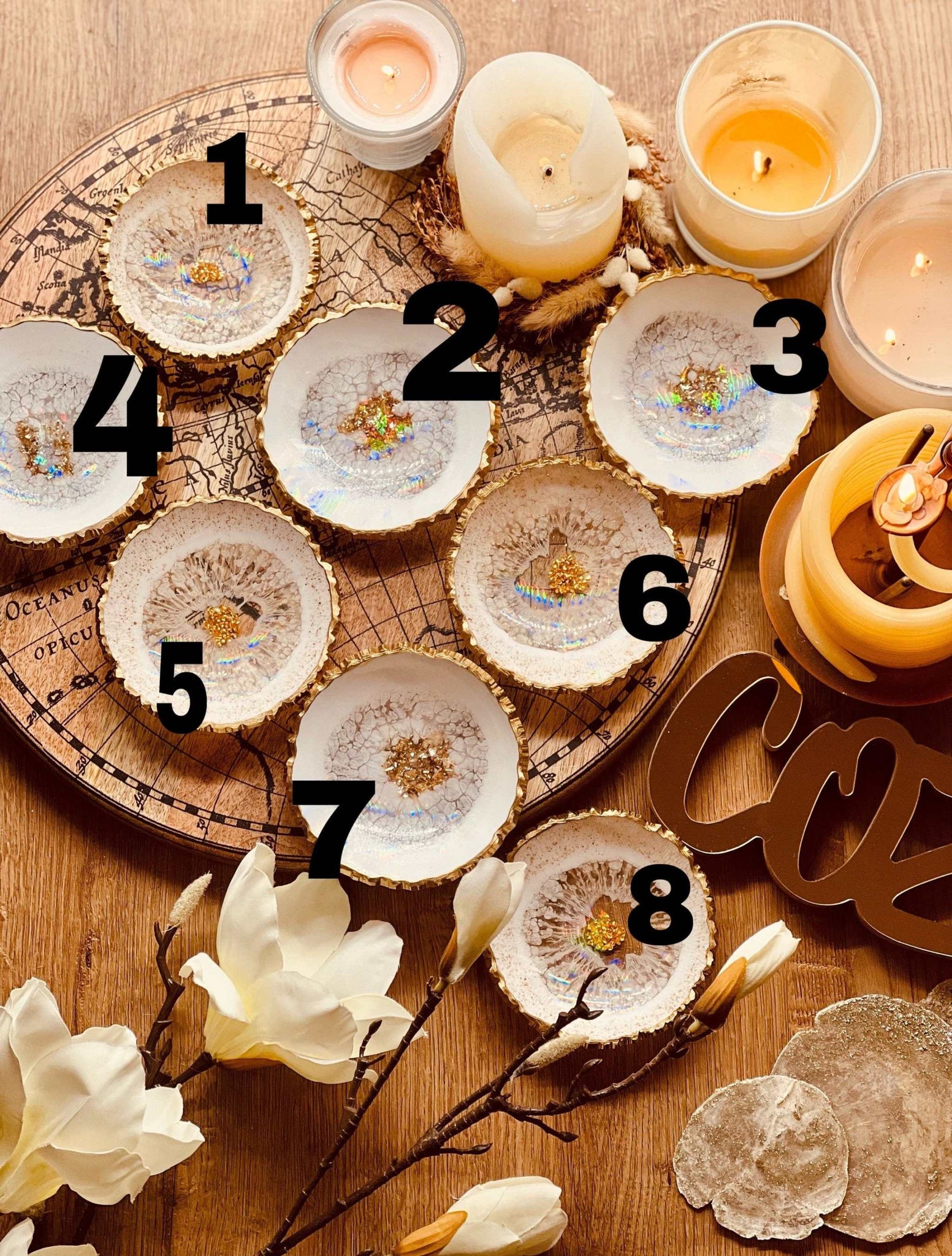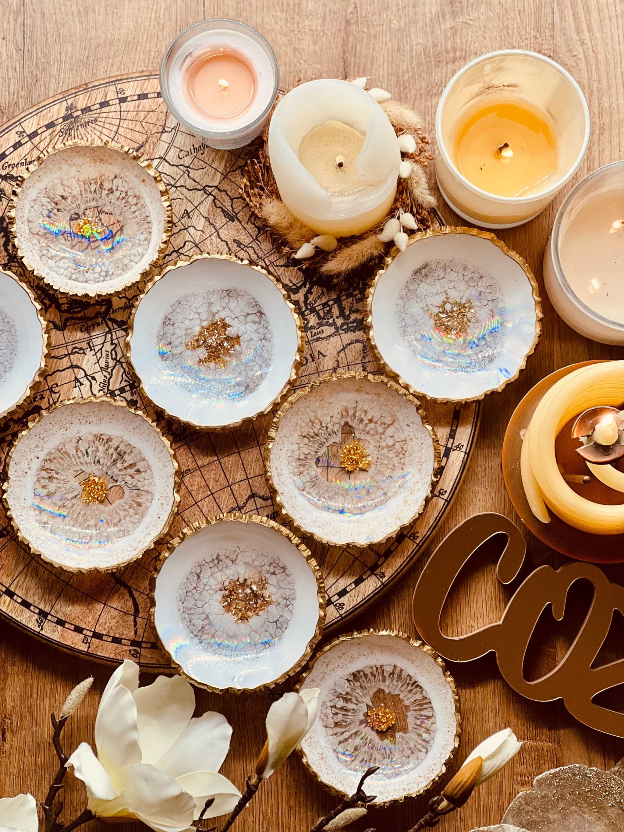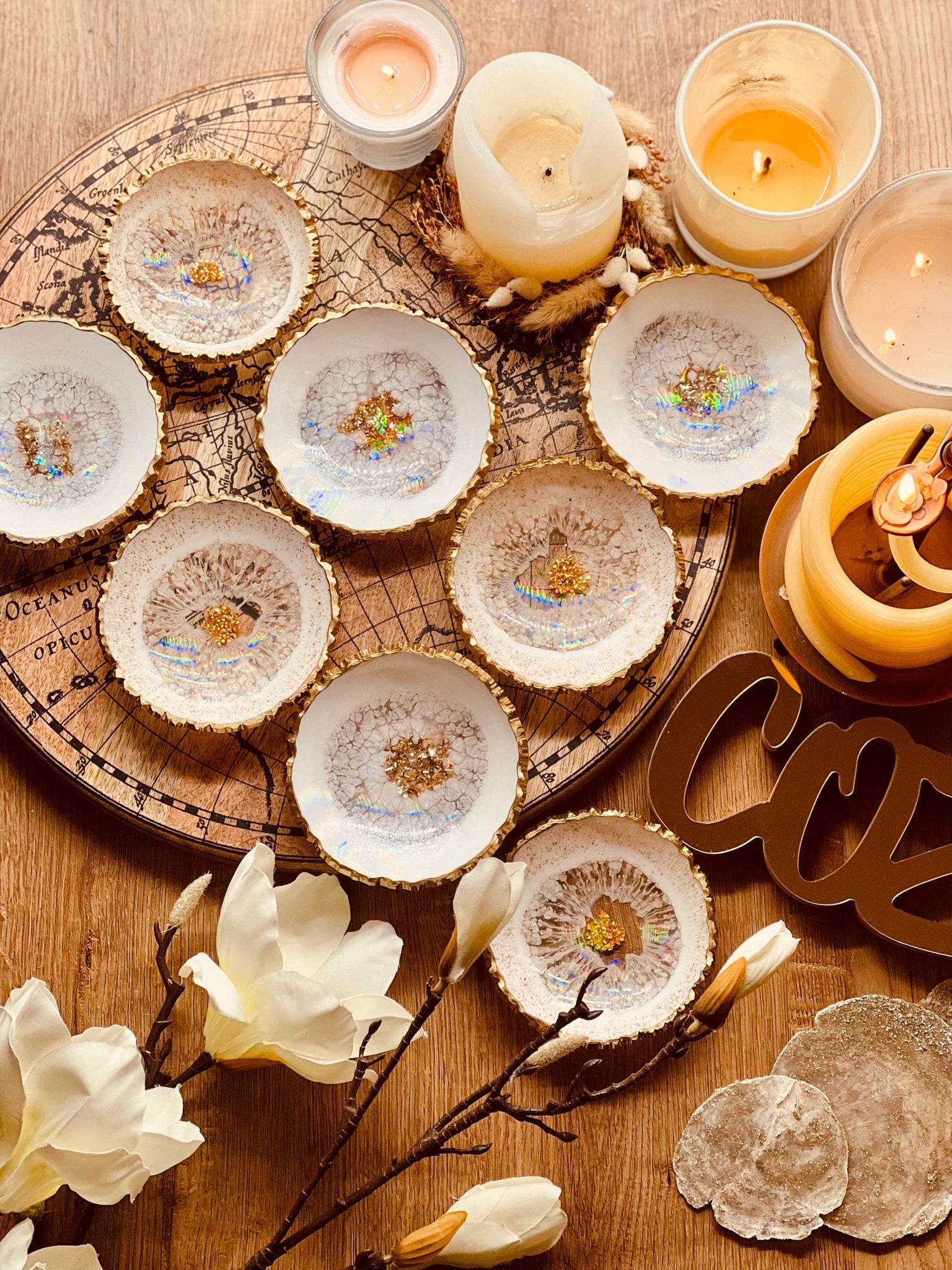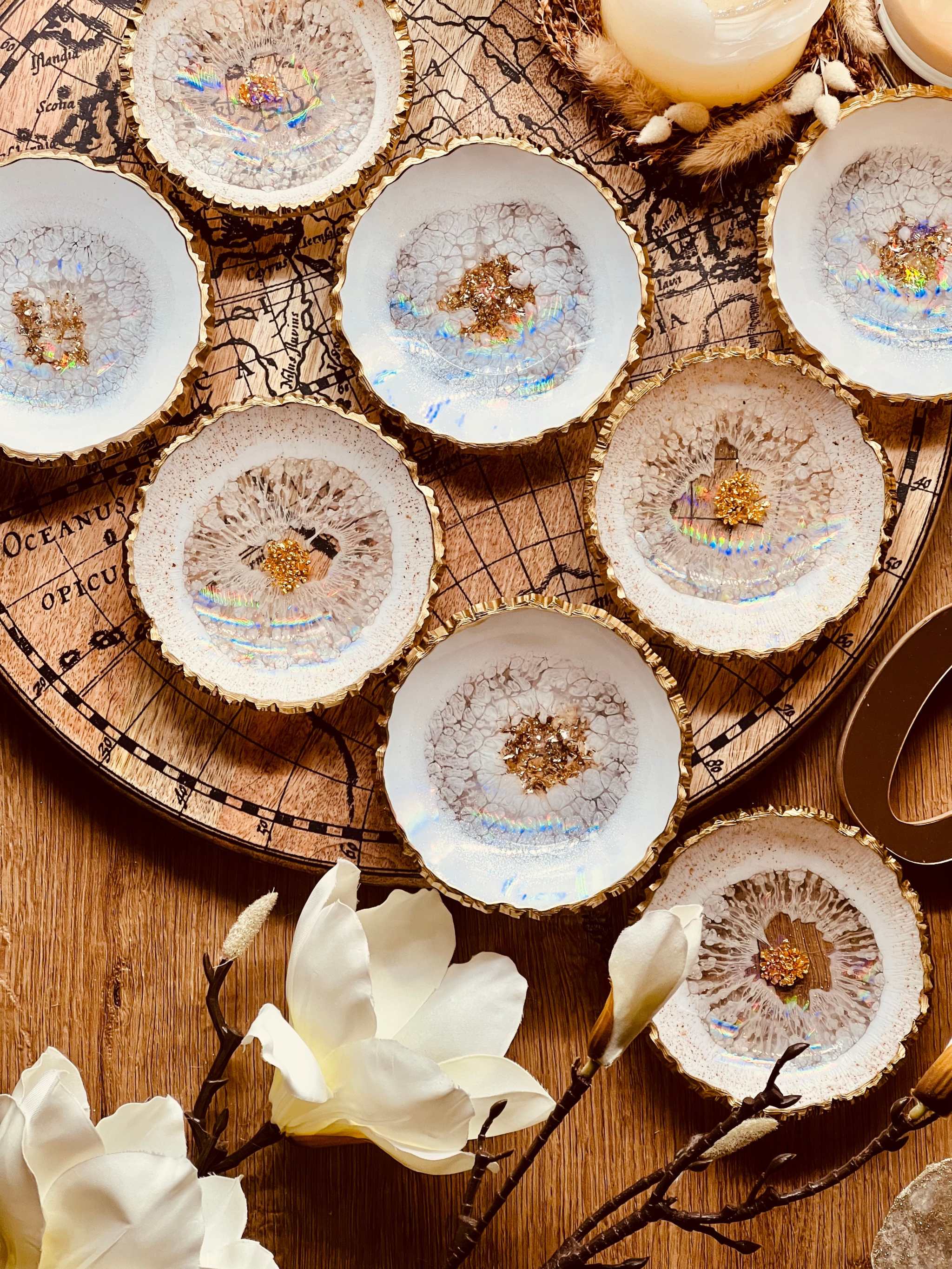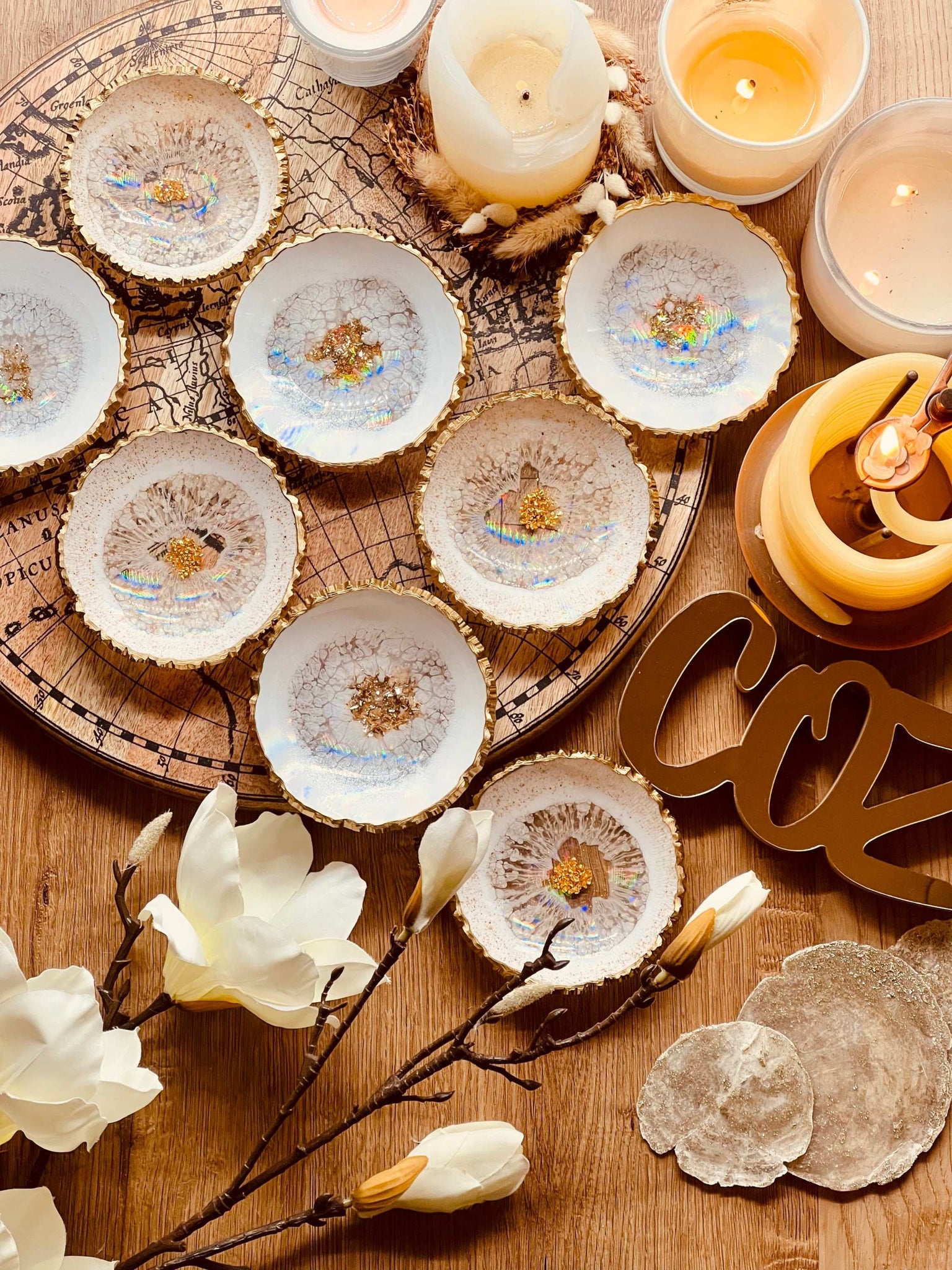 Holographische Schmuckschalen aus Resin in Weiss mit Gold
