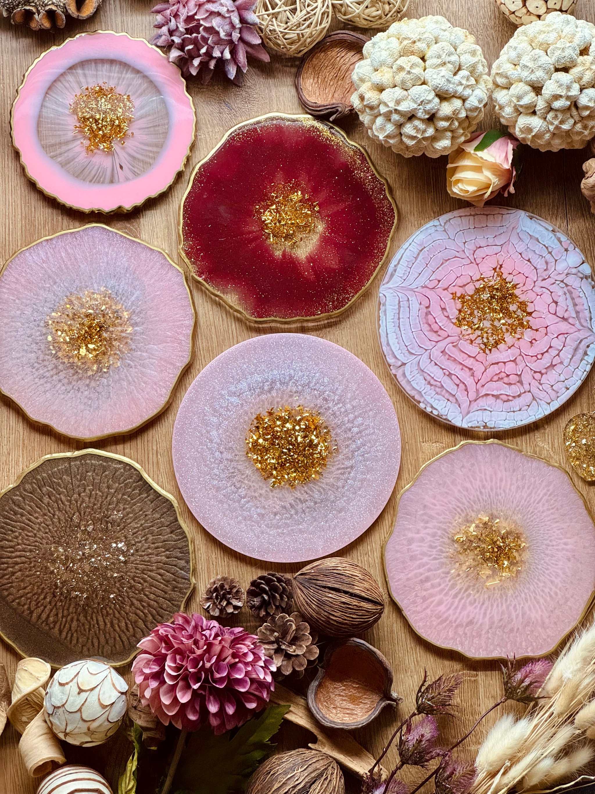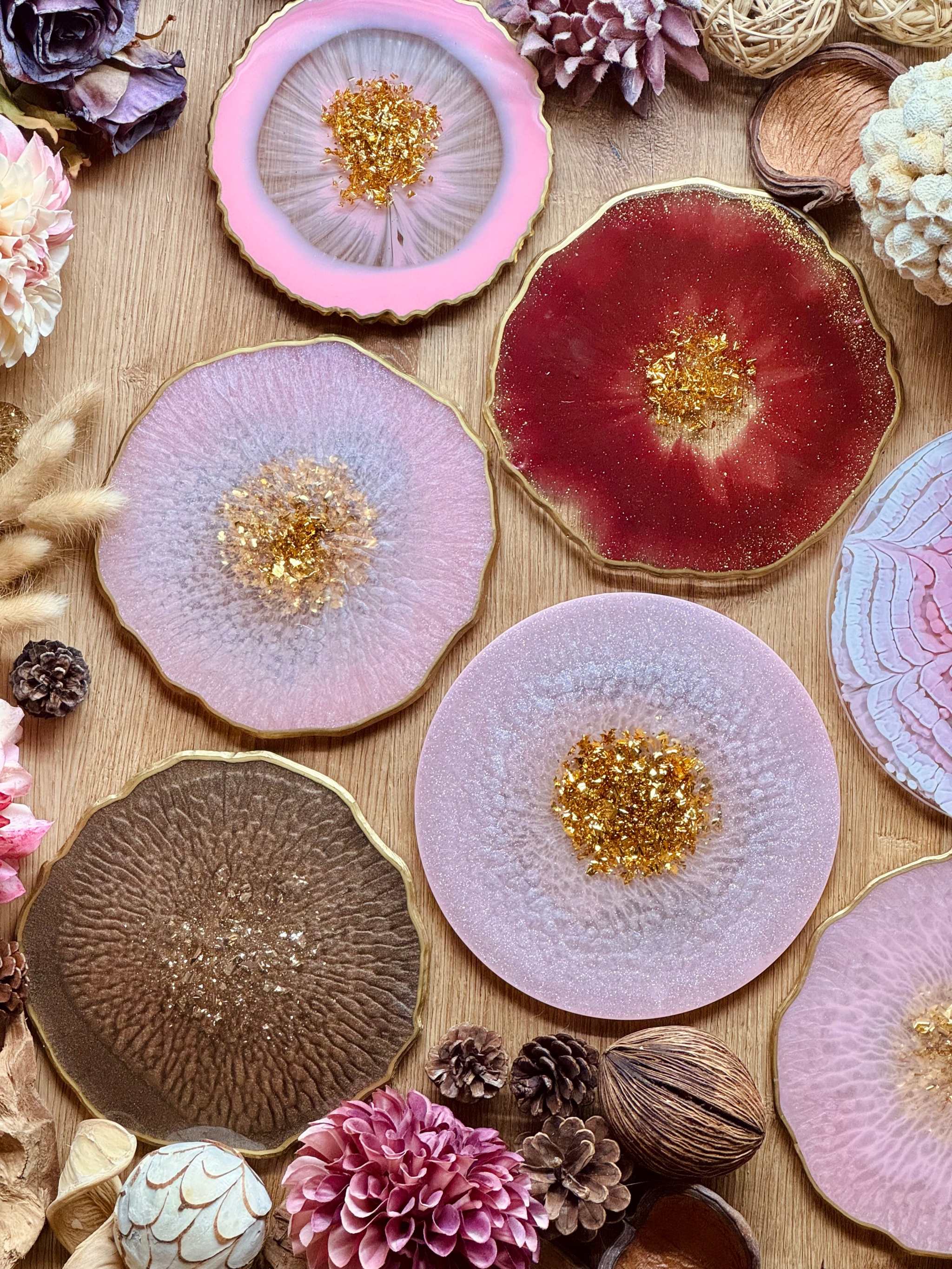 Handgemachte Tabletts aus Resin in rosa, rot und braun und goldenen Details. Alle meine Artikel sind einzigartige Unikate. Tabletts sind die perfekte Dekoration auf jedem Tisch oder Möbelstück und ein individuelles Geschenk für deine Liebsten. Maße: Ca. 17cm