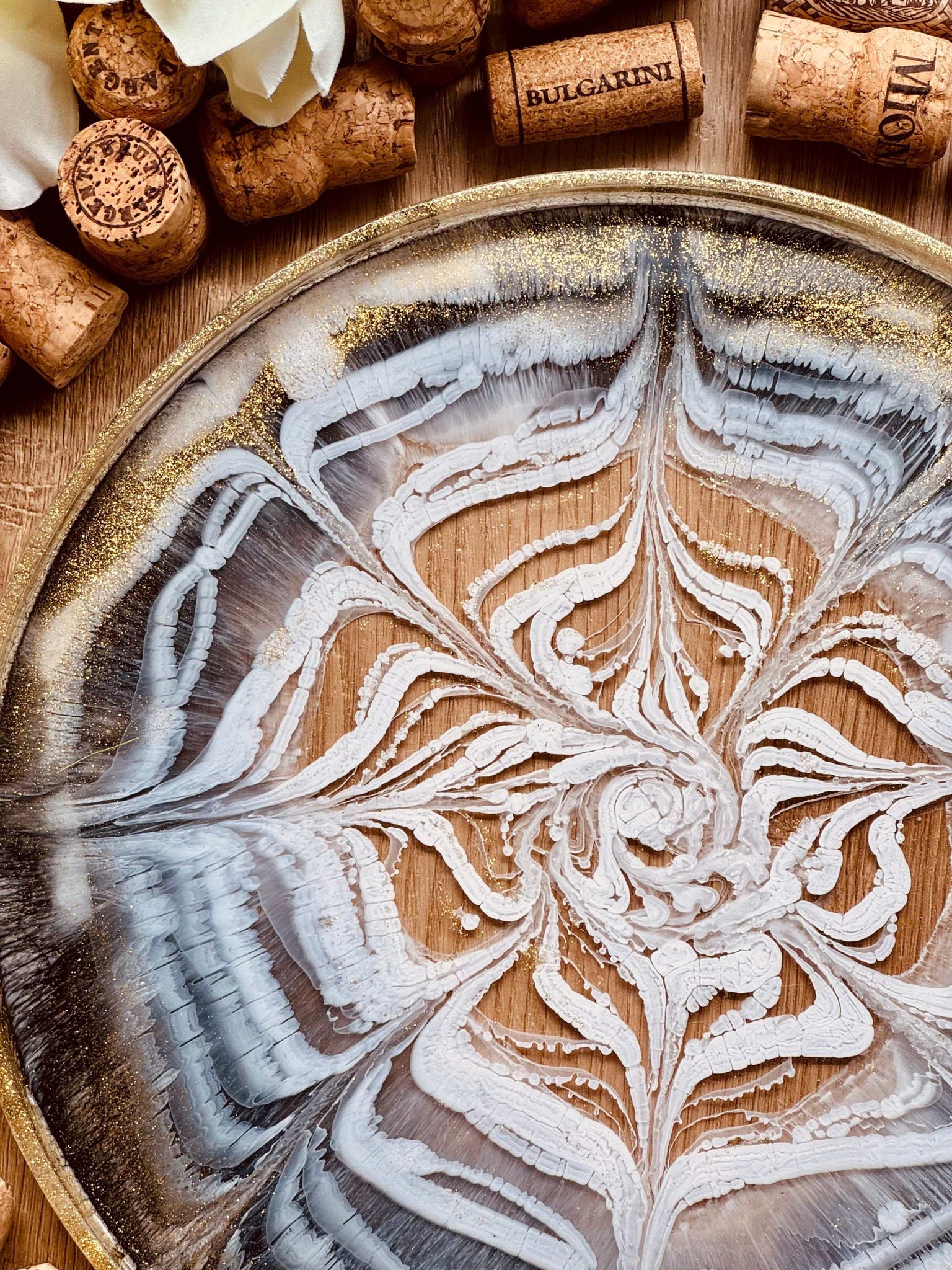 Handgemachtes Tablett aus Resin mit goldenen Details. Alle meine Artikel sind einzigartige Unikate. Tabletts sind die perfekte Dekoration auf jedem Tisch oder Möbelstück und ein individuelles Geschenk für deine Liebsten.