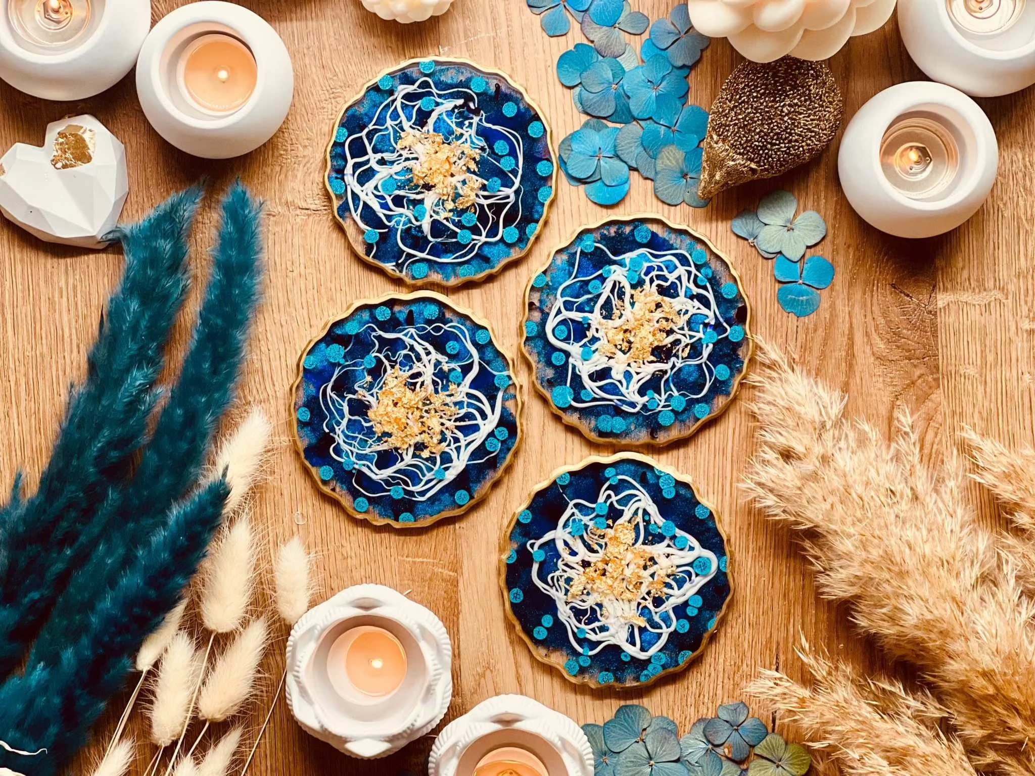 4 Untersetzer aus Resin in Blau und Weiss mit Gold