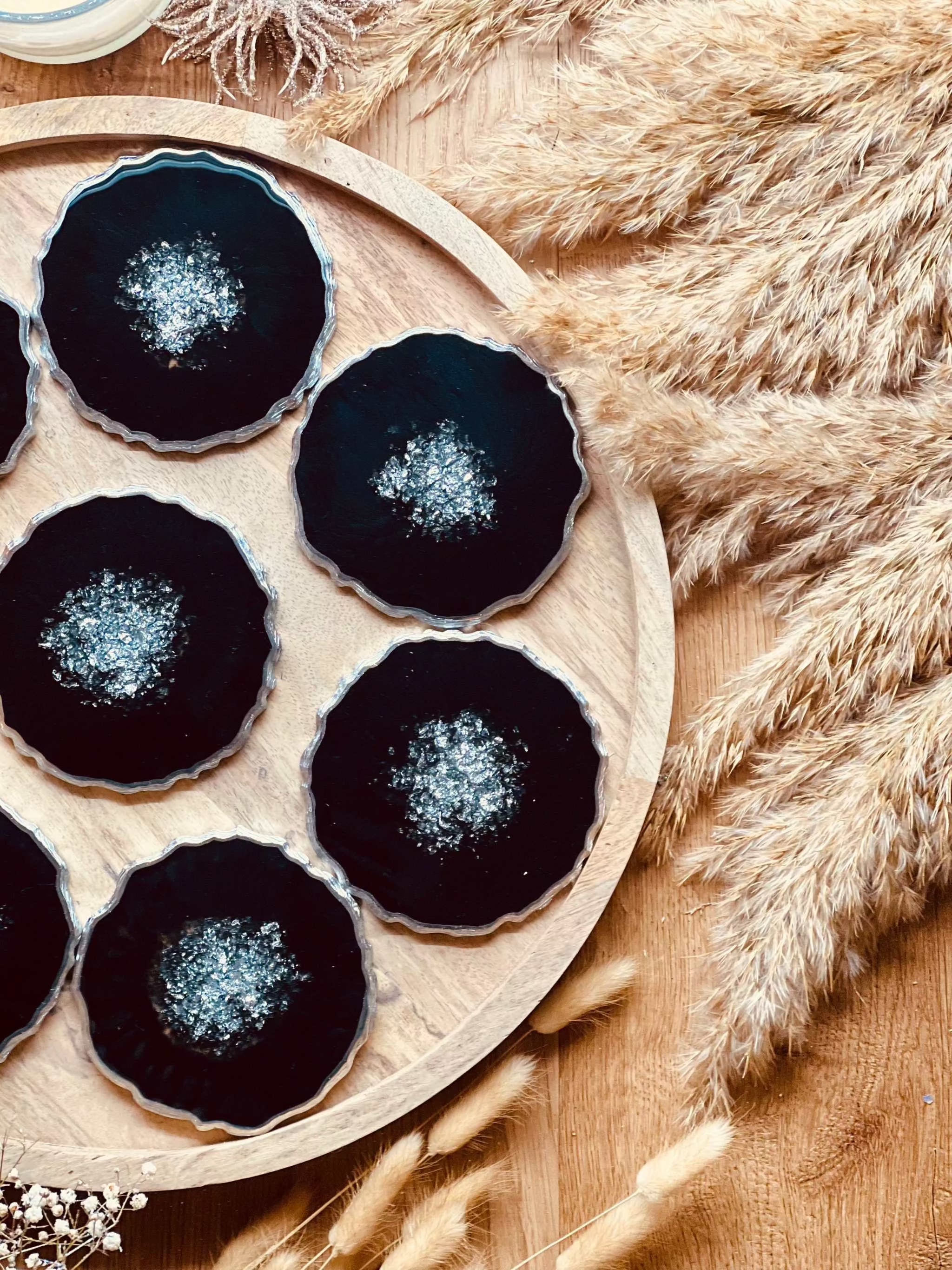 8 Untersetzer aus Resin in schwarz mit silber