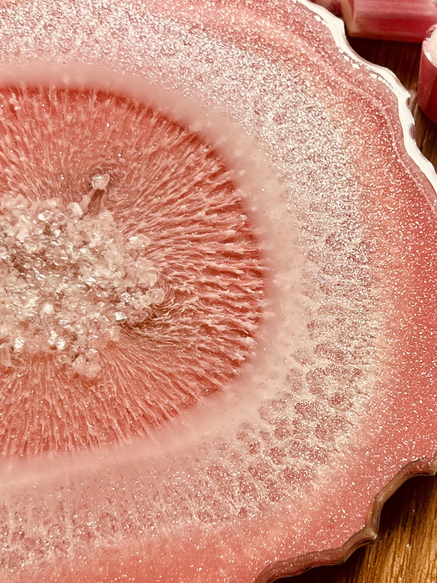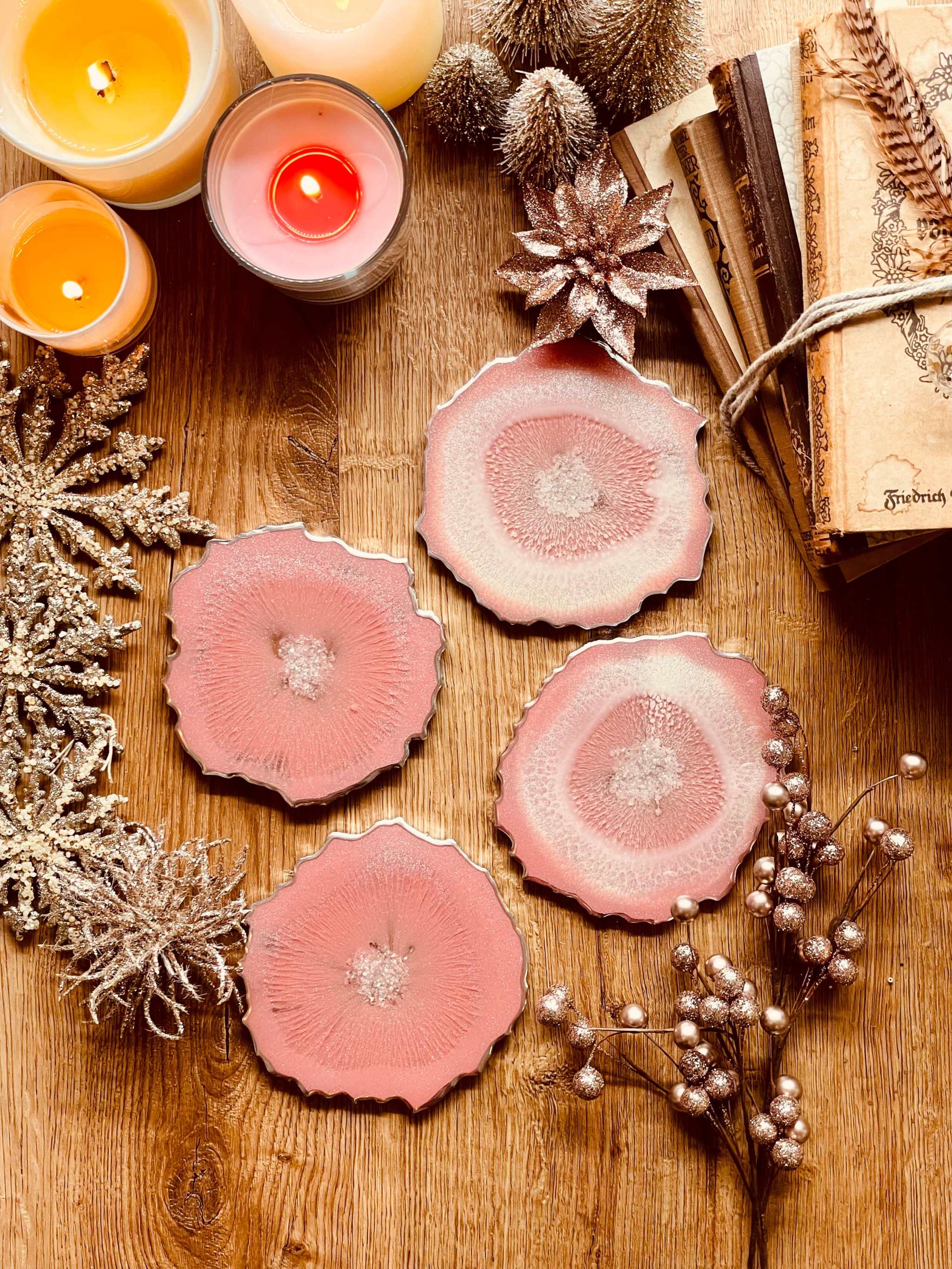 Handgemachte Untersetzer aus Resin in rosa mit silbernen Details im 4-teiligen Set. Alle meine Artikel sind einzigartige Unikate. Diese Untersetzer sind die perfekte Dekoration auf jedem Tisch und ein individuelles Geschenk für deine Liebsten. Maße: Durchmesser ca. 12cm.