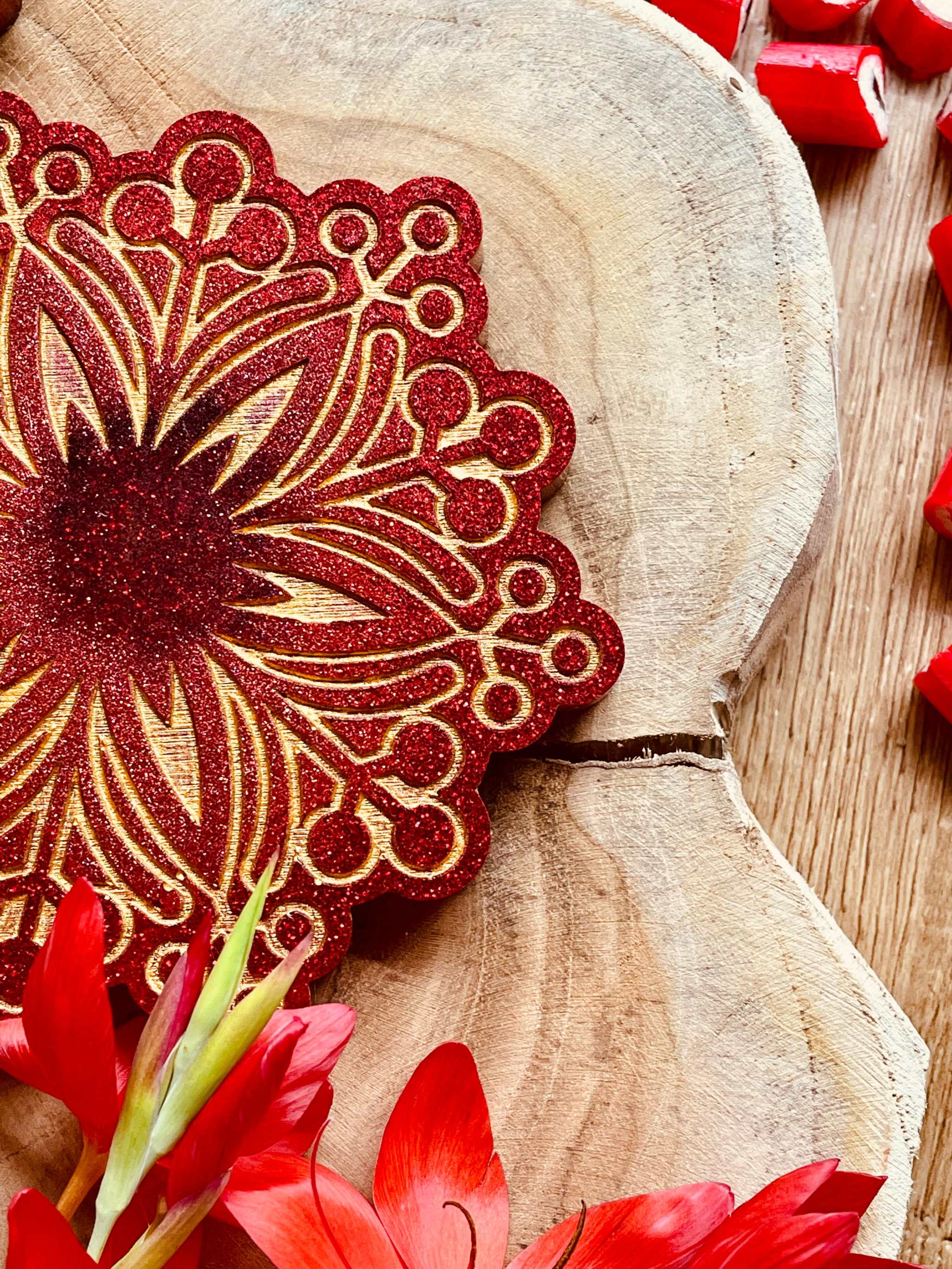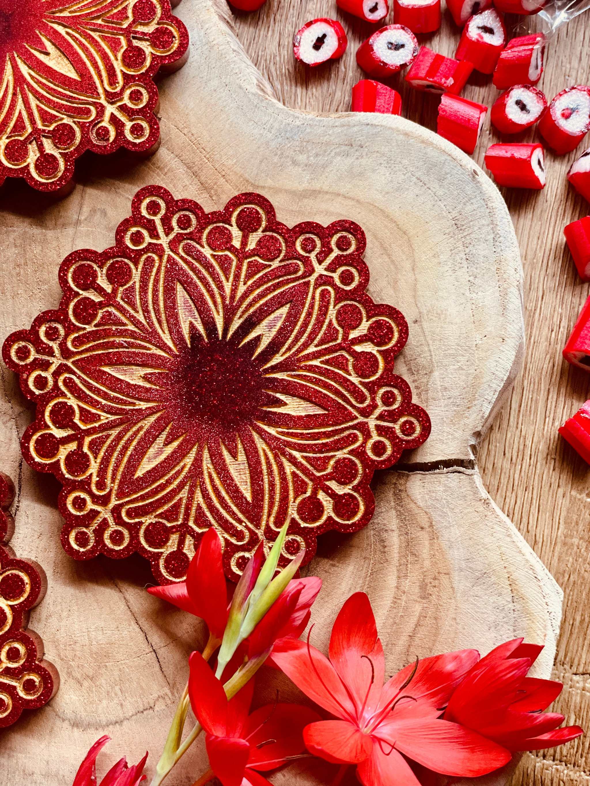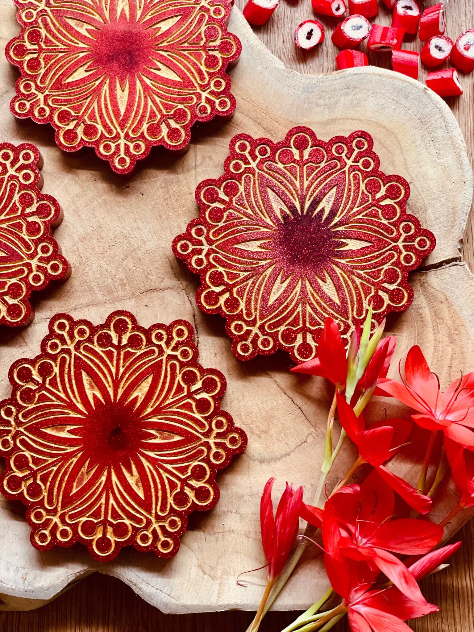 4 winterliche Untersetzer aus Resin in Rot mit Gold