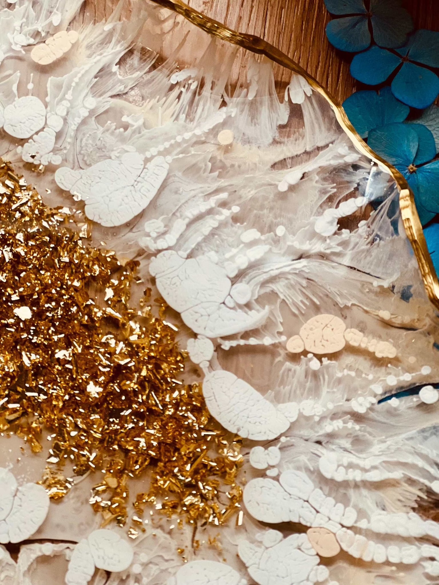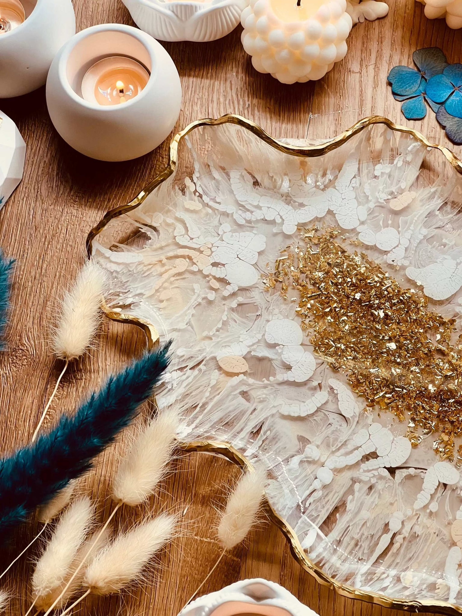 Handmade resin tray in white with golden details and elaborate 3D technology. All of my items are one-of-a-kind. Trays are the perfect decoration on any table or piece of furniture and an individual gift for your loved ones. Dimensions: Approx. 30x17cm