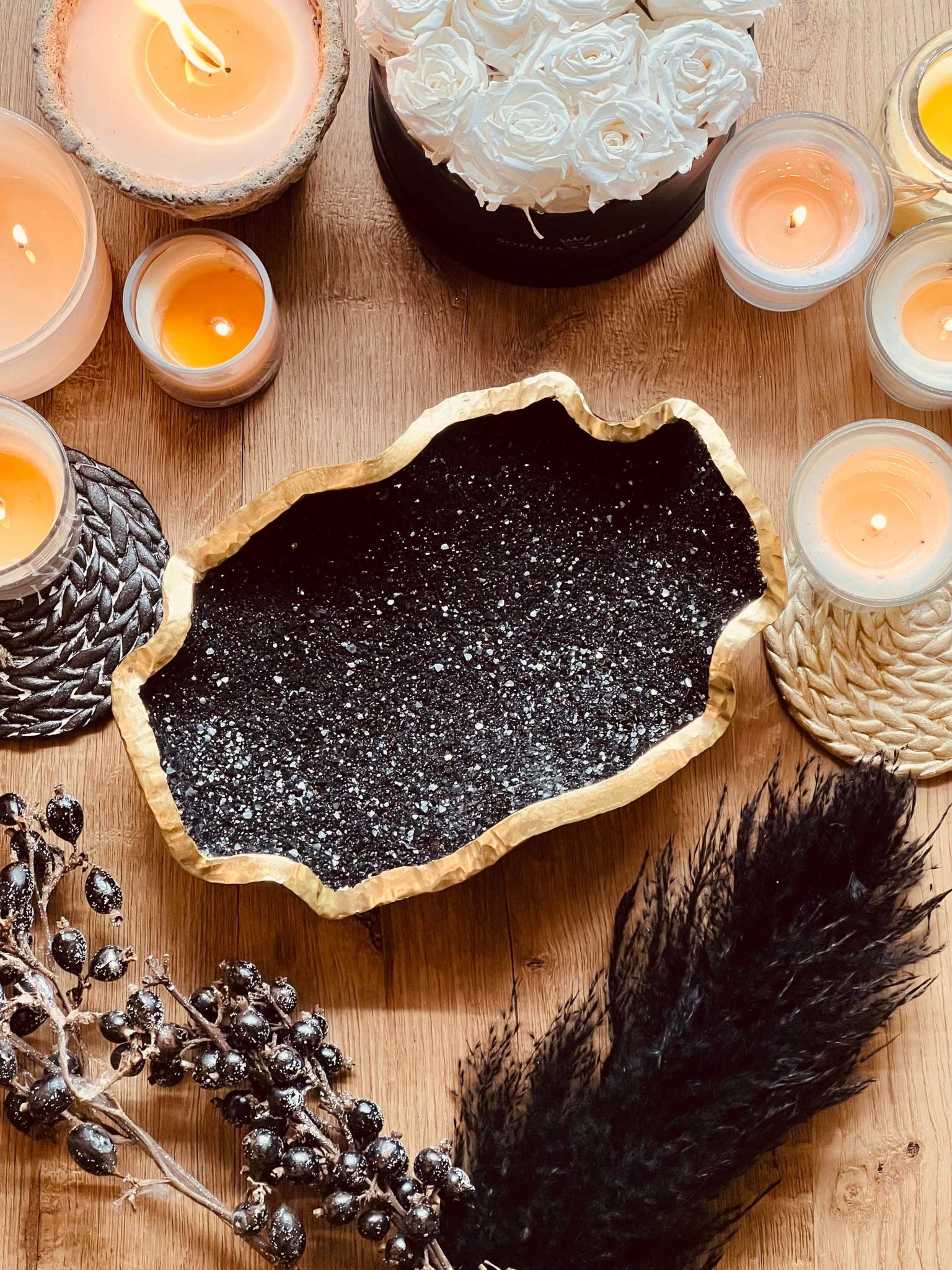 Handmade resin bowl in black with gold in diamond look. All of my items are one-of-a-kind. Bowls are the perfect decoration in every living and dining room and an individual gift for your loved ones. Dimensions: Approx. 27x18cm.