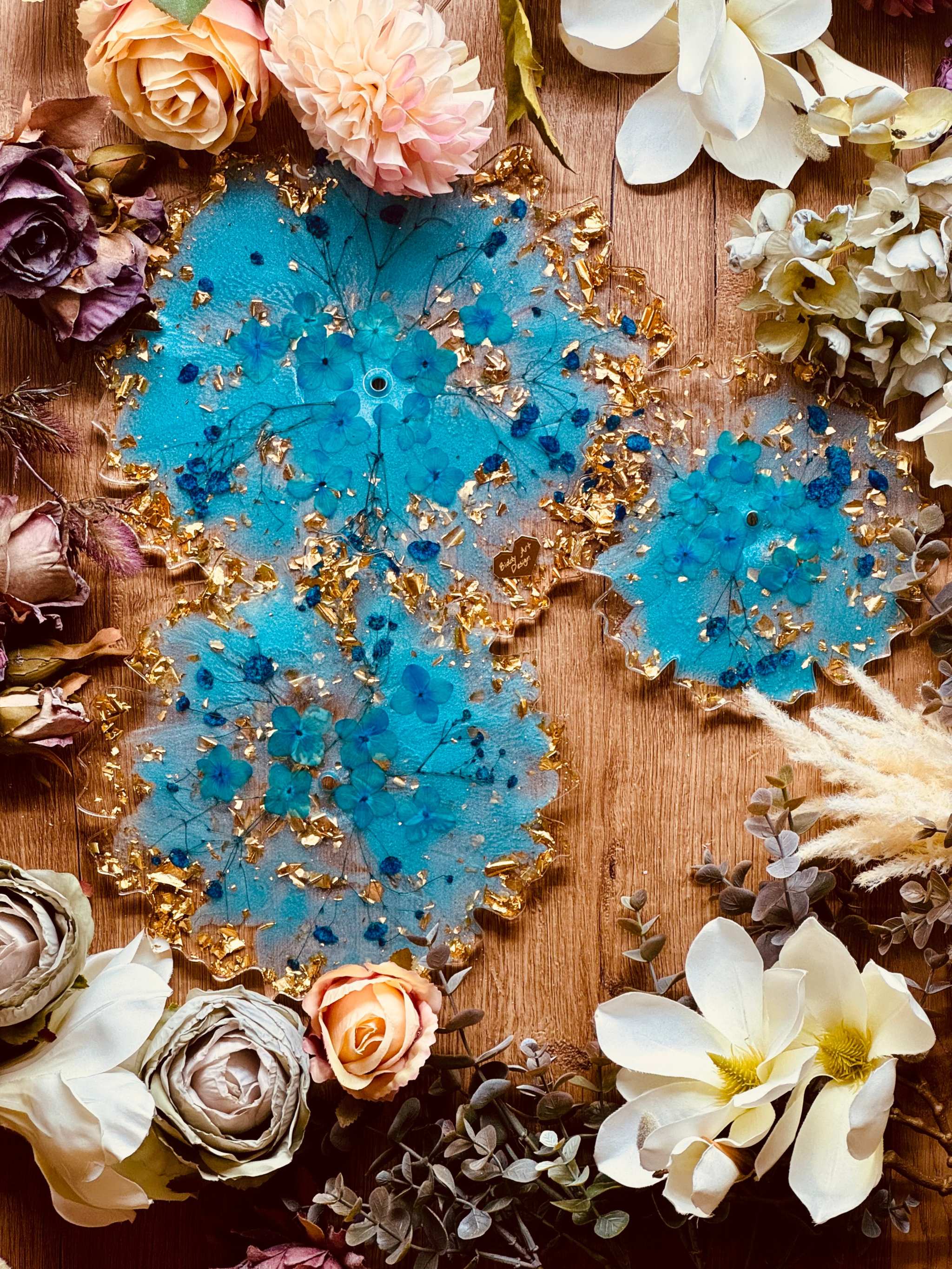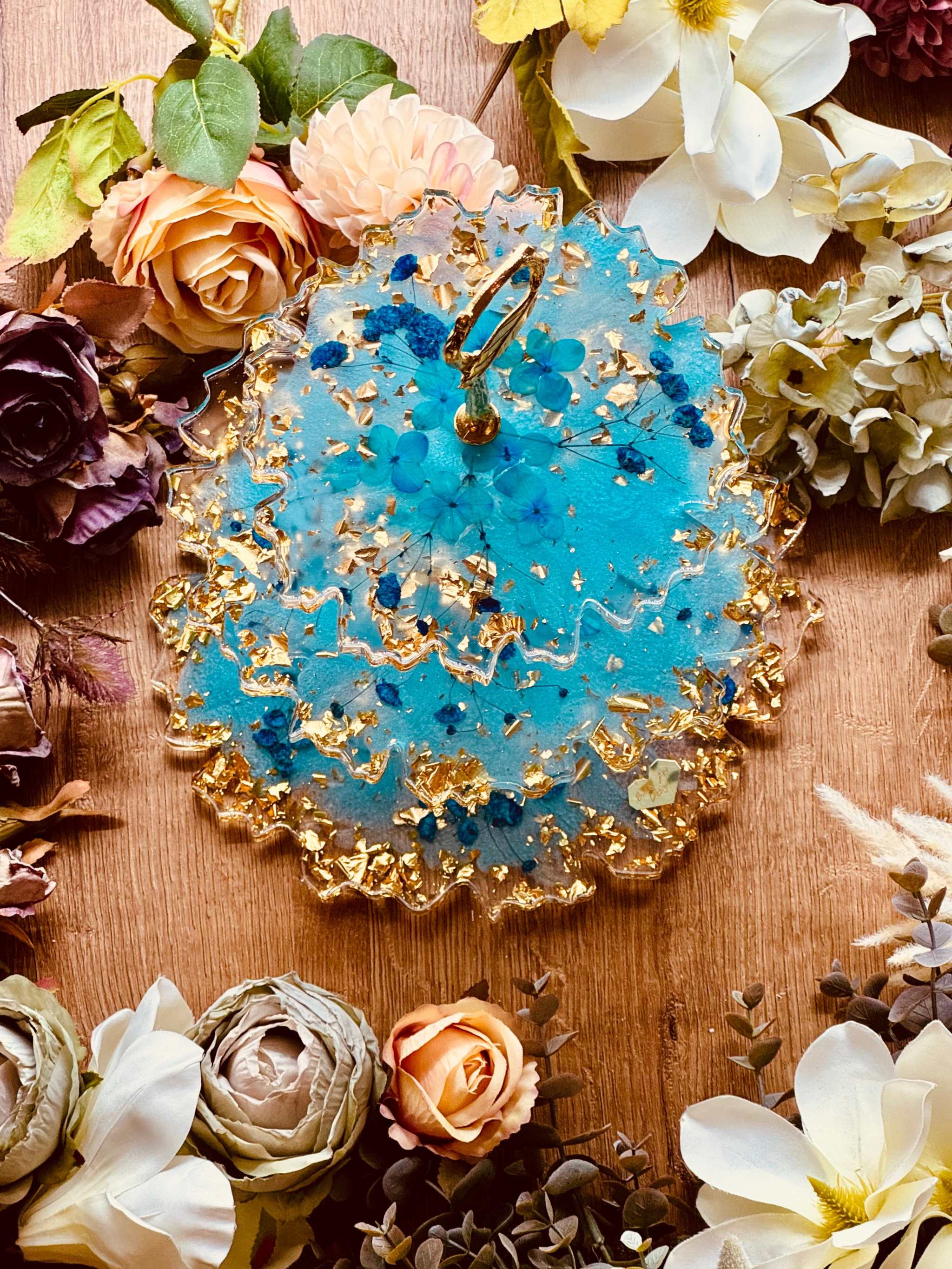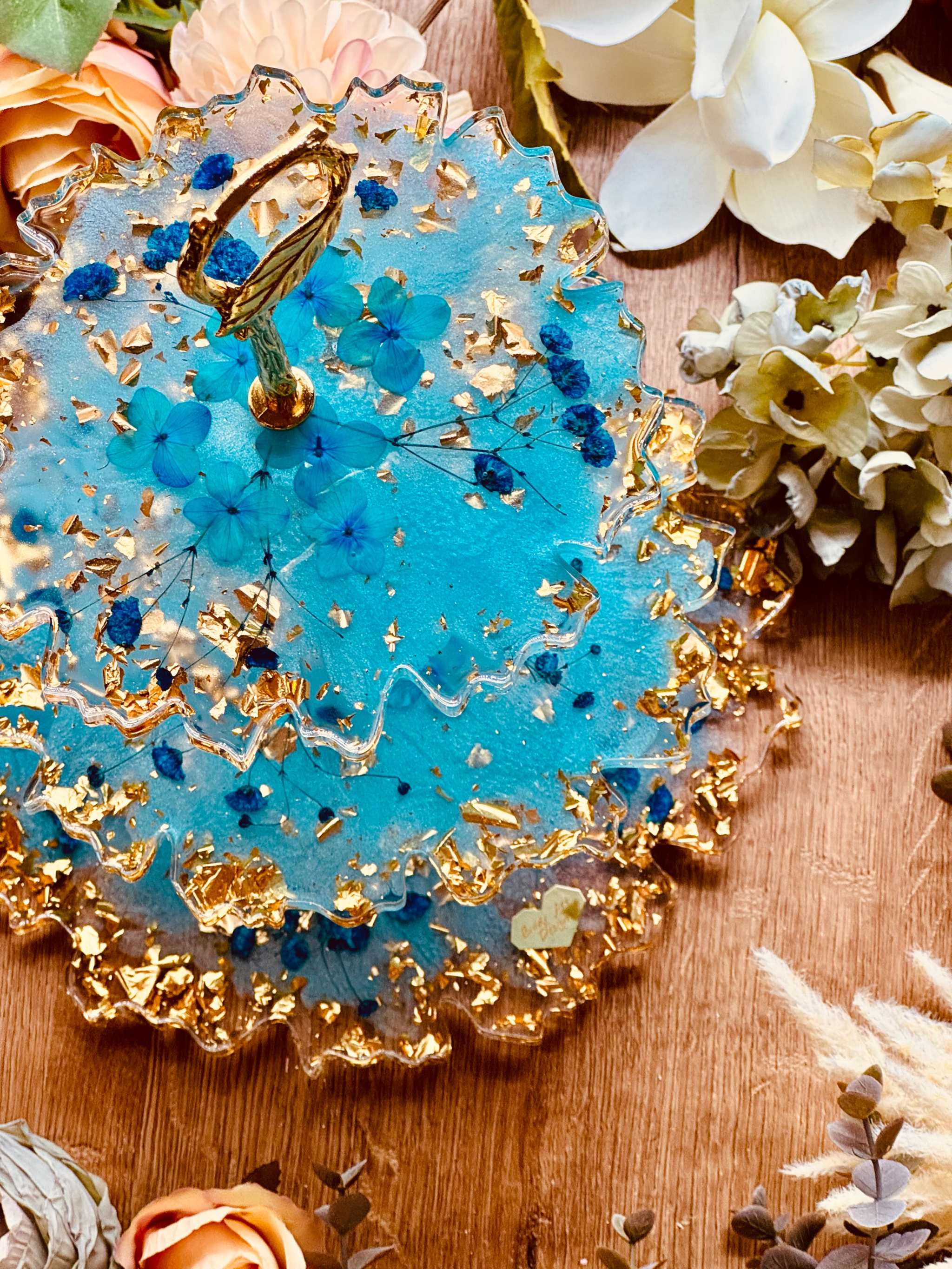 Epoxy resin cake stand – stylish decoration with dried turquoise flowers and gold leaf