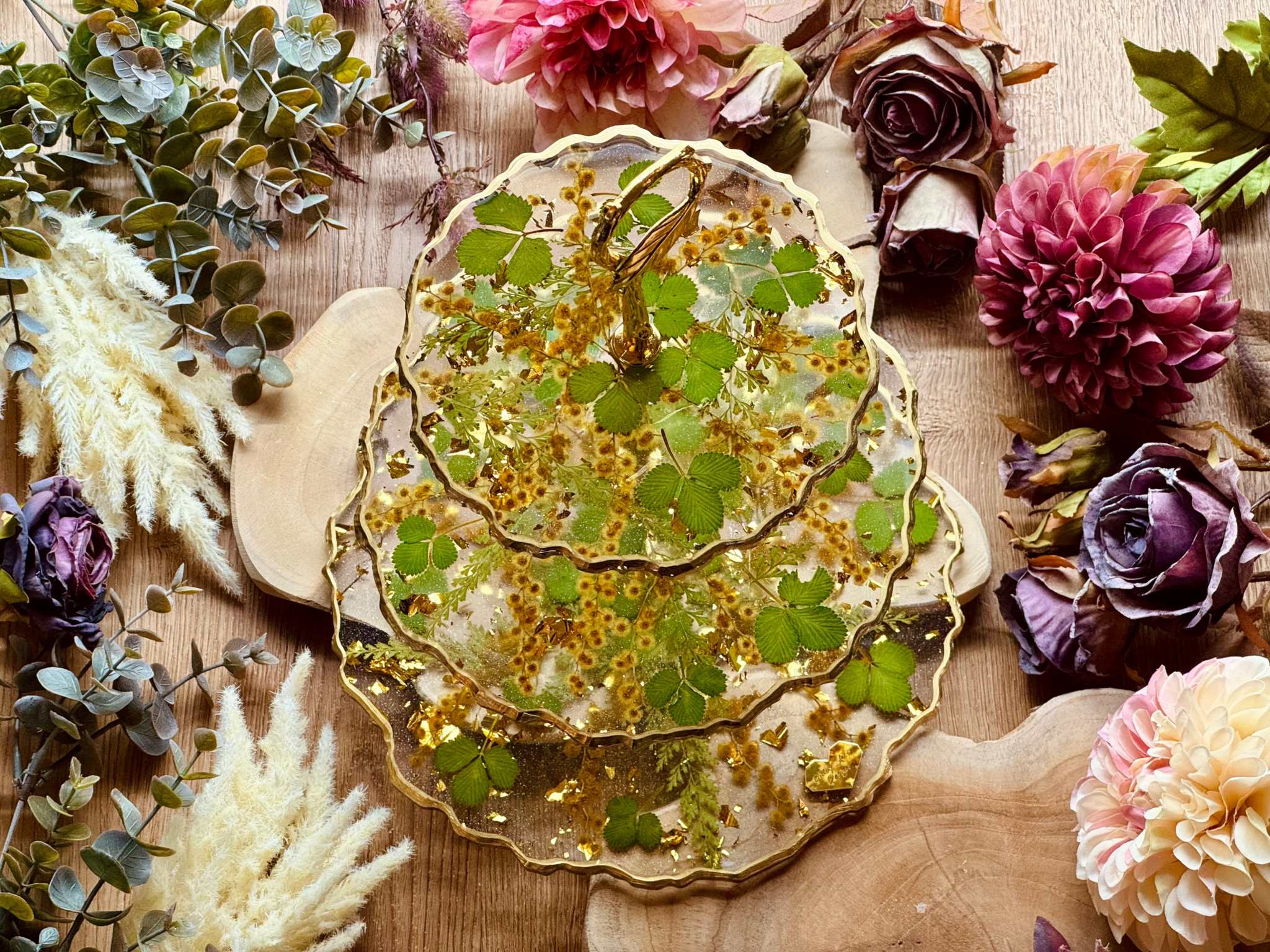 The epoxy resin cake stand isn't just a functional item—it's a true work of art. The combination of transparent cast resin, naturally dried flowers, and elegant gold leaf creates a three-dimensional depth effect that accentuates every play of light. This makes each cake stand a unique epoxy resin decoration that not only enhances your home but also tells a story.