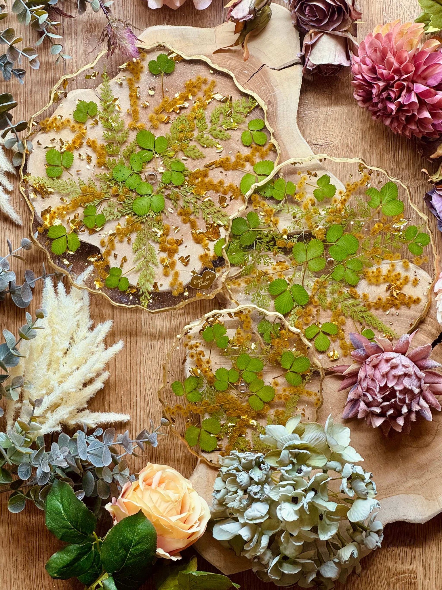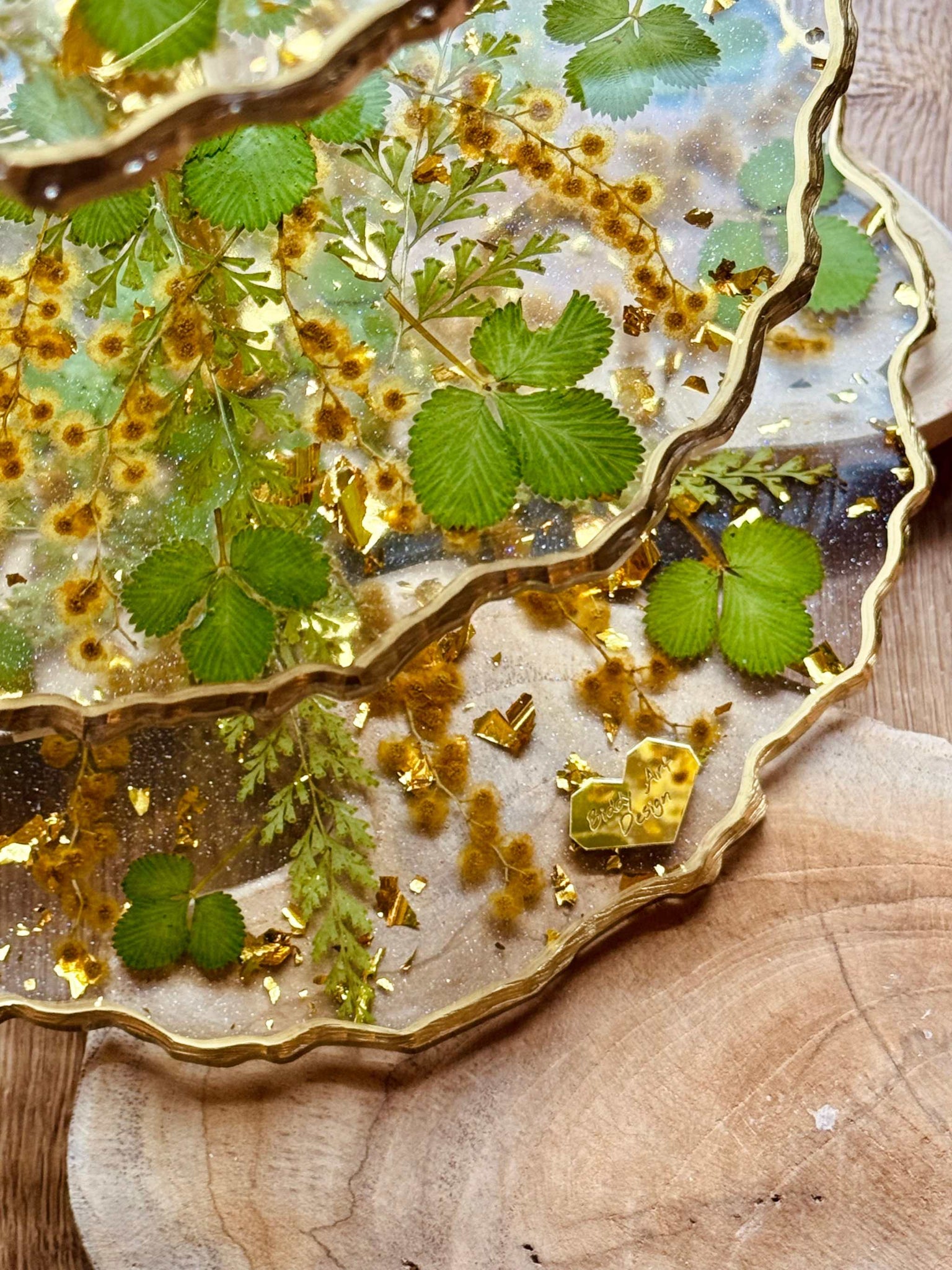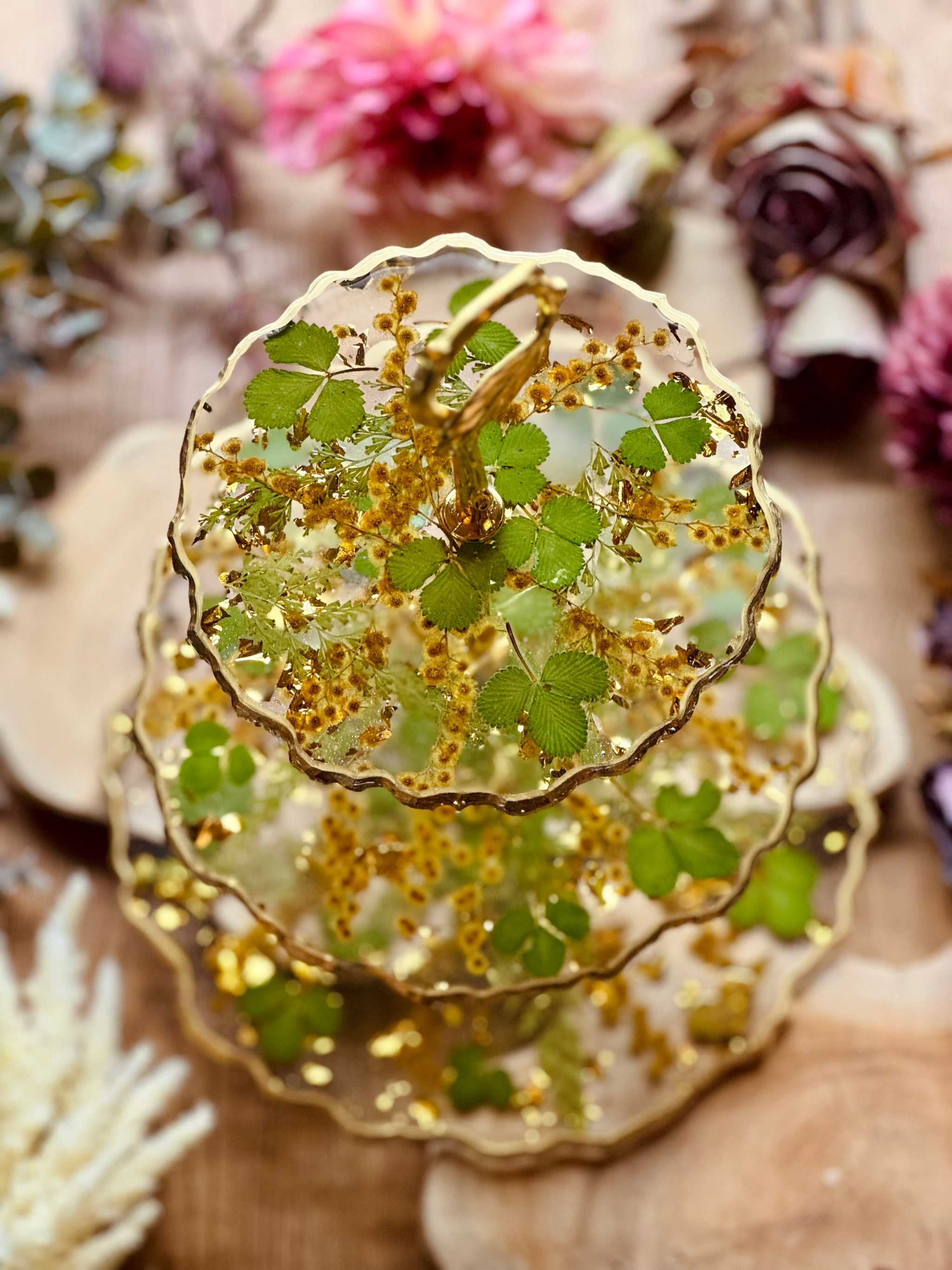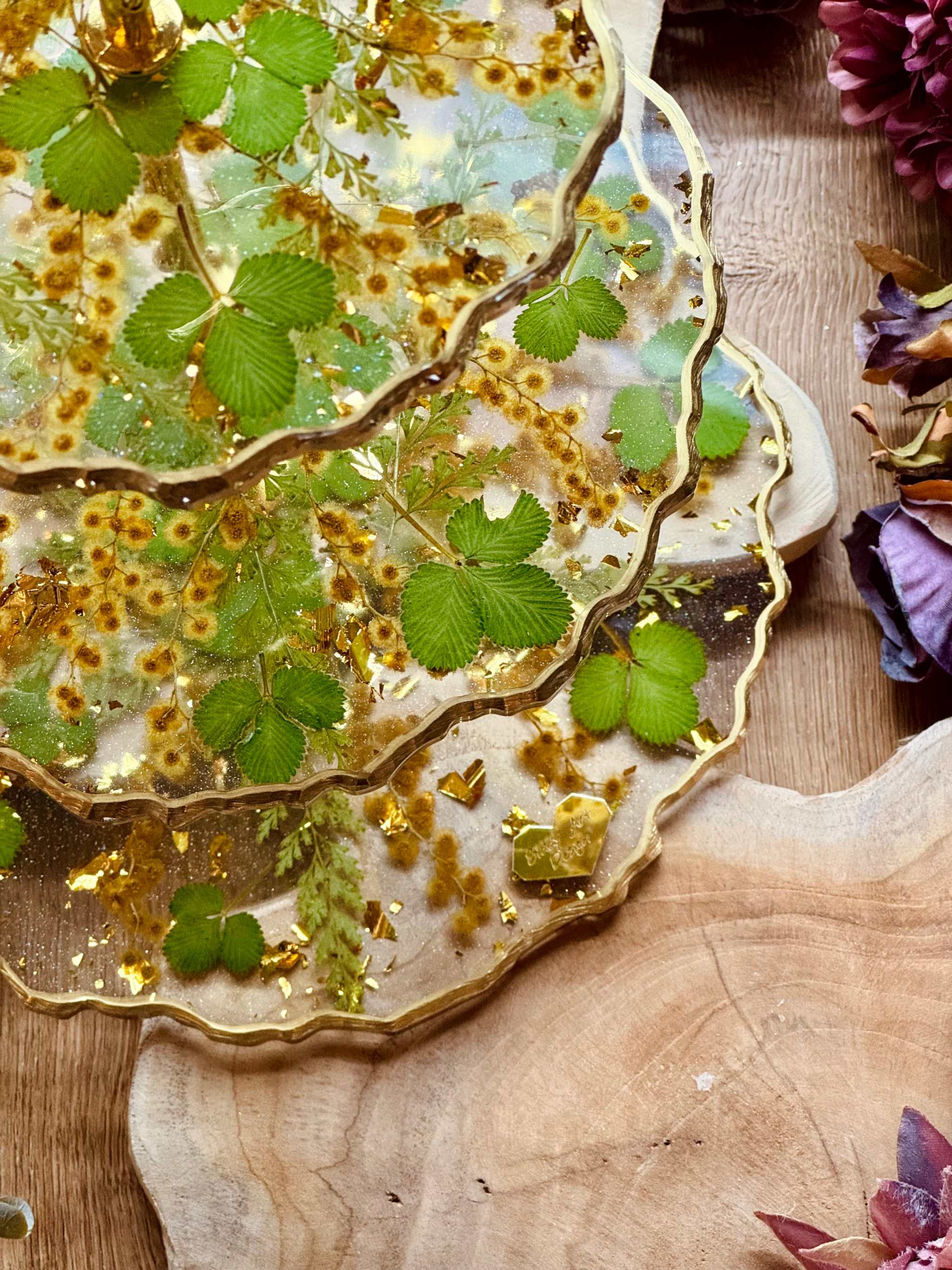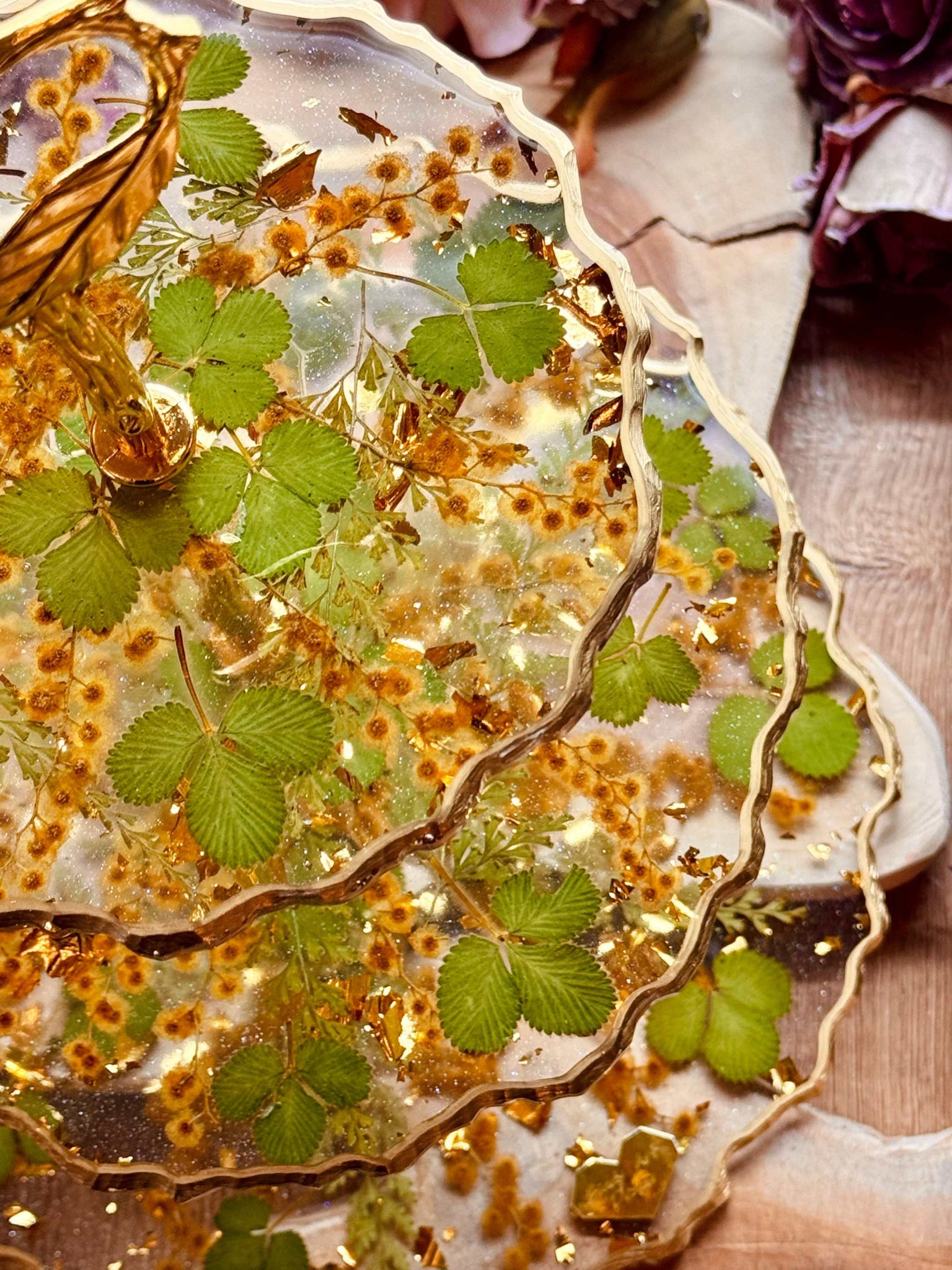 This unique epoxy resin cake stand, featuring dried flowers, strawberry leaves, acacia, and gold leaf, combines natural beauty with luxurious design. Whether as a highlight of your decor or as a stylish cake stand, it's sure to attract attention. Each cake stand is unique and lovingly handcrafted—individual, with attention to detail, and with the highest standards of quality.