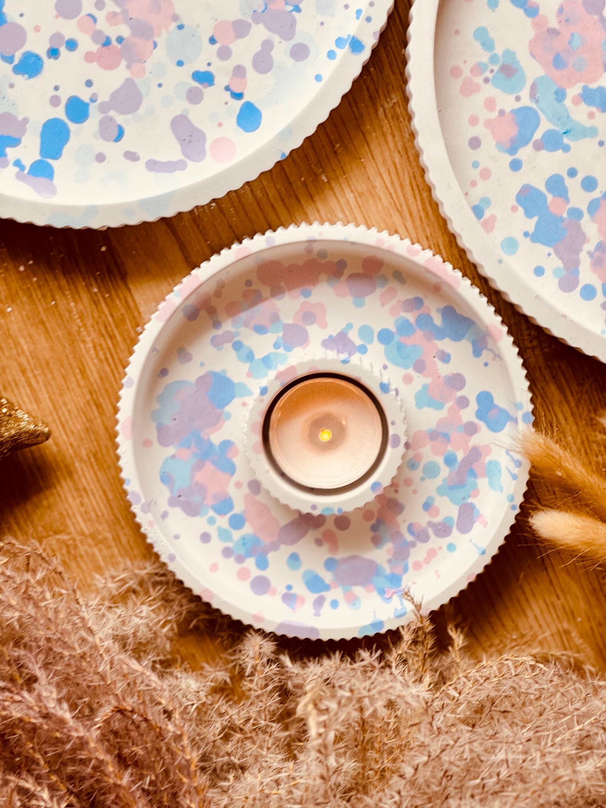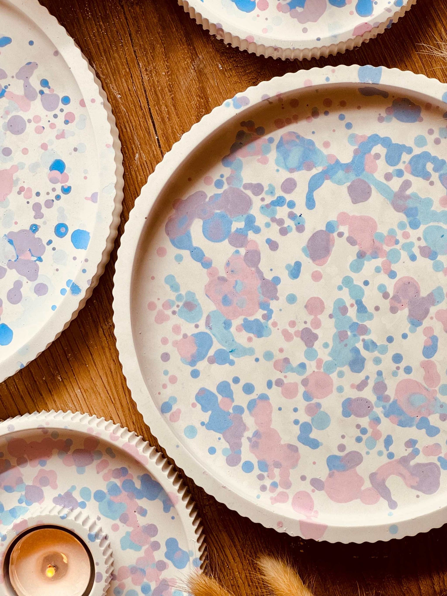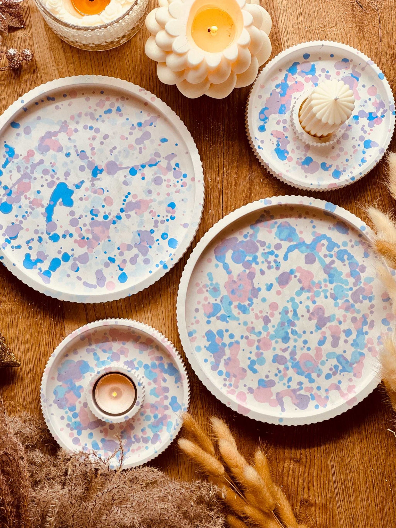 The handmade cast ceramic set "Straight Lines Pastel Dots" combines a round tray and a matching candle holder in a modern design. Made from environmentally friendly cast ceramic, this set impresses with its unique "Straight Lines Pastel Dots" patterns that add a stylish touch to any room. The round tray is ideal for displaying candles, jewelry or other decorative items, while the candle holder is perfect for taper candles. With a diameter of approx. 20 cm for the tray and a height of approx. 10 cm for the candle holder, this set offers versatile uses. Each piece is handmade and unique, which means slight variations in color and pattern may occur.
