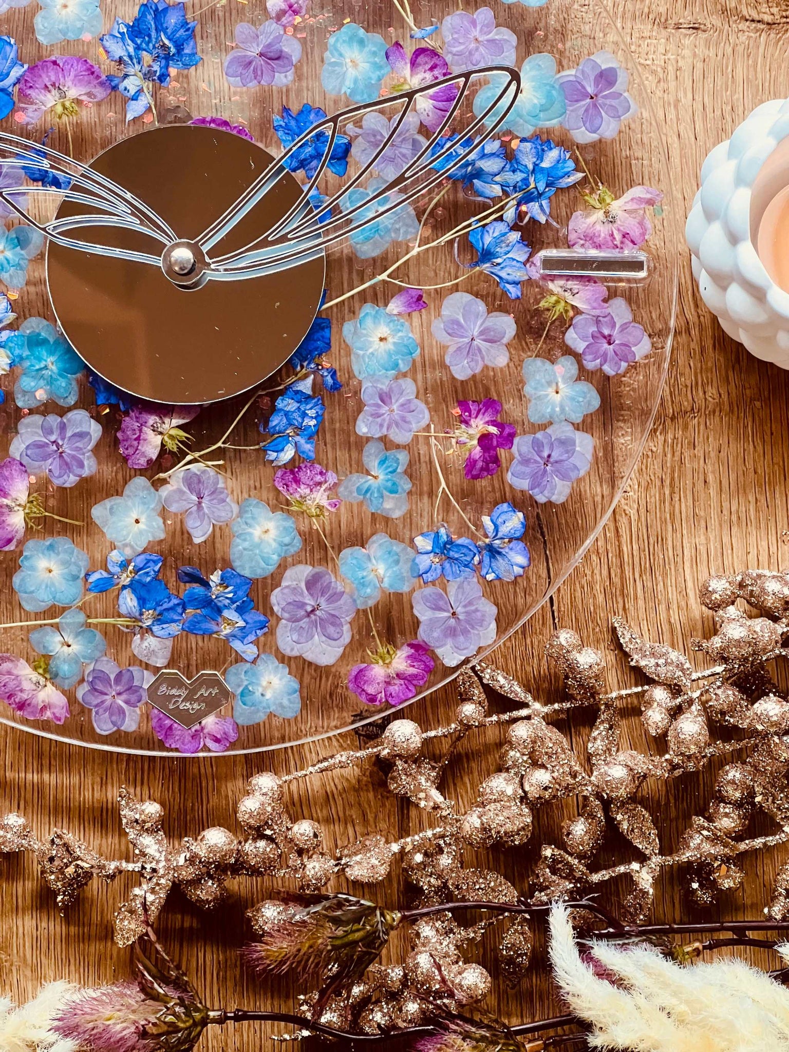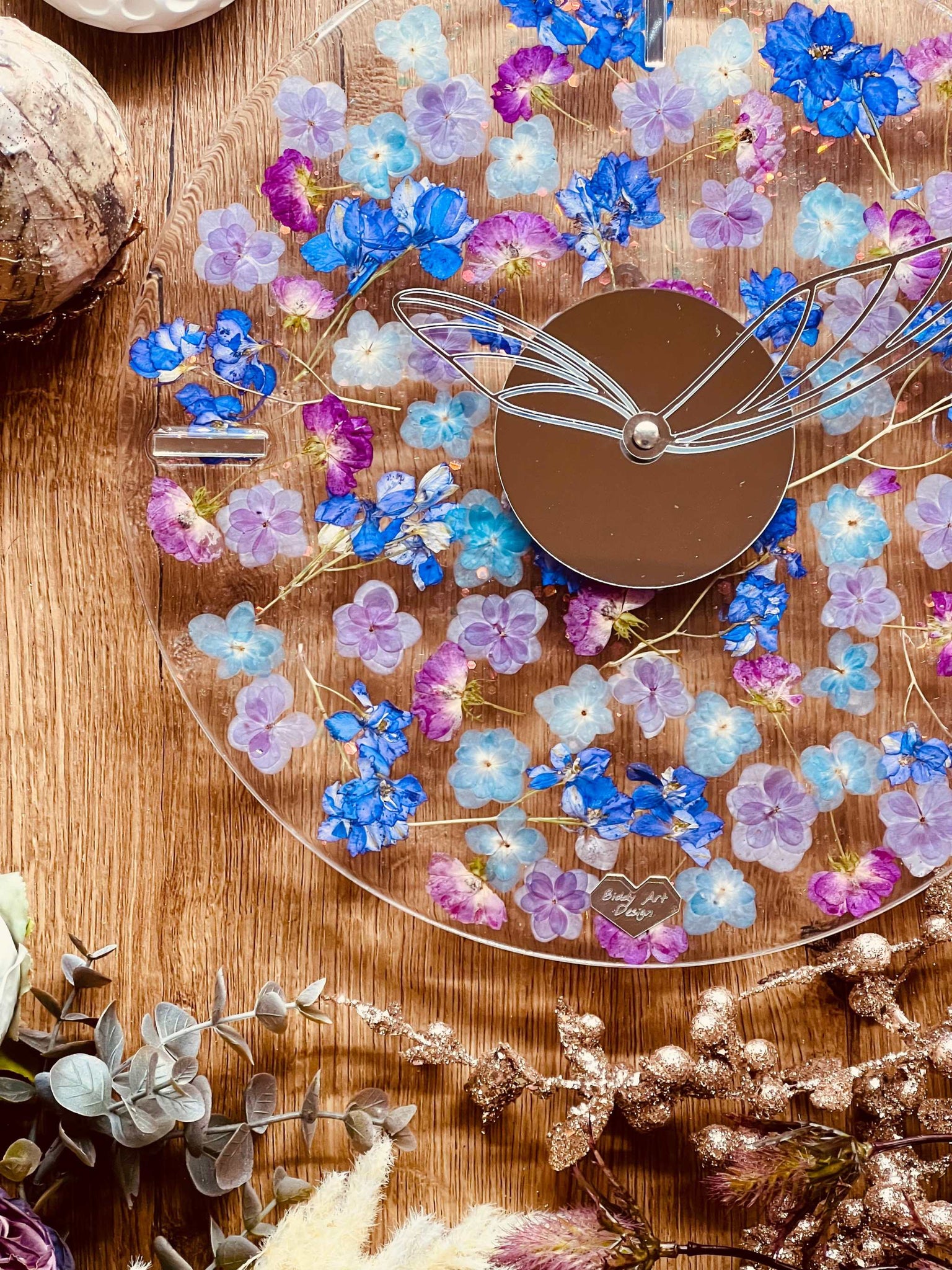 Handmade resin clock with numerous dried flowers and glitter. All my items are unique.
