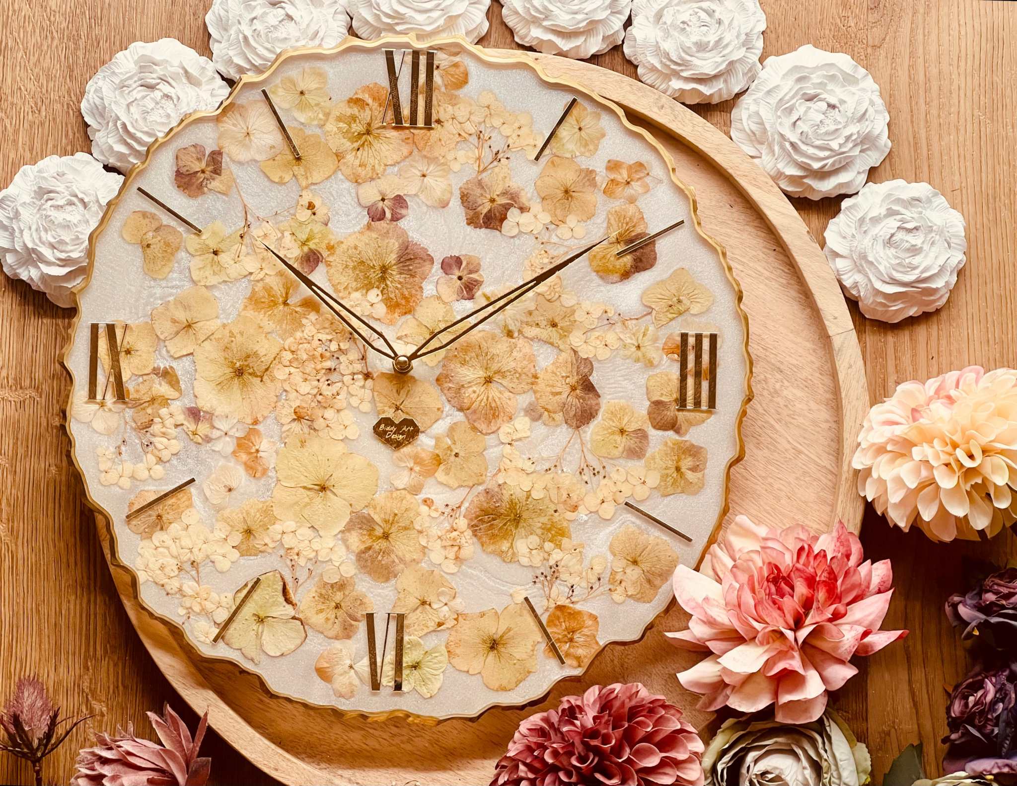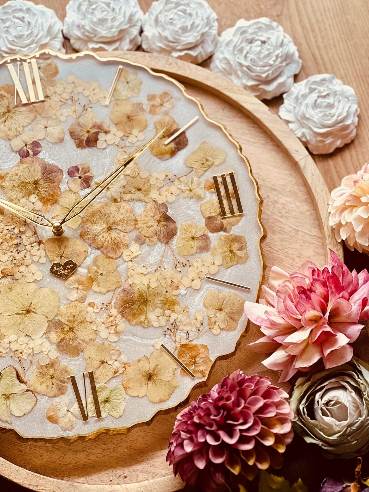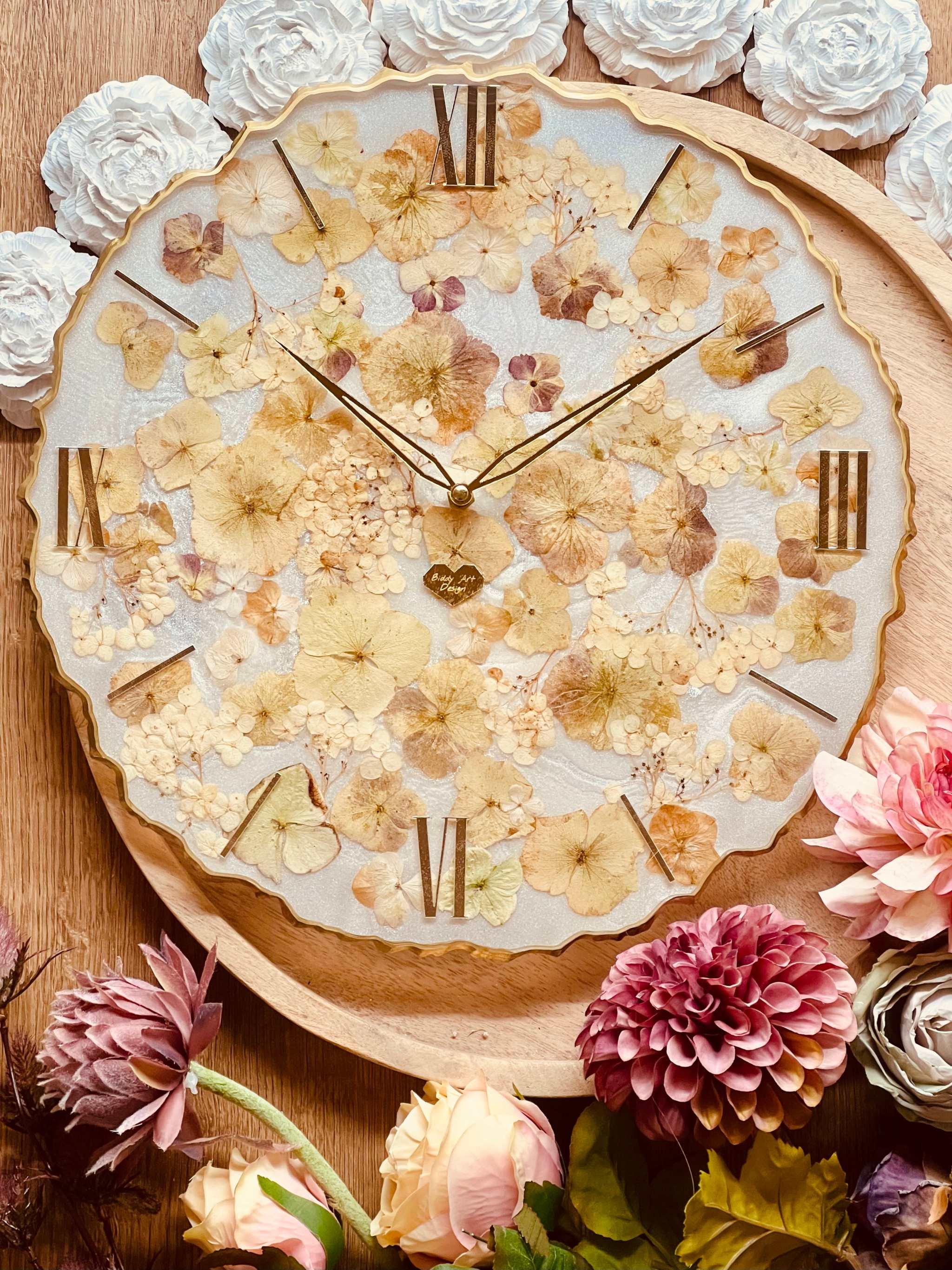 Handmade resin clock with numerous dried flowers. All my items are unique.