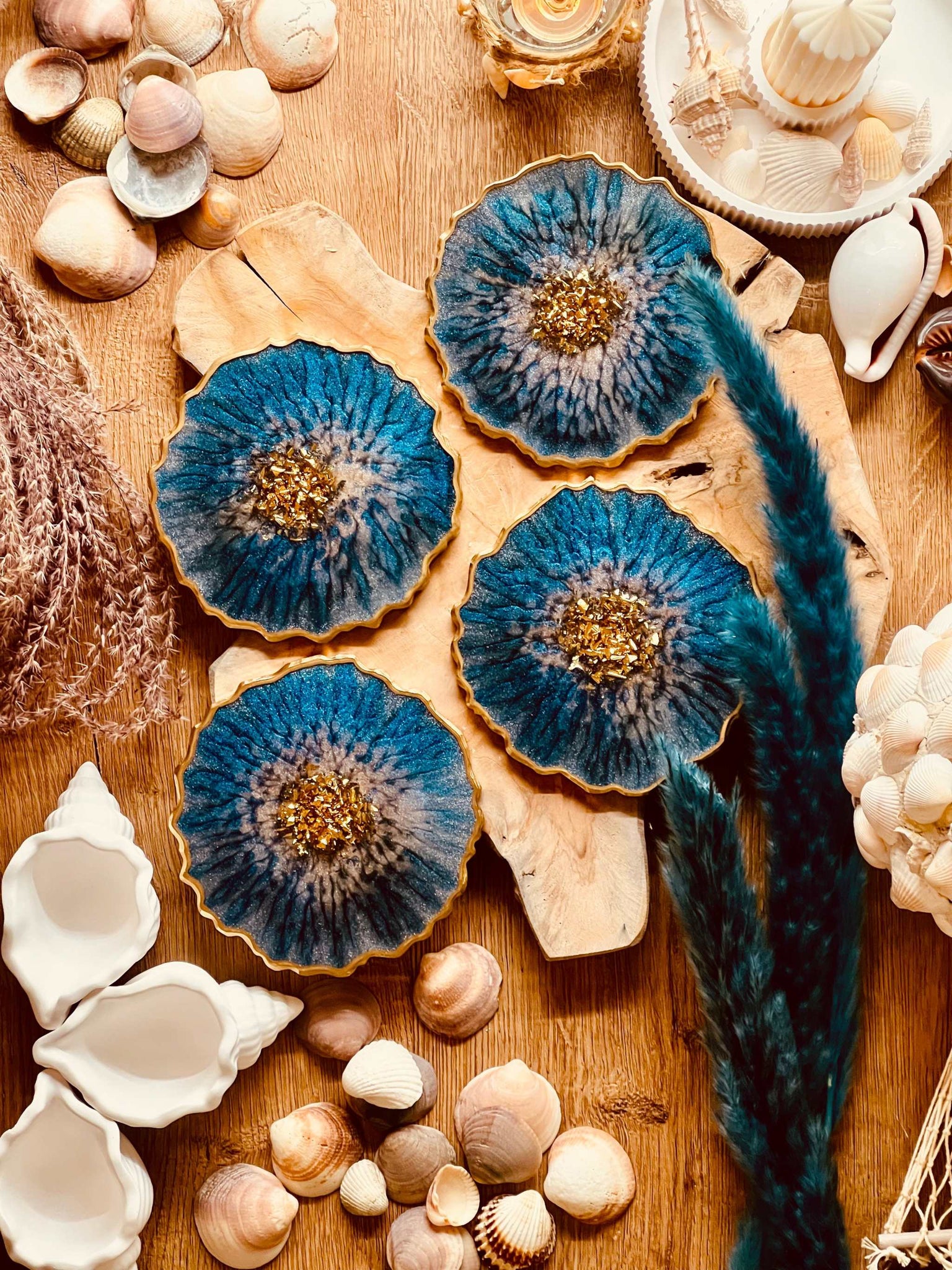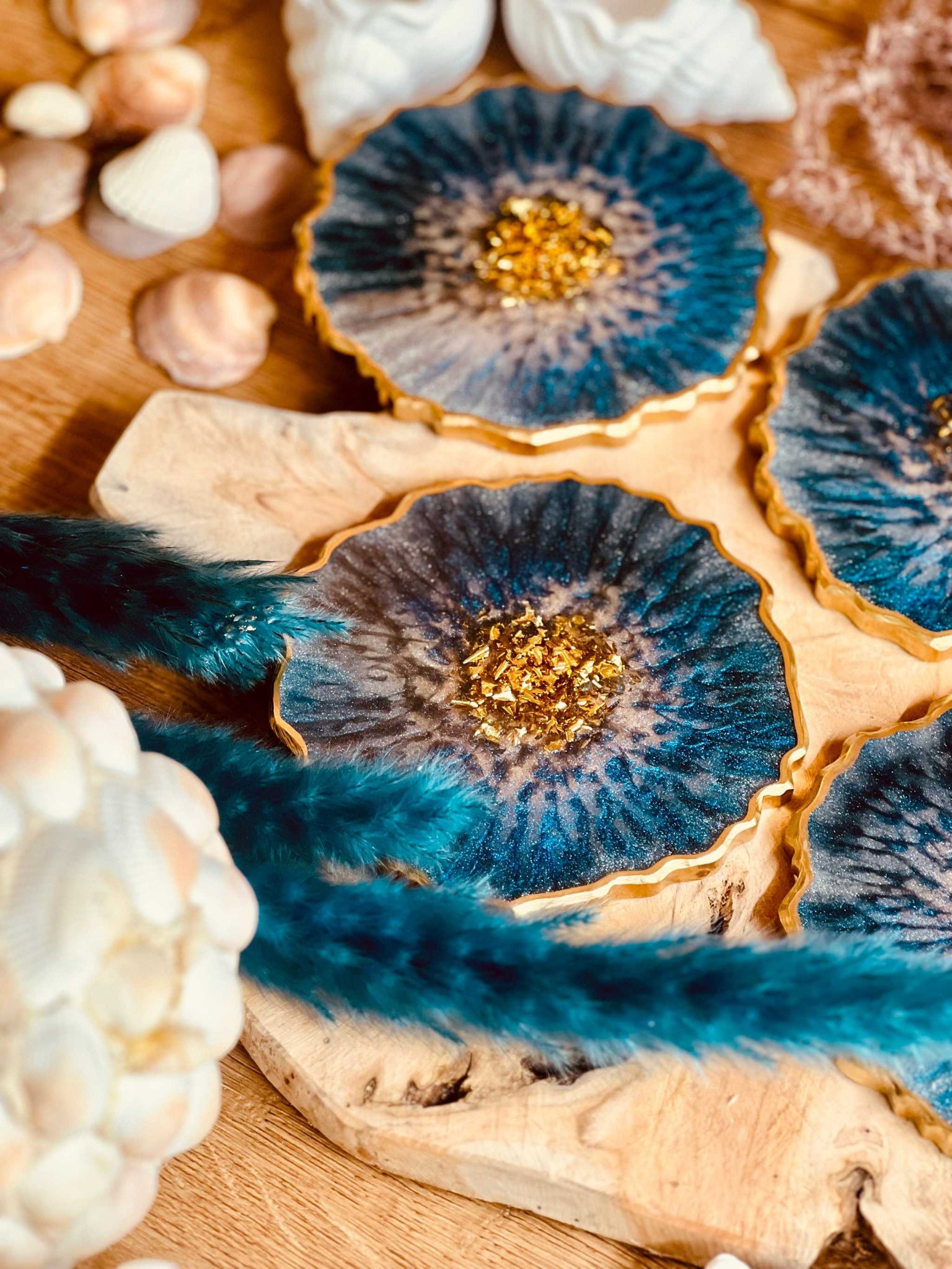 Handmade resin coasters in blue with golden details in a 4-piece set. All of my items are one-of-a-kind. These coasters are the perfect decoration on every table and an individual gift for your loved ones. Dimensions: diameter approx. 12cm.
