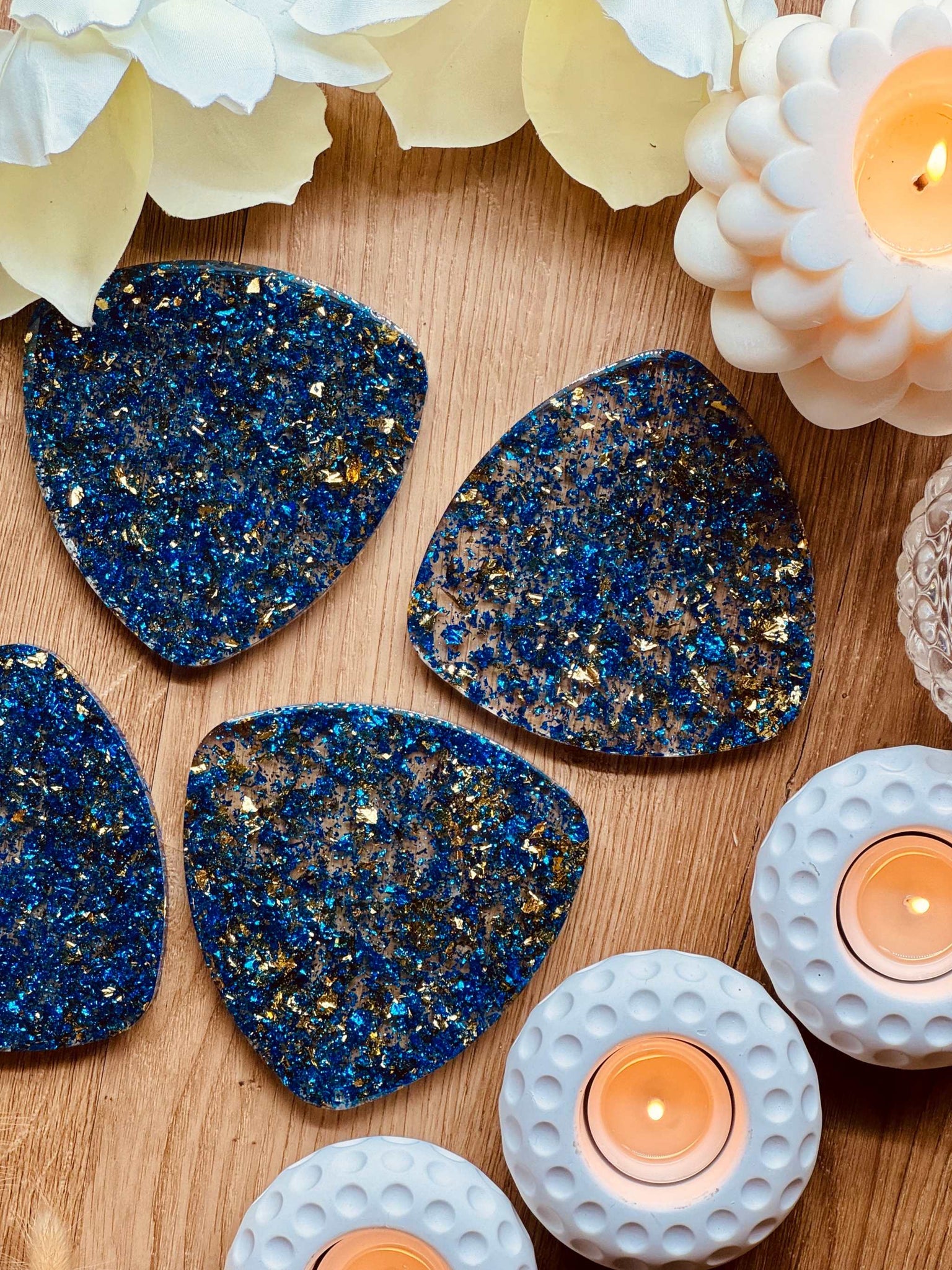 4 resin coasters in blue with gold
