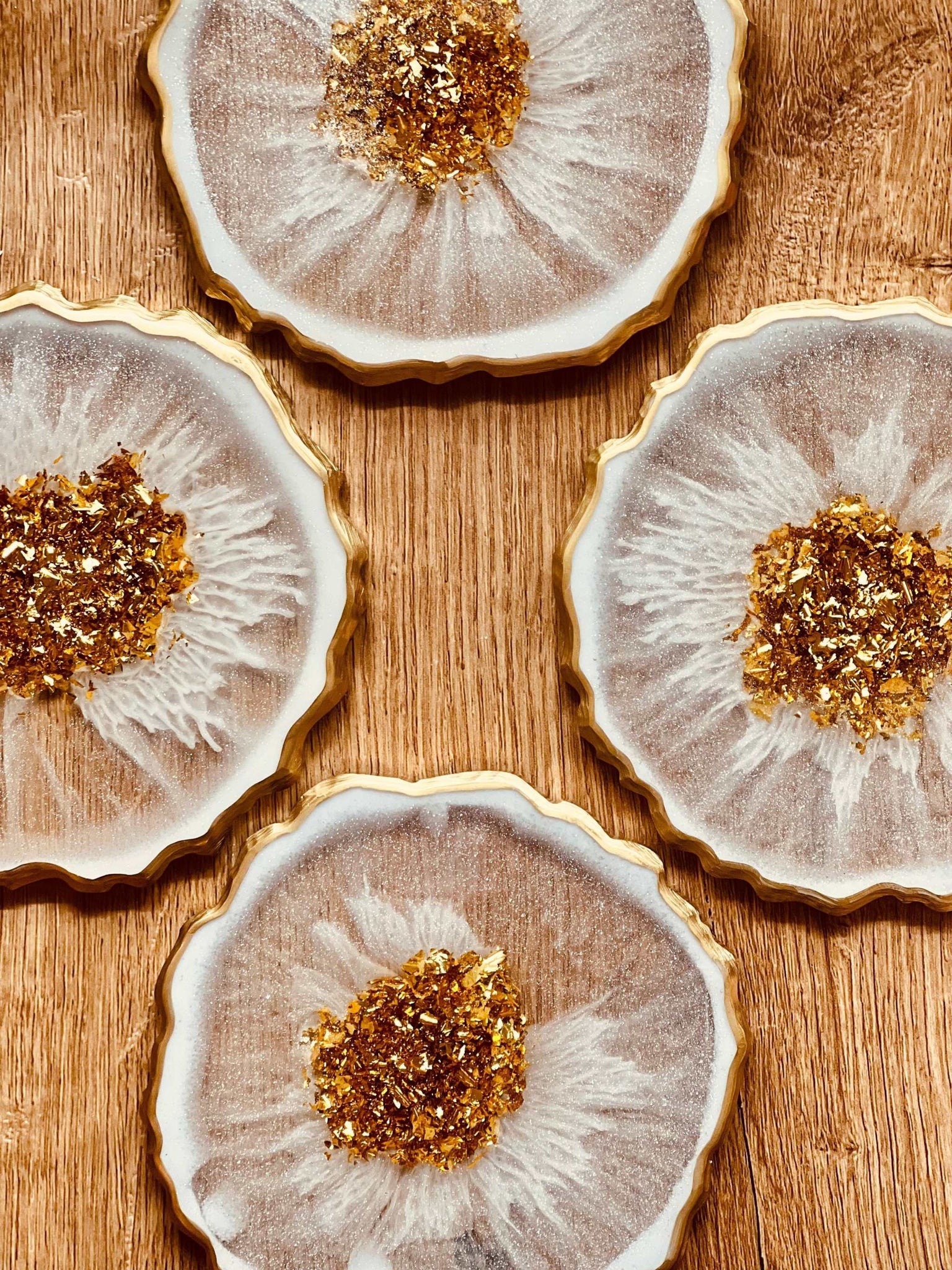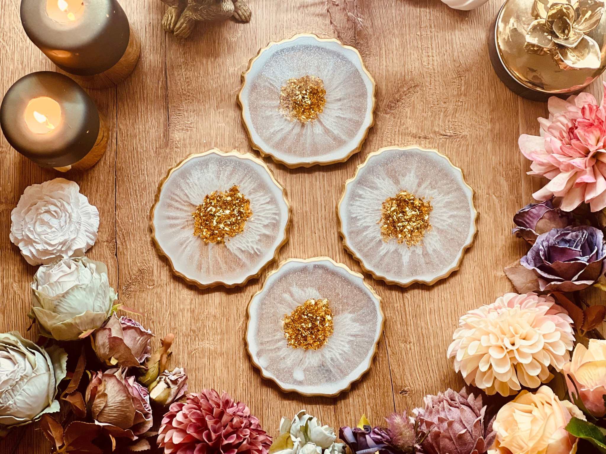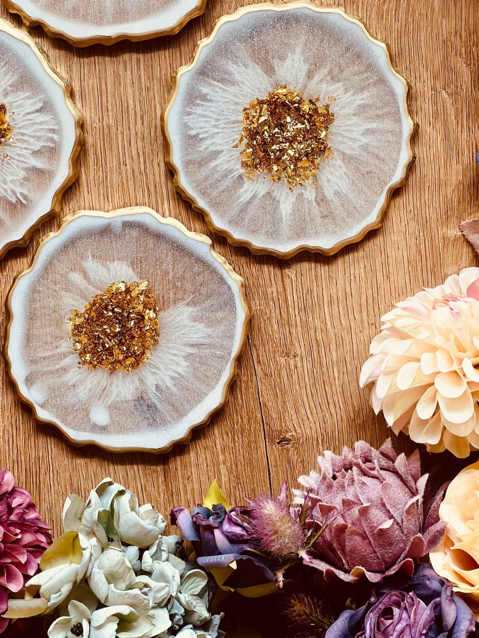 Glamorous handmade resin coasters in white with gold details in a set of 4. All of my items are unique. These coasters are the perfect decoration on any table and an individual gift for your loved ones.