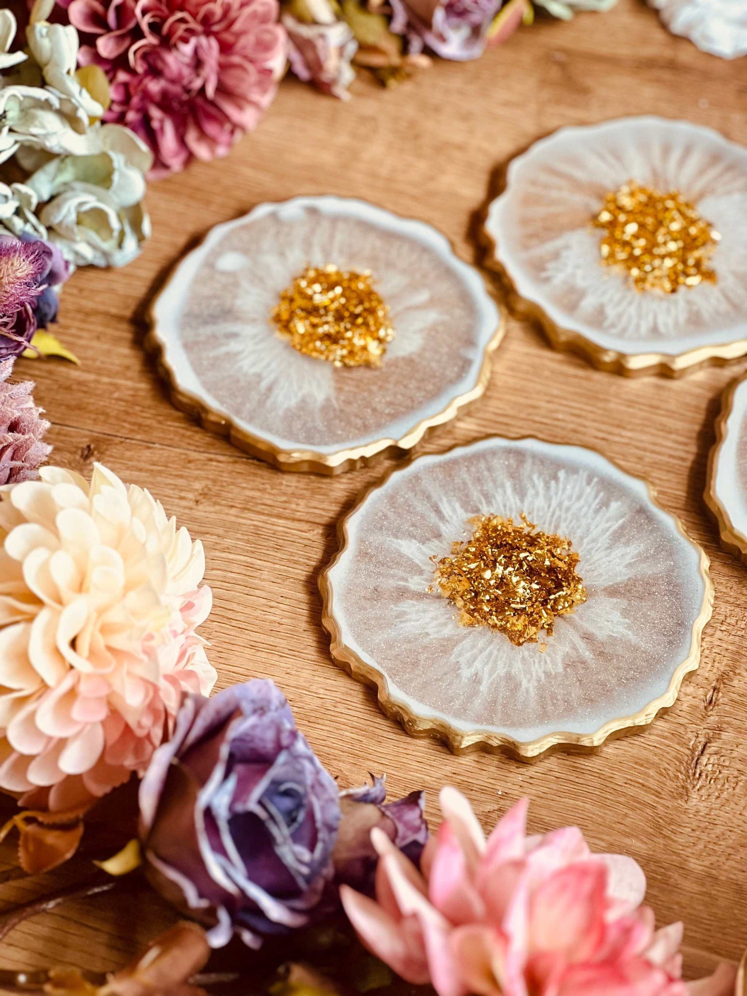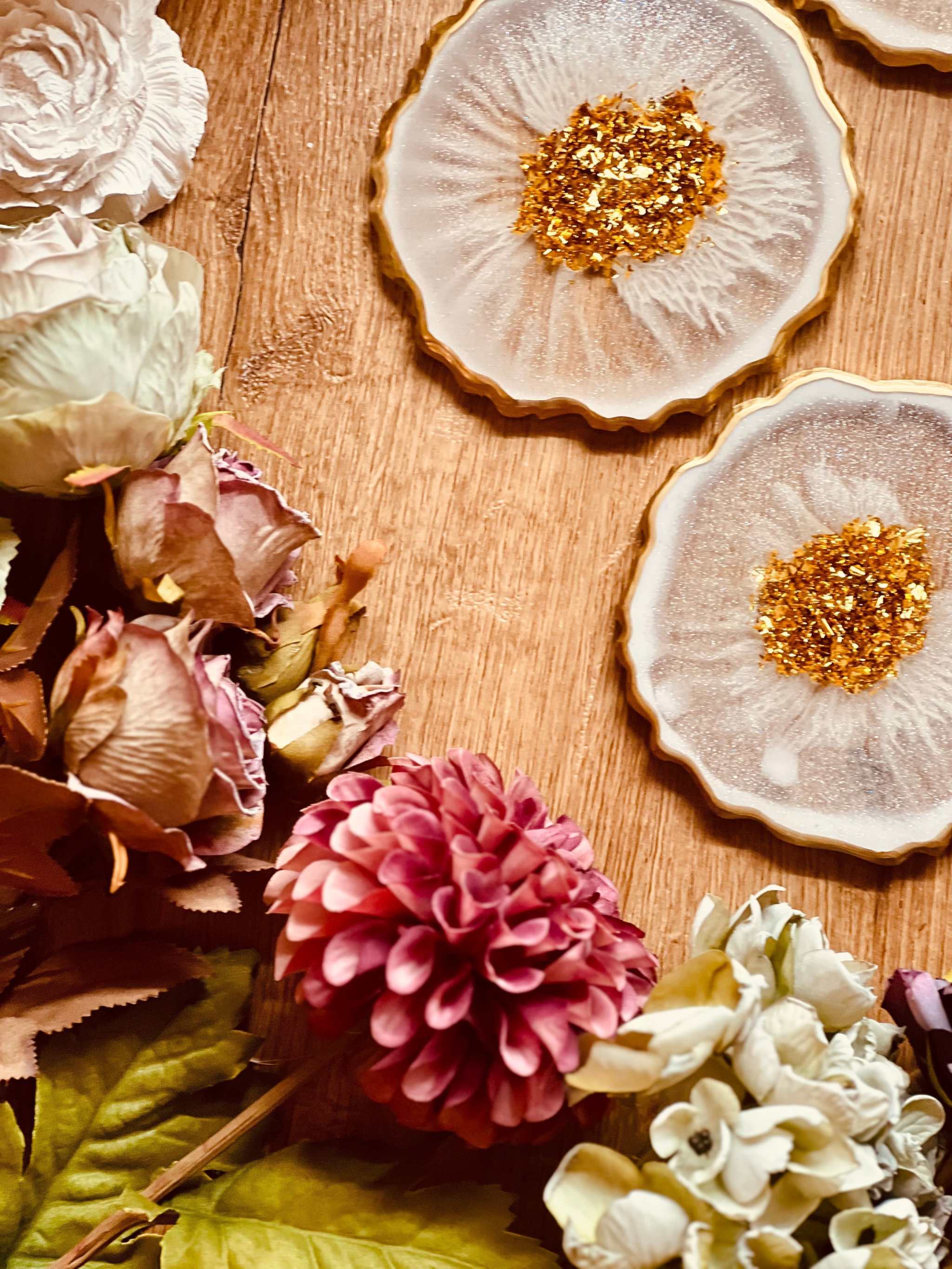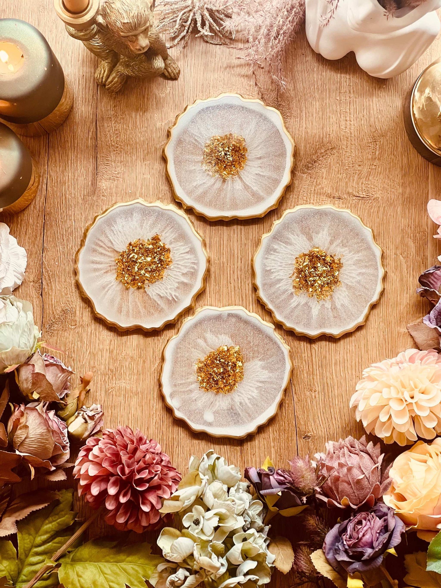 Glamorous handmade resin coasters in white with gold details in a set of 4. All of my items are unique. These coasters are the perfect decoration on any table and an individual gift for your loved ones.