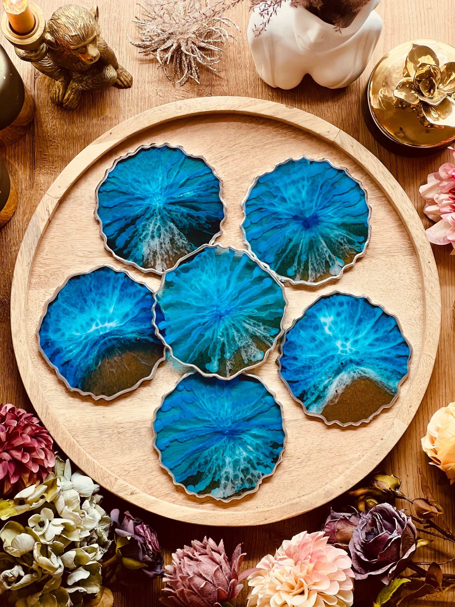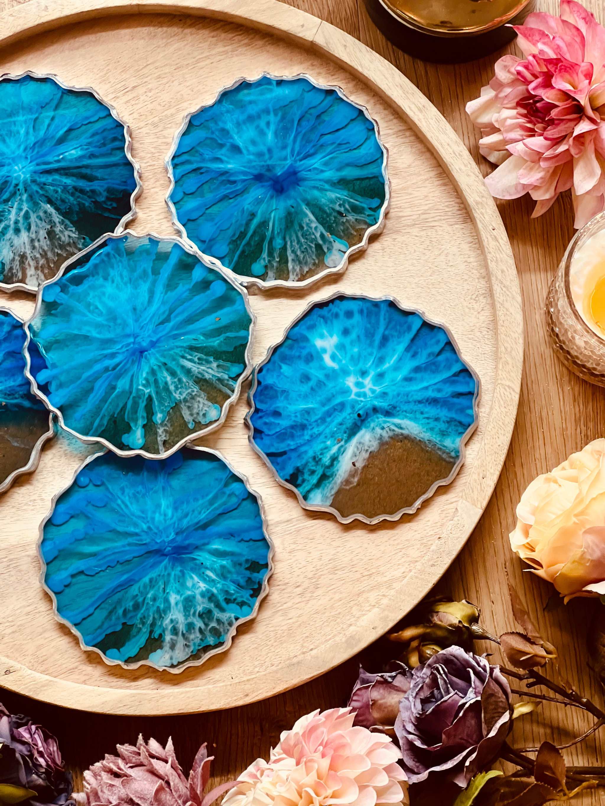 Handmade resin coasters in blue with silver details in a set of 6. All of my items are unique. These coasters are the perfect decoration on any table and an individual gift for your loved ones. Dimensions: diameter approx. 12cm.