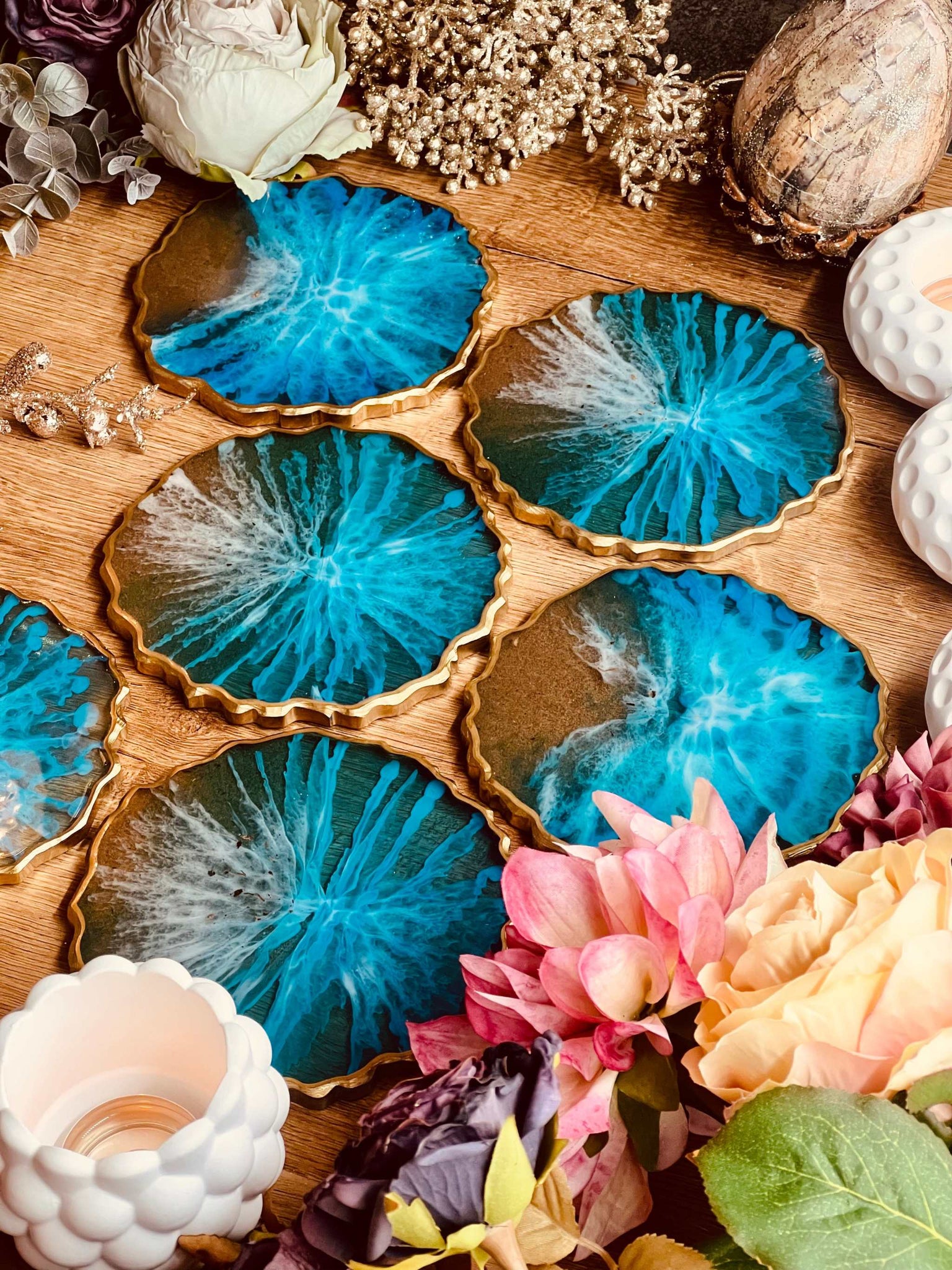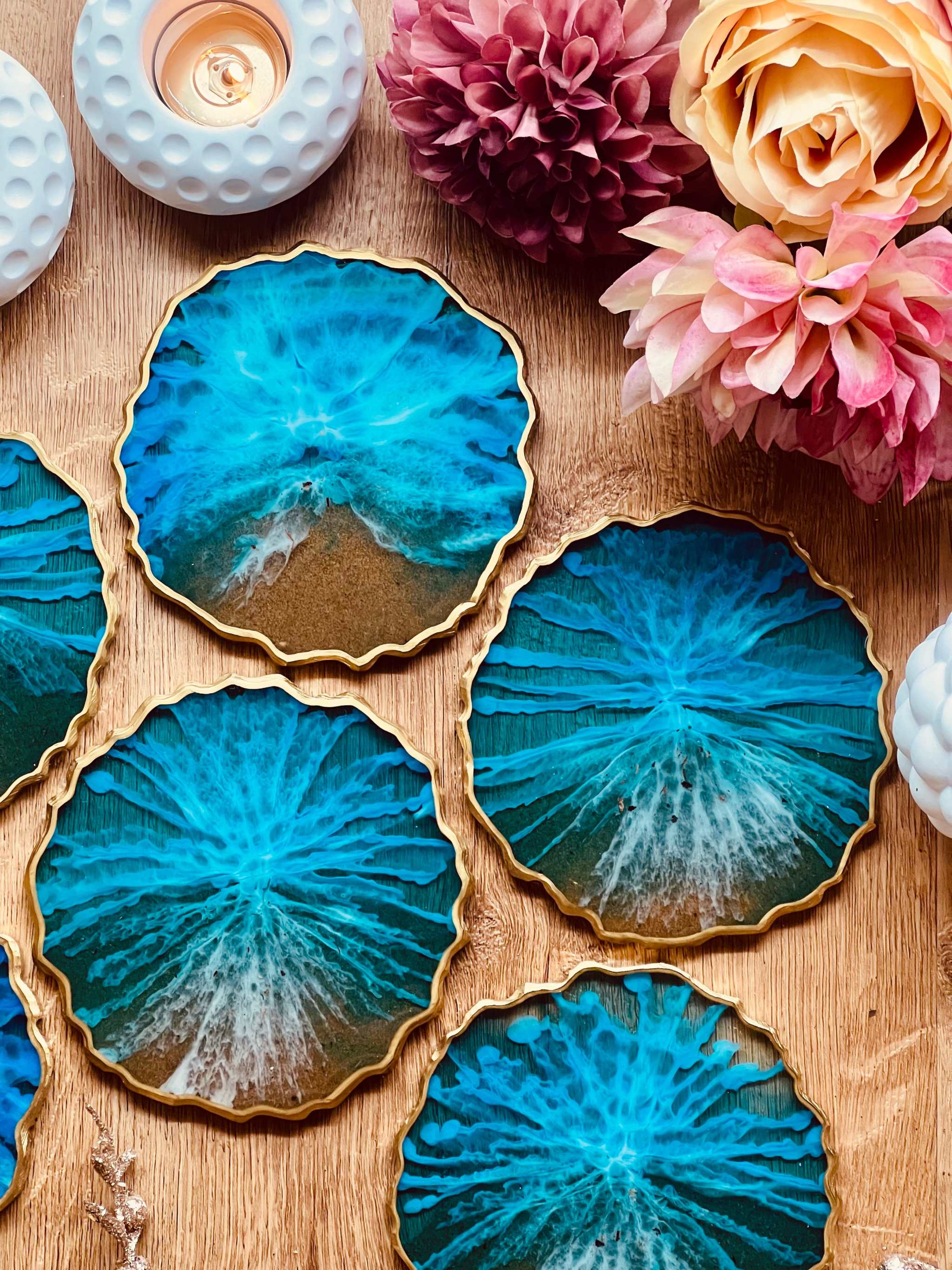 Handmade resin coasters in blue with gold details in a set of 6. All of my items are unique. These coasters are the perfect decoration on any table and an individual gift for your loved ones. Dimensions: diameter approx. 12cm.