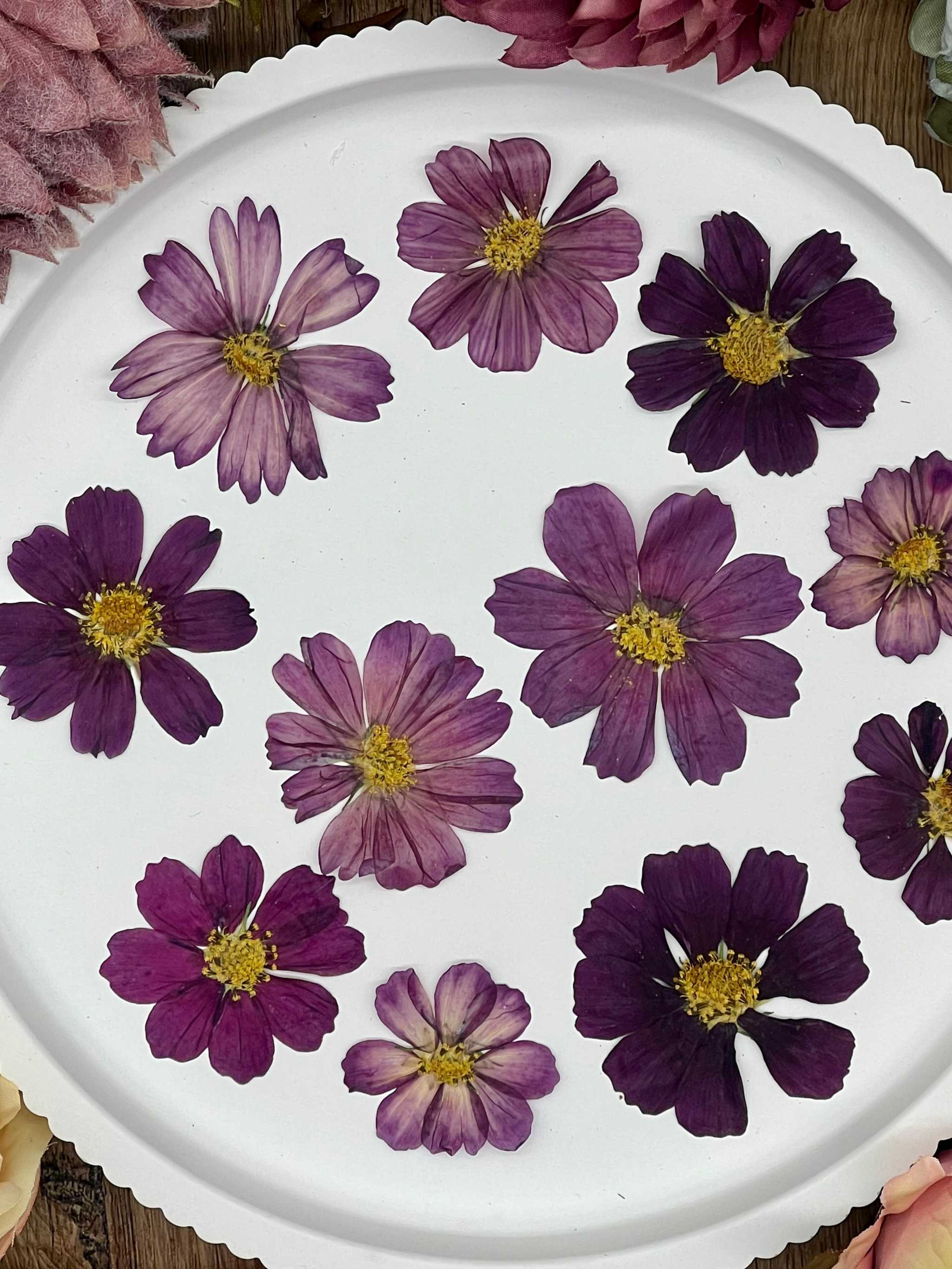 These dried flowers are a wonderful addition to creative projects! The 12 hand-pressed Cosmos flowers in burgundy impress with their fine structure and elegant color - perfect for resin art, jewelry, candles or scrapbooking. Their deep red nuance makes them a classy eye-catcher for artistic designs.