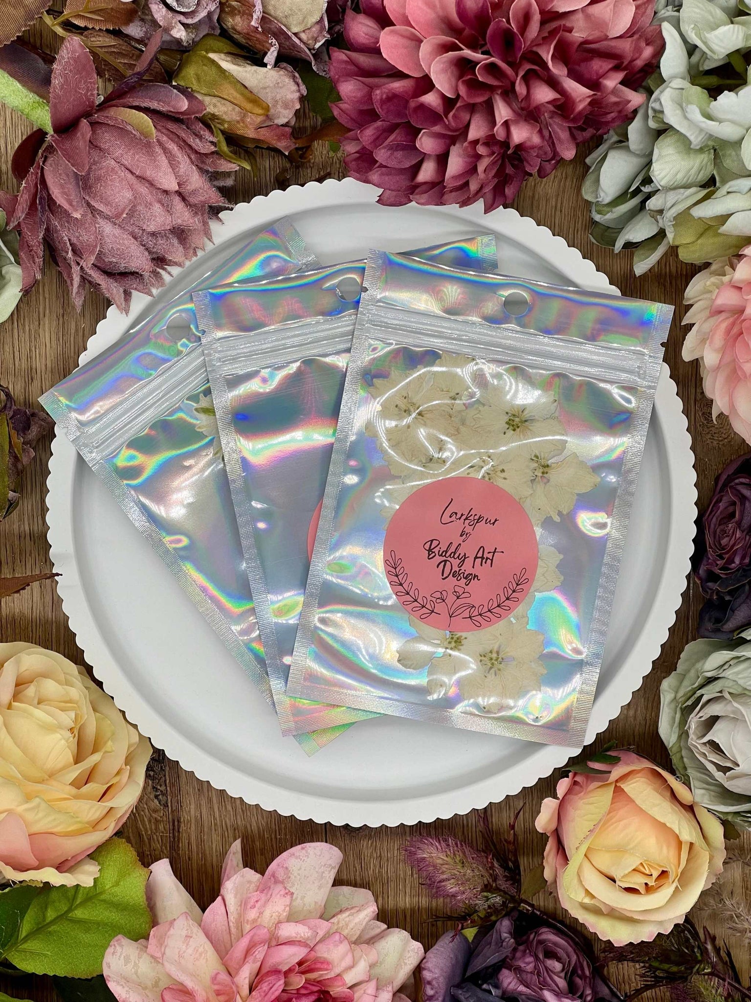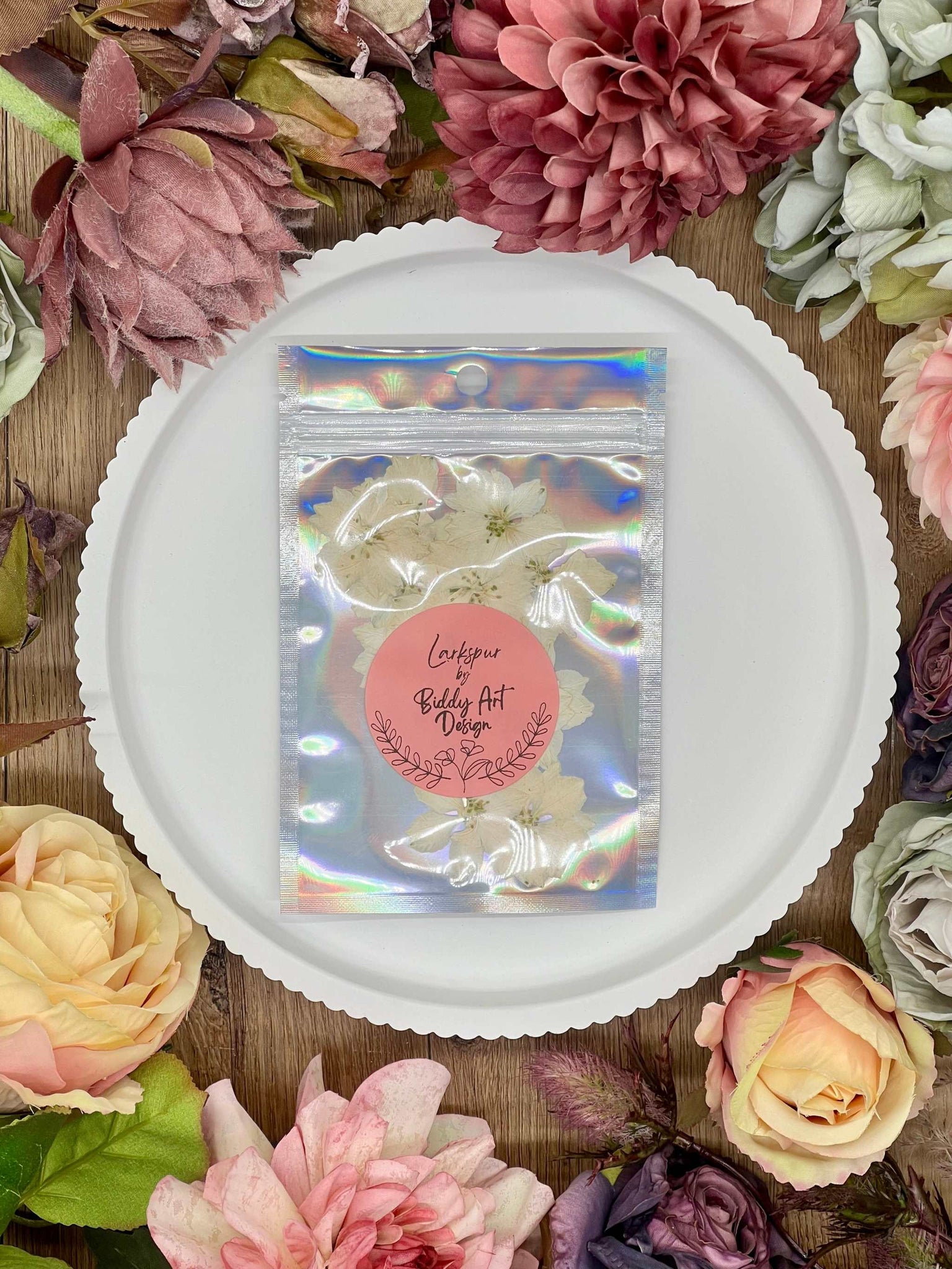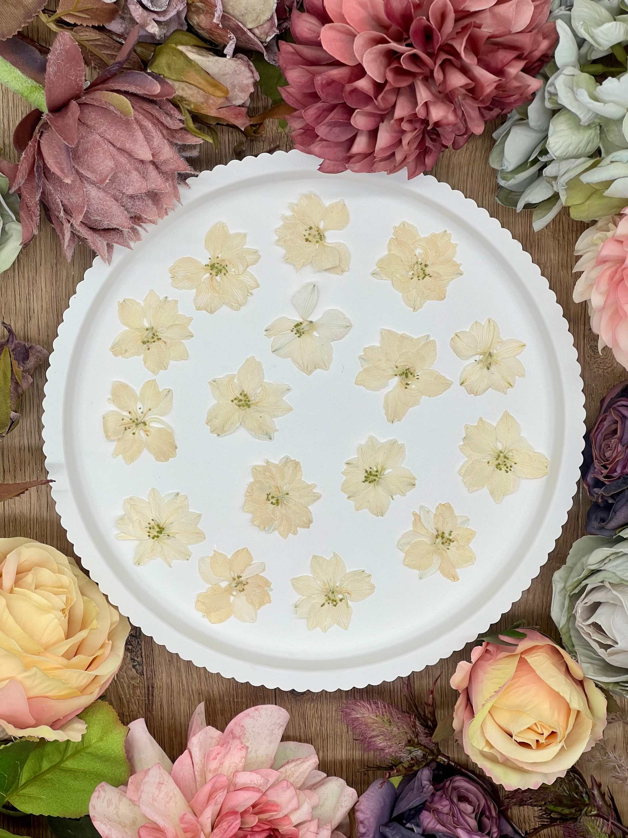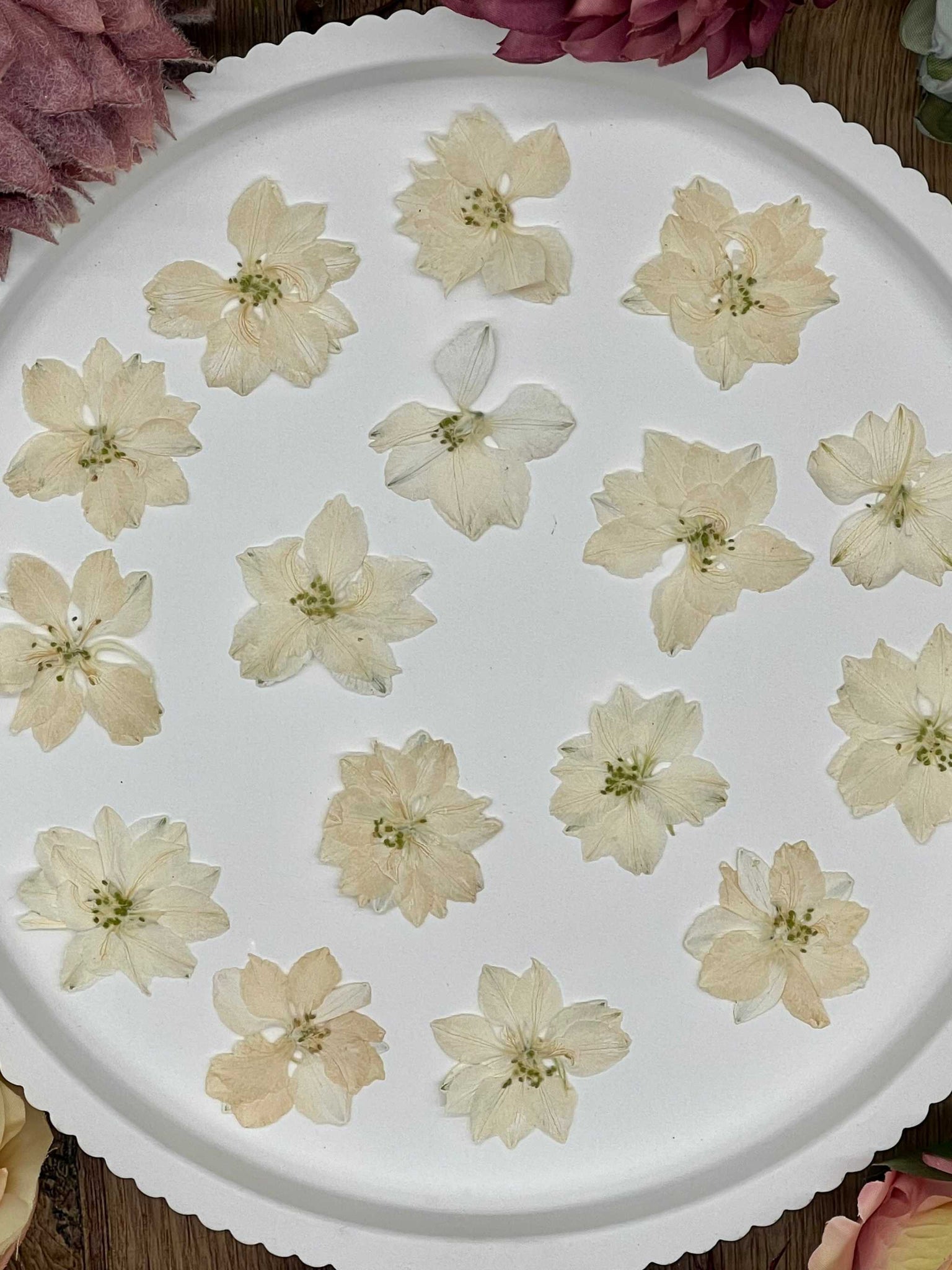 ✔ 12 hand-pressed Larkspur flowers – brilliant white for elegant designs