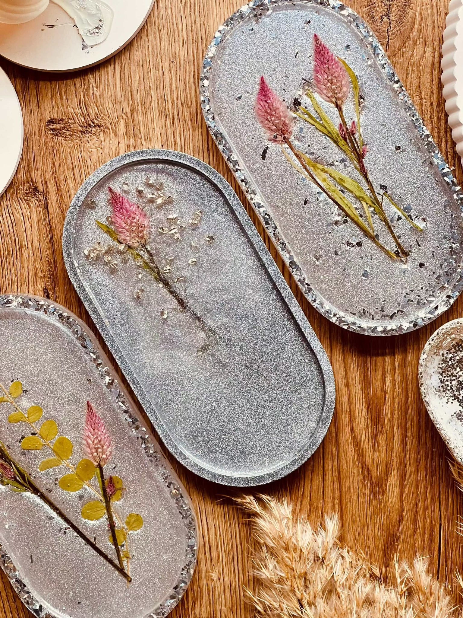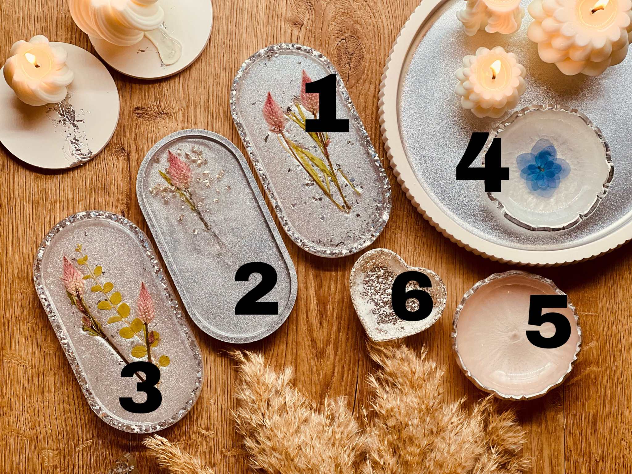 Handmade resin jewelry or ring trays in white with silver details and flowers. All of my items are one-of-a-kind. Jewelry bowls are the perfect decoration in any bathroom or bedroom and an individual gift for your loved ones.