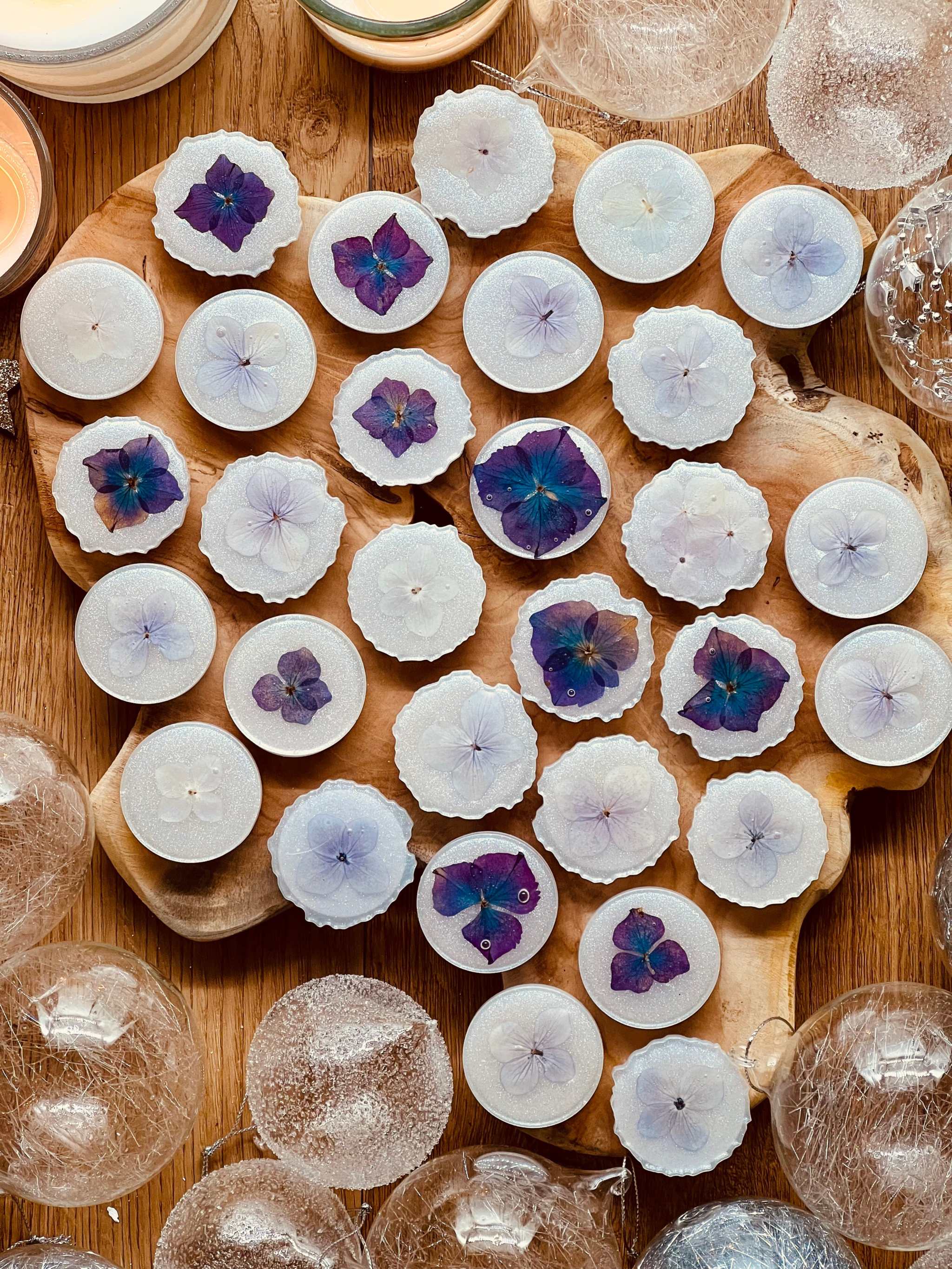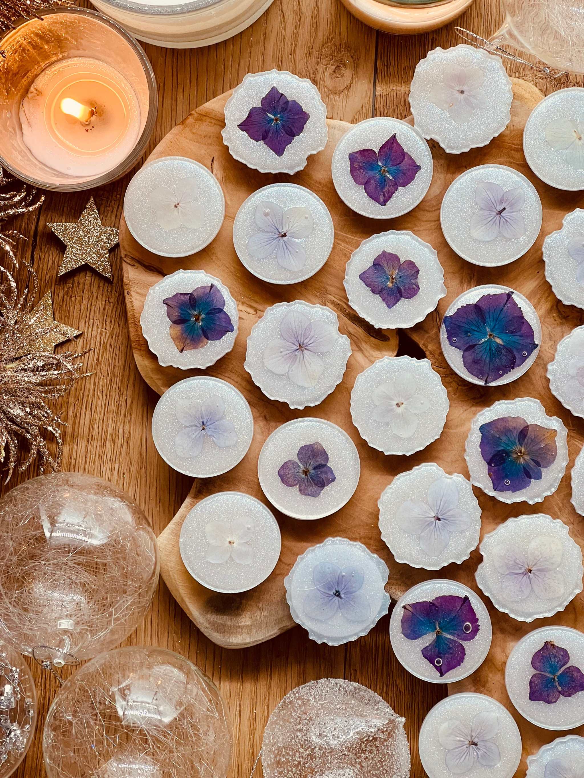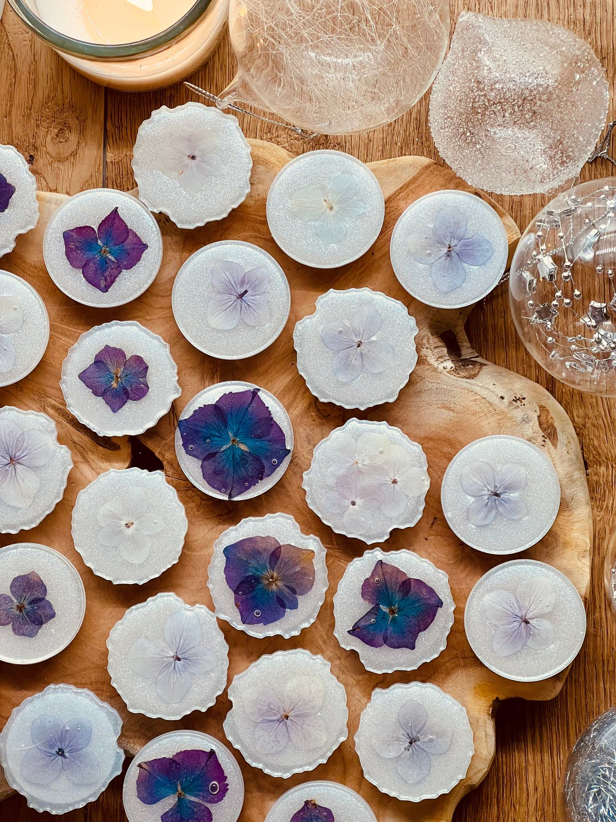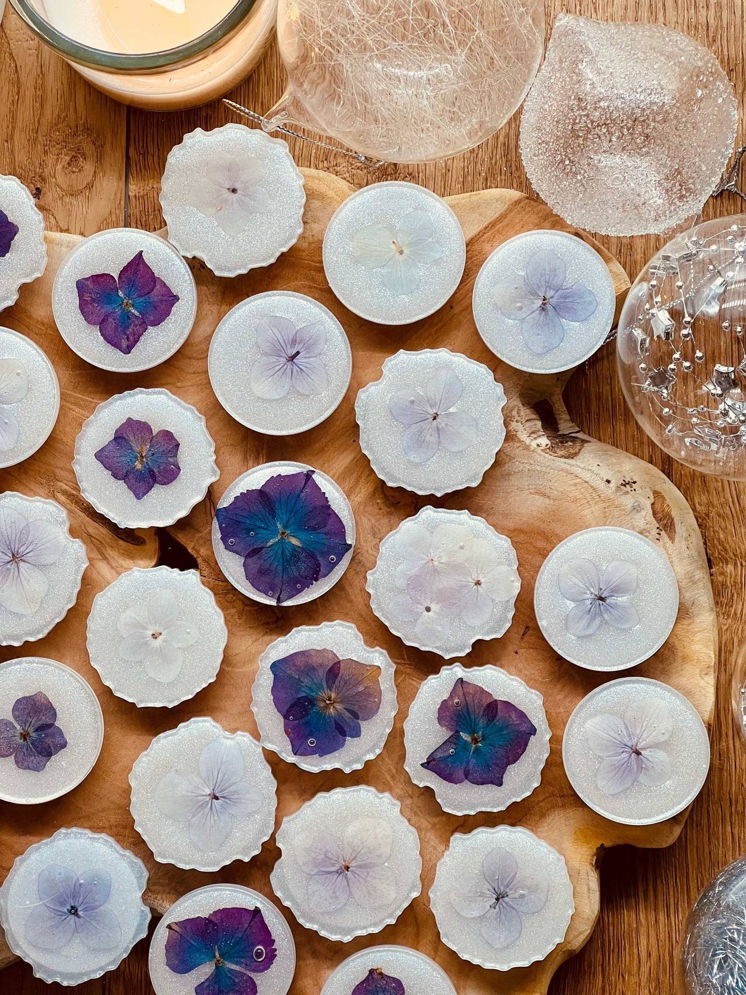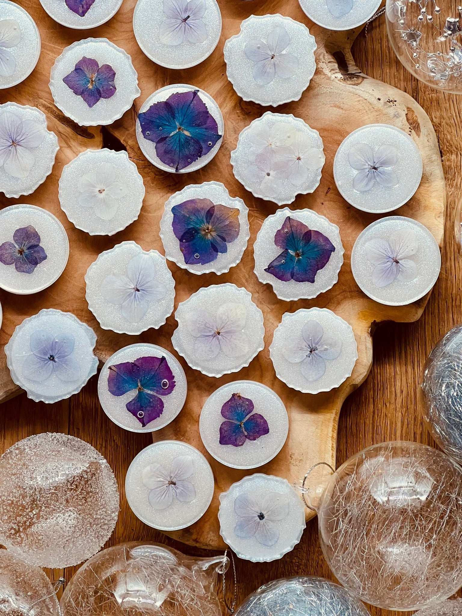 This handmade cell phone holder with purple hydrangeas is not only practical, but also a real eye-catcher! The real purple hydrangea flowers are artfully incorporated into high-quality resin and make each piece unique.