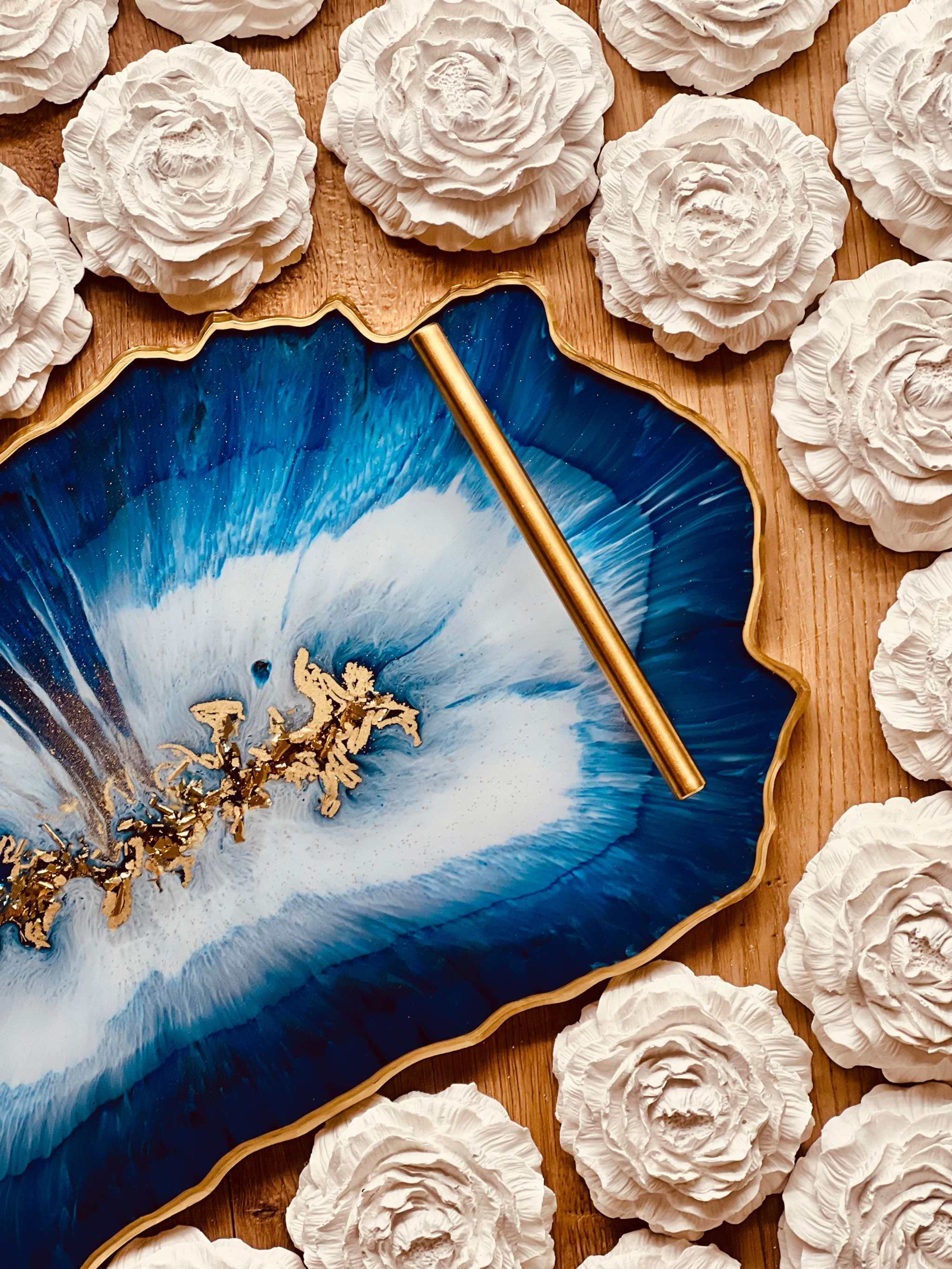 Handmade tray made of resin in blue and white with gold details. All of my items are unique. Trays are the perfect decoration on any table or piece of furniture and an individual gift for your loved ones. Dimensions: approx. 40x23cm