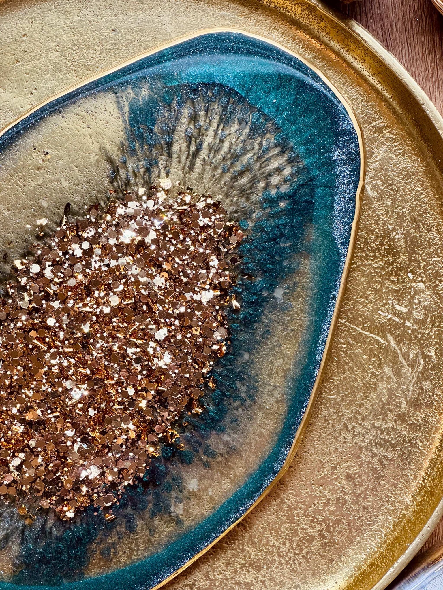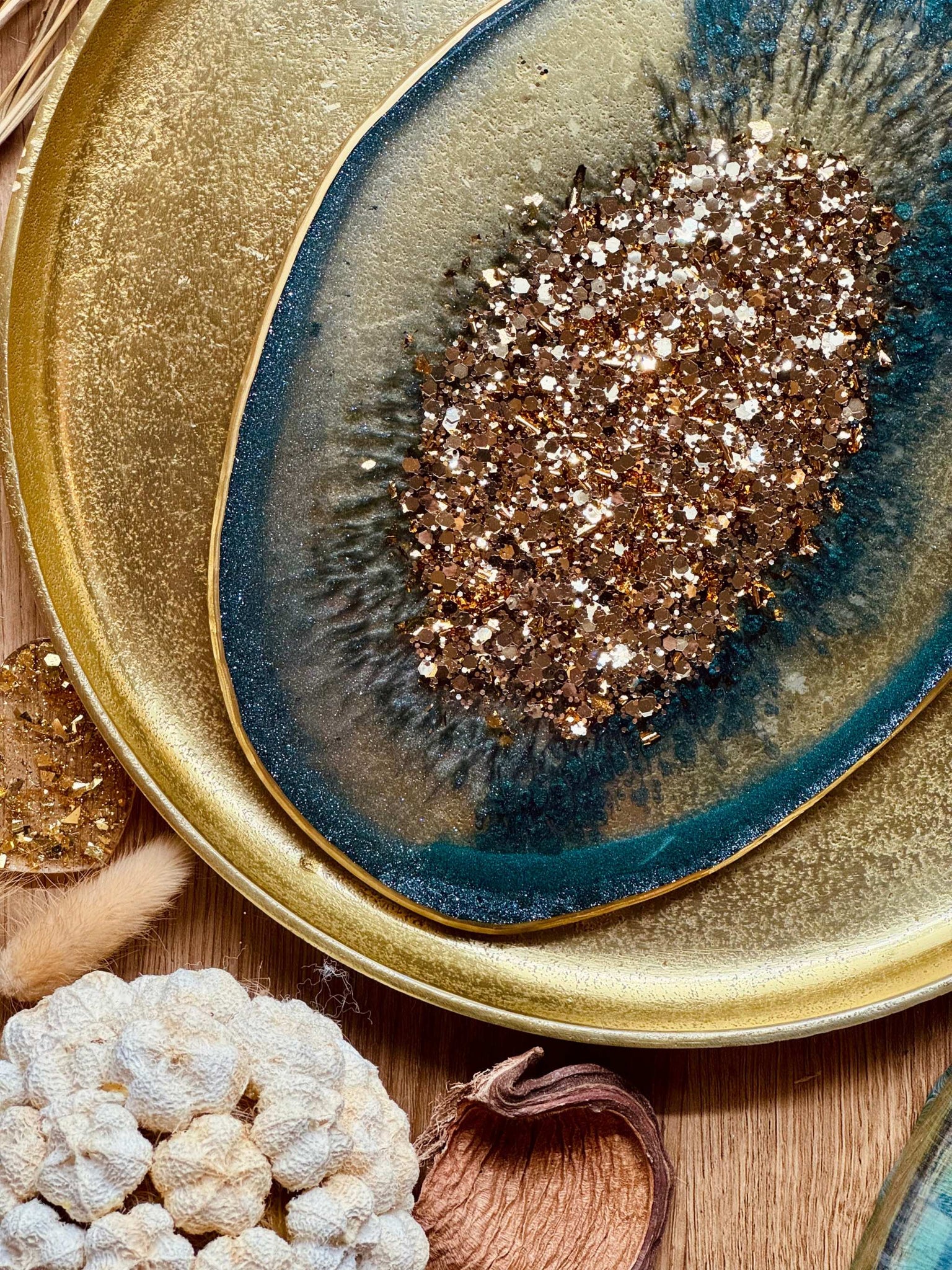Handmade tray made of resin in green with gold details. All my items are unique. Trays are the perfect decoration on any table or piece of furniture and an individual gift for your loved ones. Dimensions: approx. 26x18cm
