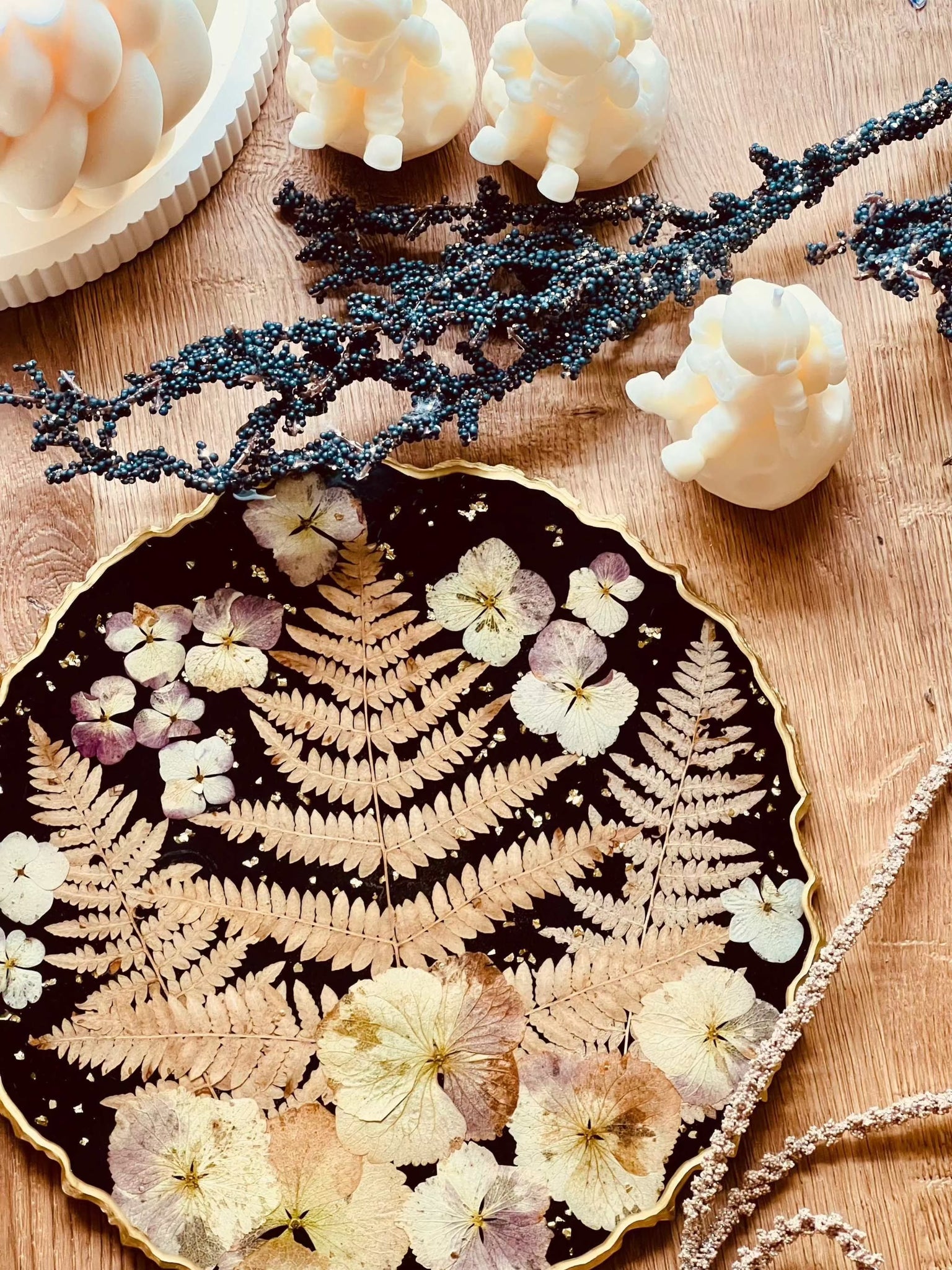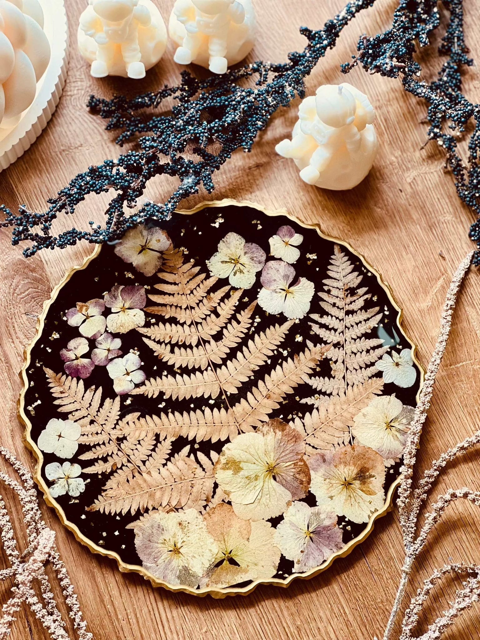 Handmade resin tray in black and silver details and blue hydrangeas. All of my items are one-of-a-kind. Trays are the perfect decoration on any table or piece of furniture and an individual gift for your loved ones. Dimensions: Approx. 35cm