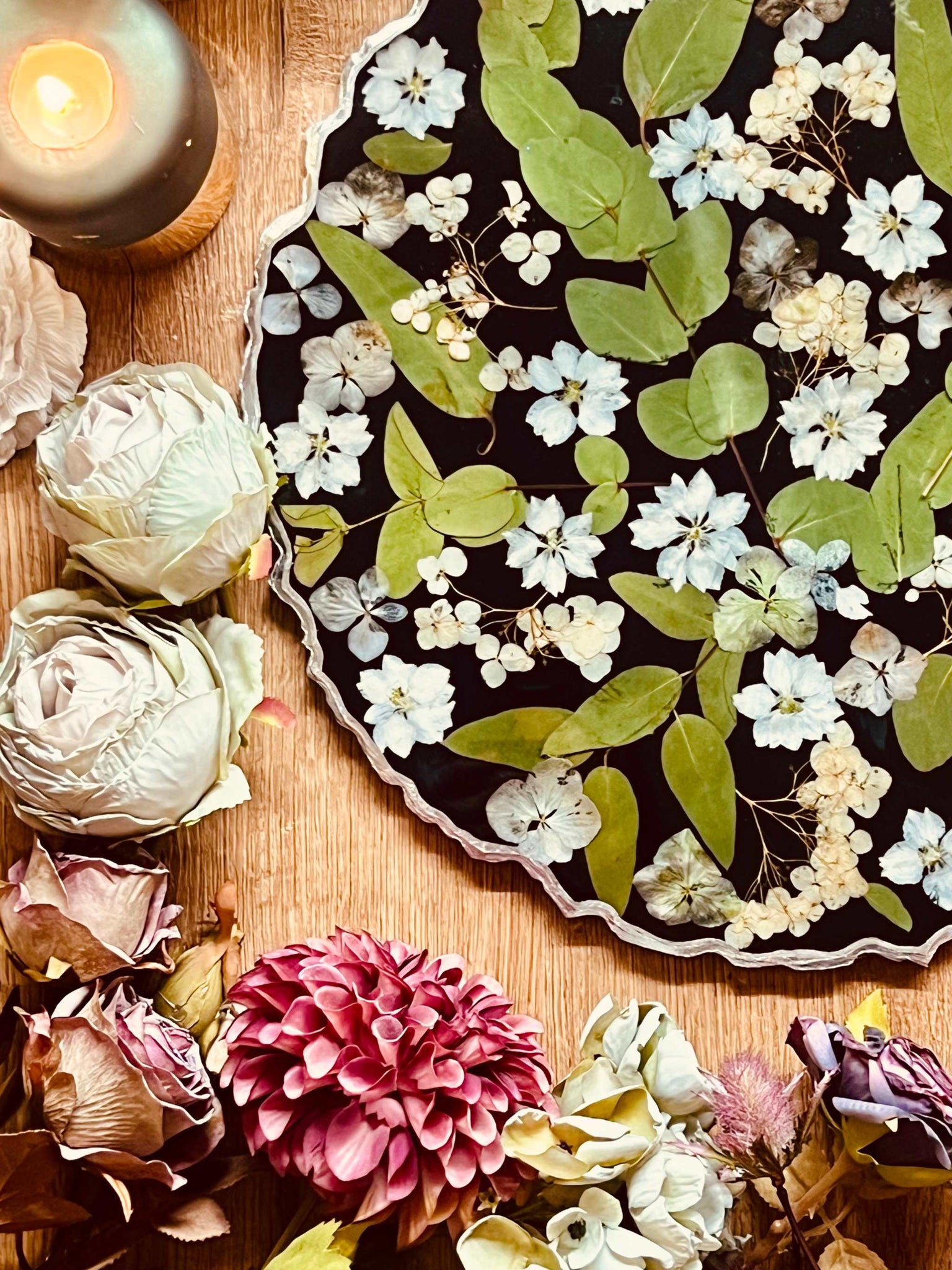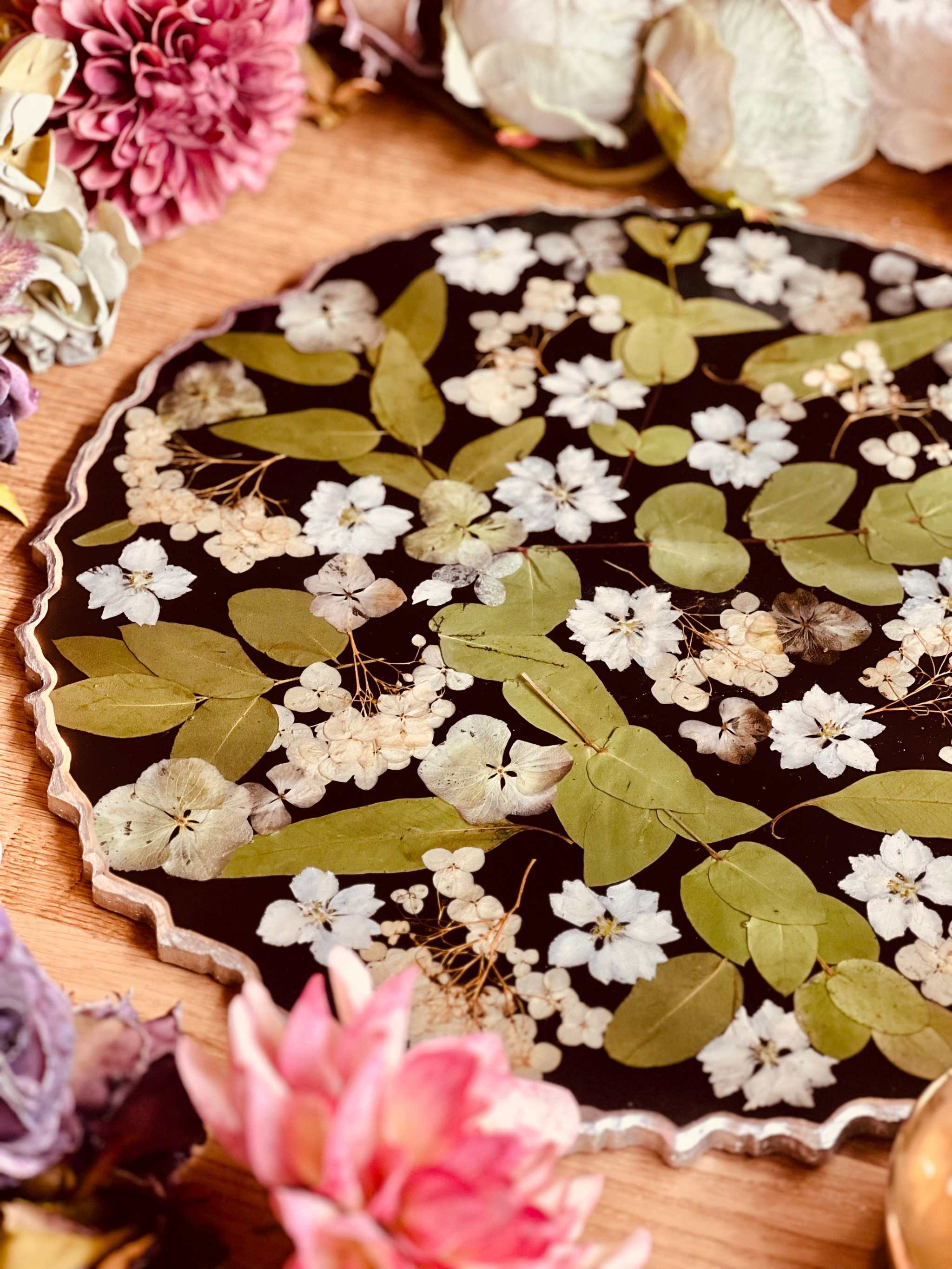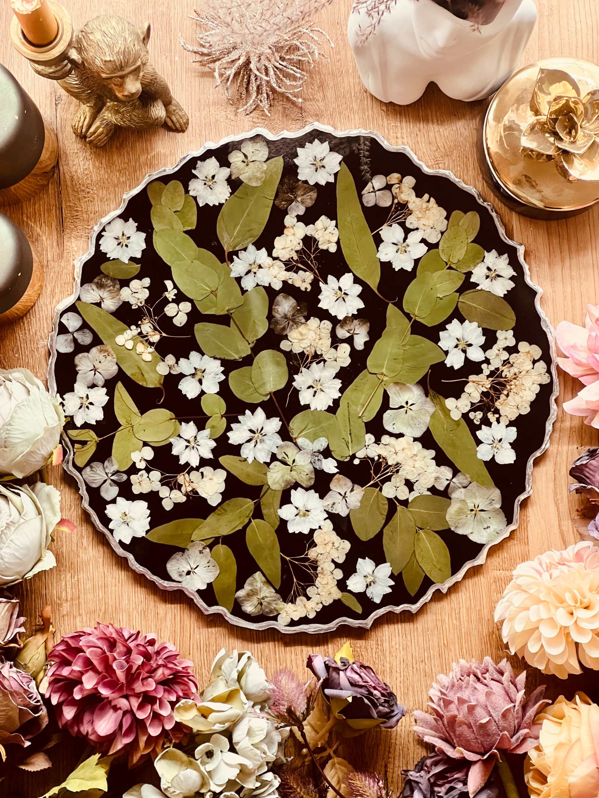 Handmade tray made of resin in black and silver details and eucalyptus and hydrangeas. All my items are unique. Trays are the perfect decoration on any table or piece of furniture and an individual gift for your loved ones. Dimensions: approx. 35cm