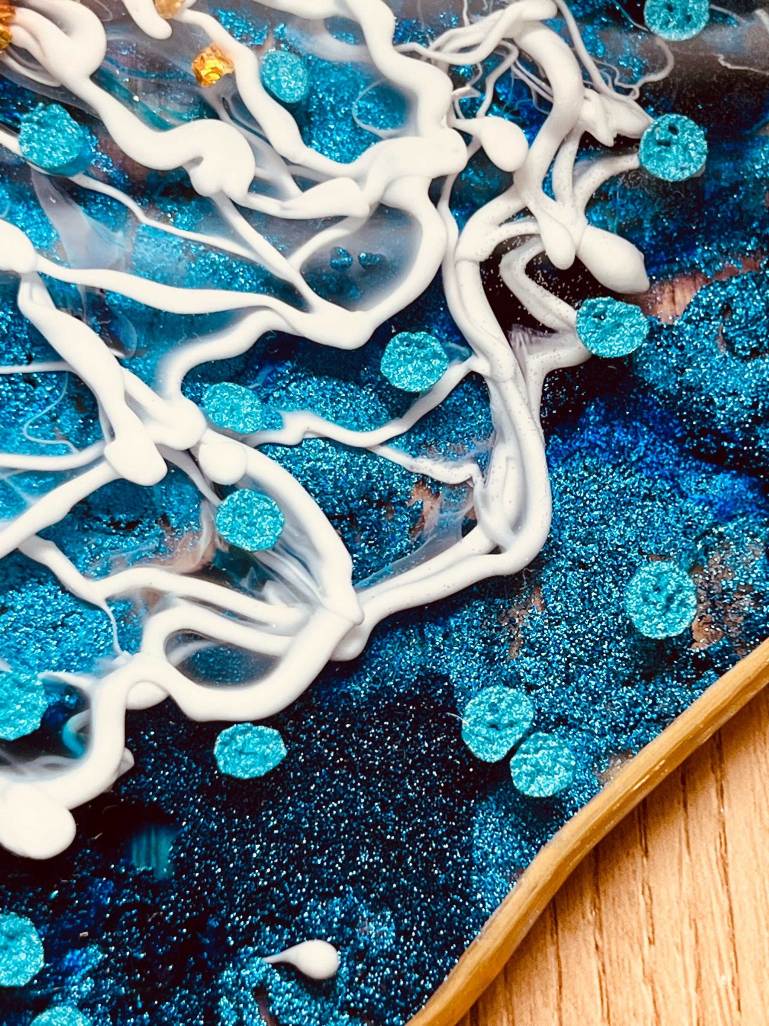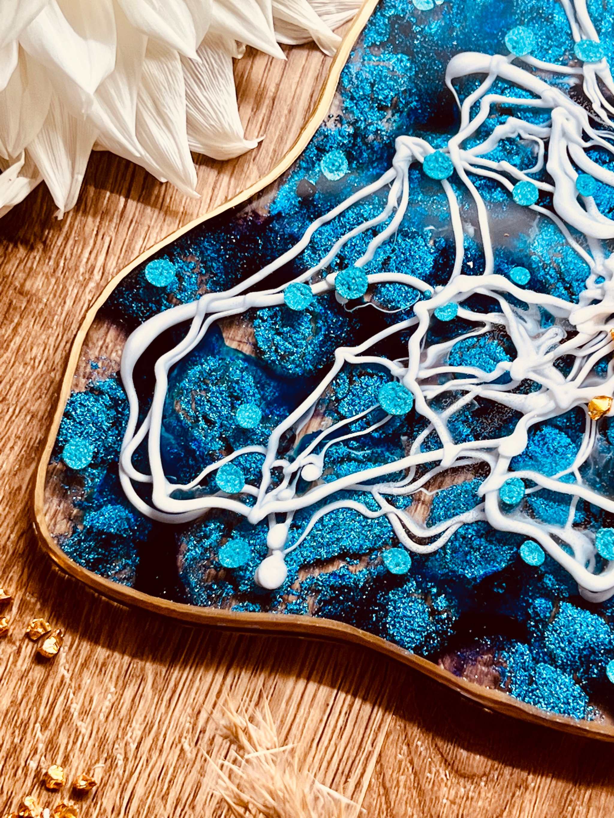Handmade resin tray in blue with golden details. All of my items are one-of-a-kind. Trays are the perfect decoration on any table or piece of furniture and an individual gift for your loved ones. Dimensions: Approx. 40x22cm