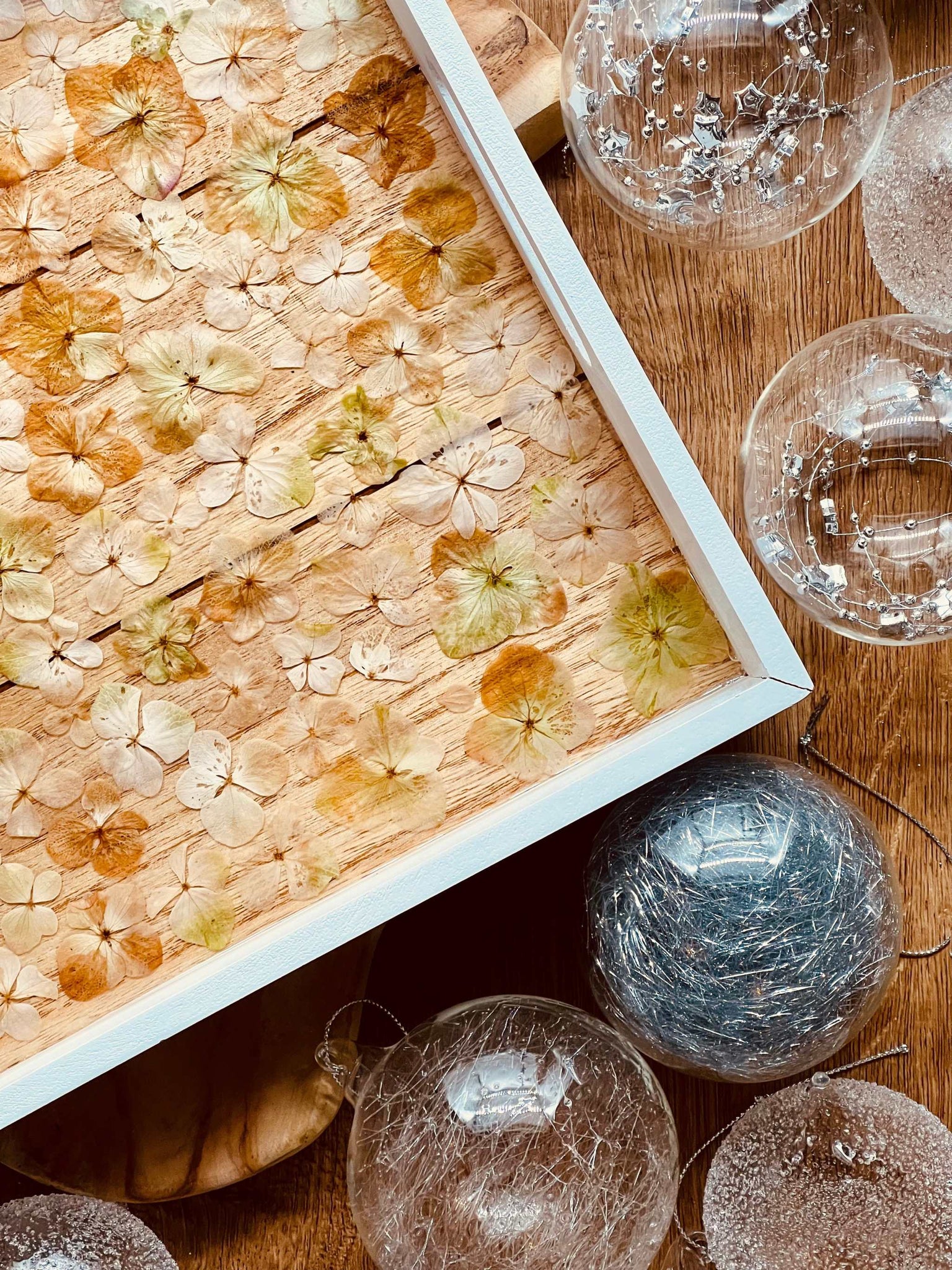 Handmade wooden tray refined with resin and hydrangeas. All of my items are one-of-a-kind. Trays are the perfect decoration on any table or piece of furniture and an individual gift for your loved ones. Dimensions: Approx. 27x27cm
