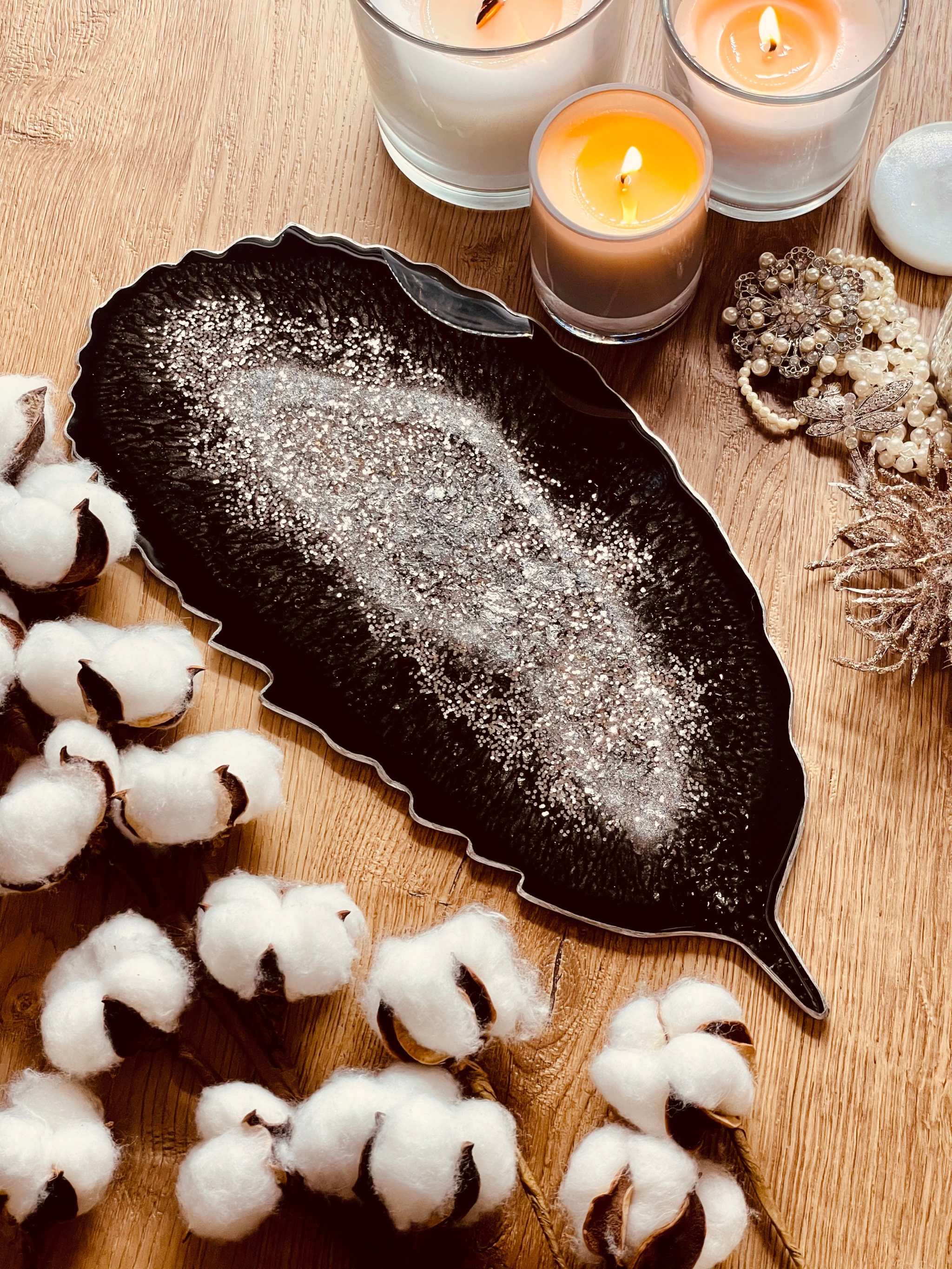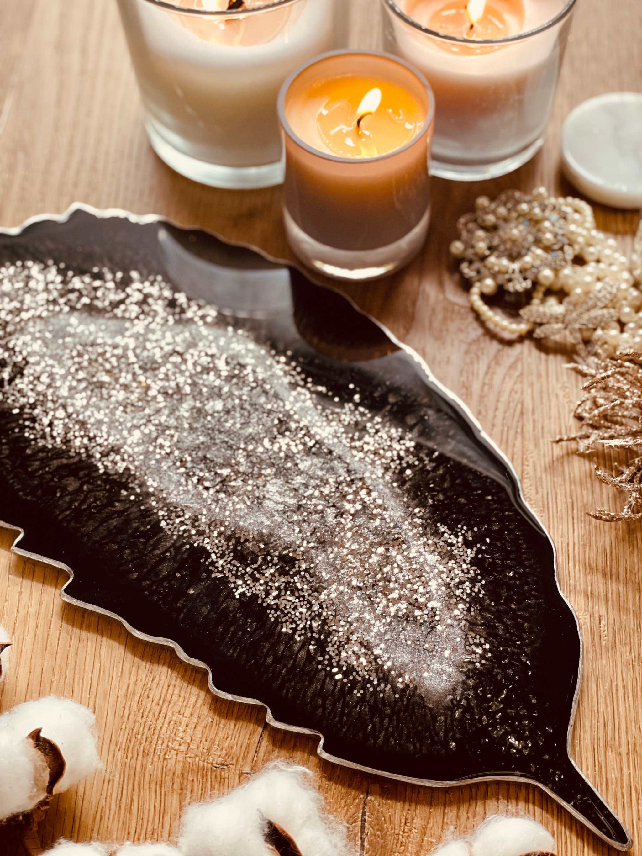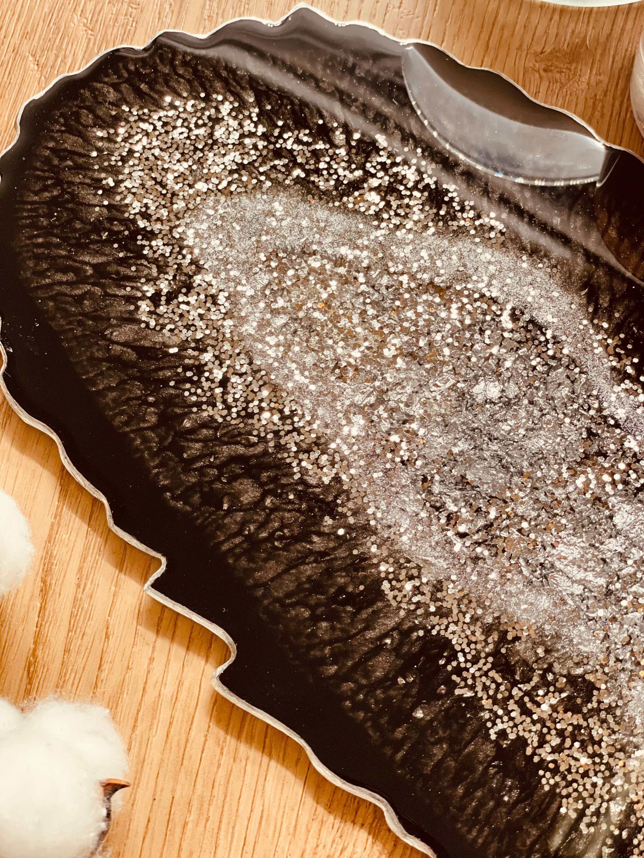 Handmade resin tray in black with silver details. All of my items are one-of-a-kind. Trays are the perfect decoration on any table or piece of furniture and an individual gift for your loved ones. Dimensions: Approx. 35x17cm