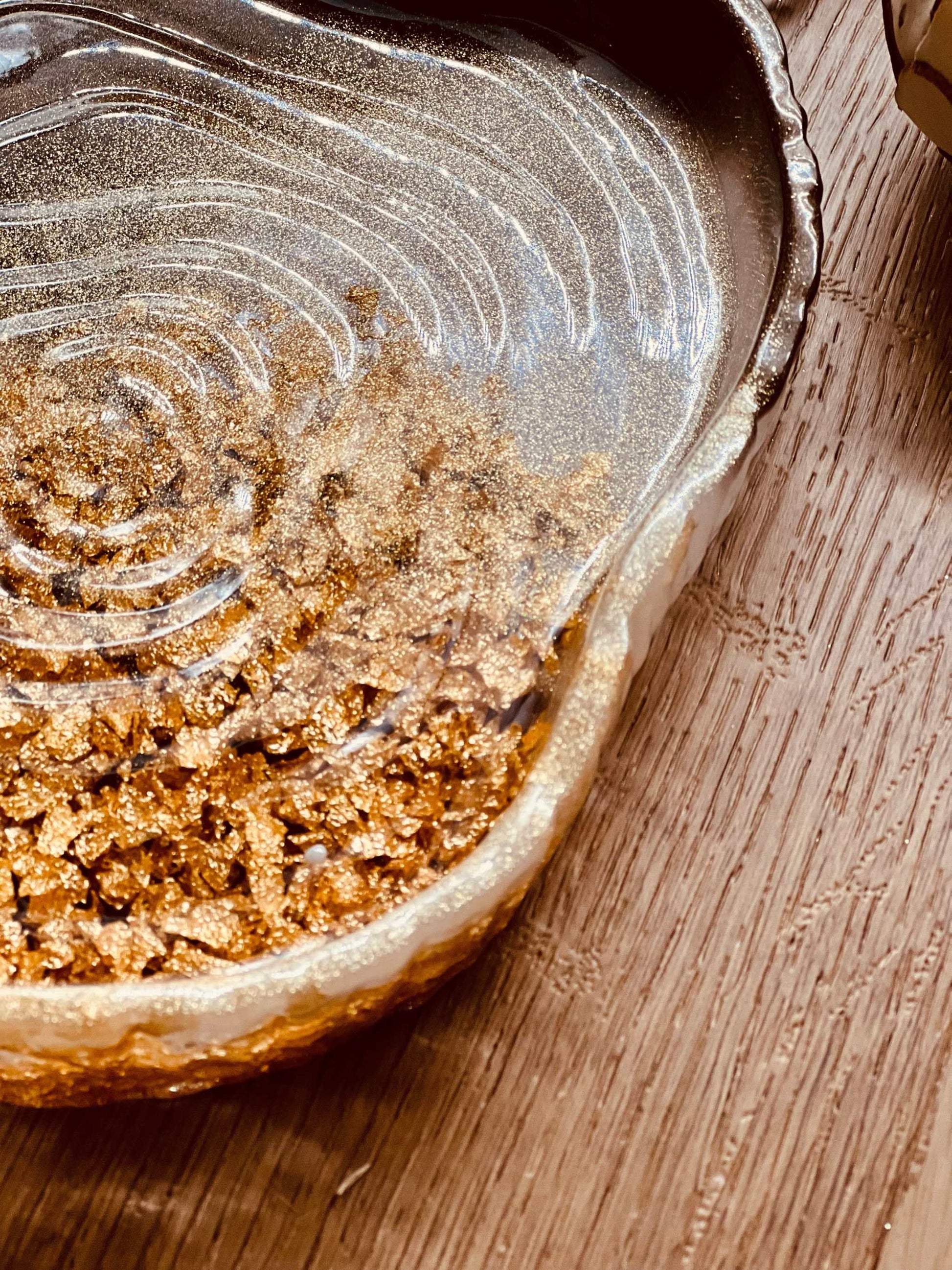Handmade resin bowl in brown with golden details. All of my items are one-of-a-kind. Bowls are the perfect decoration in every living and dining room and an individual gift for your loved ones. Dimensions: diameter approx. 20x18cm.