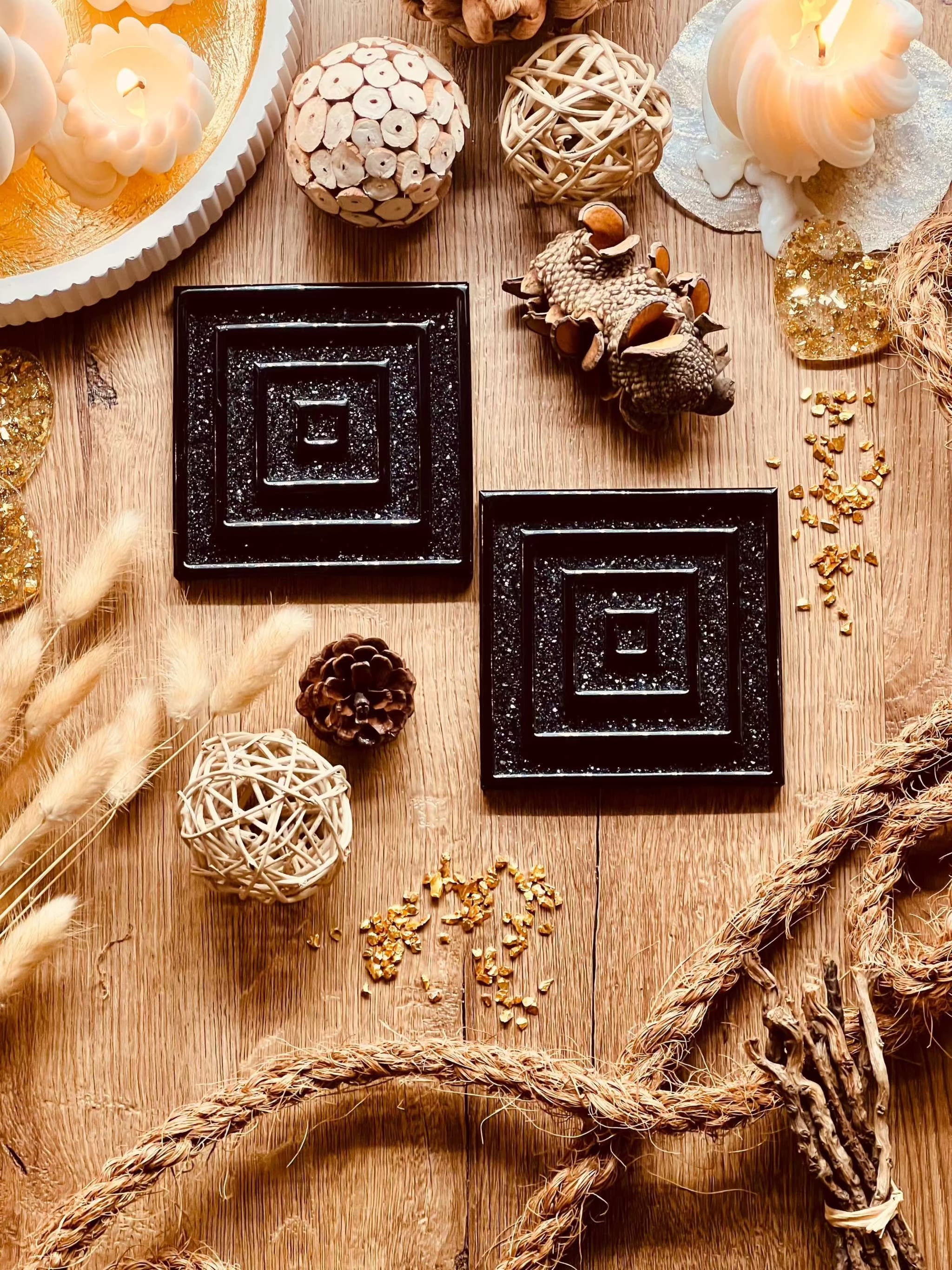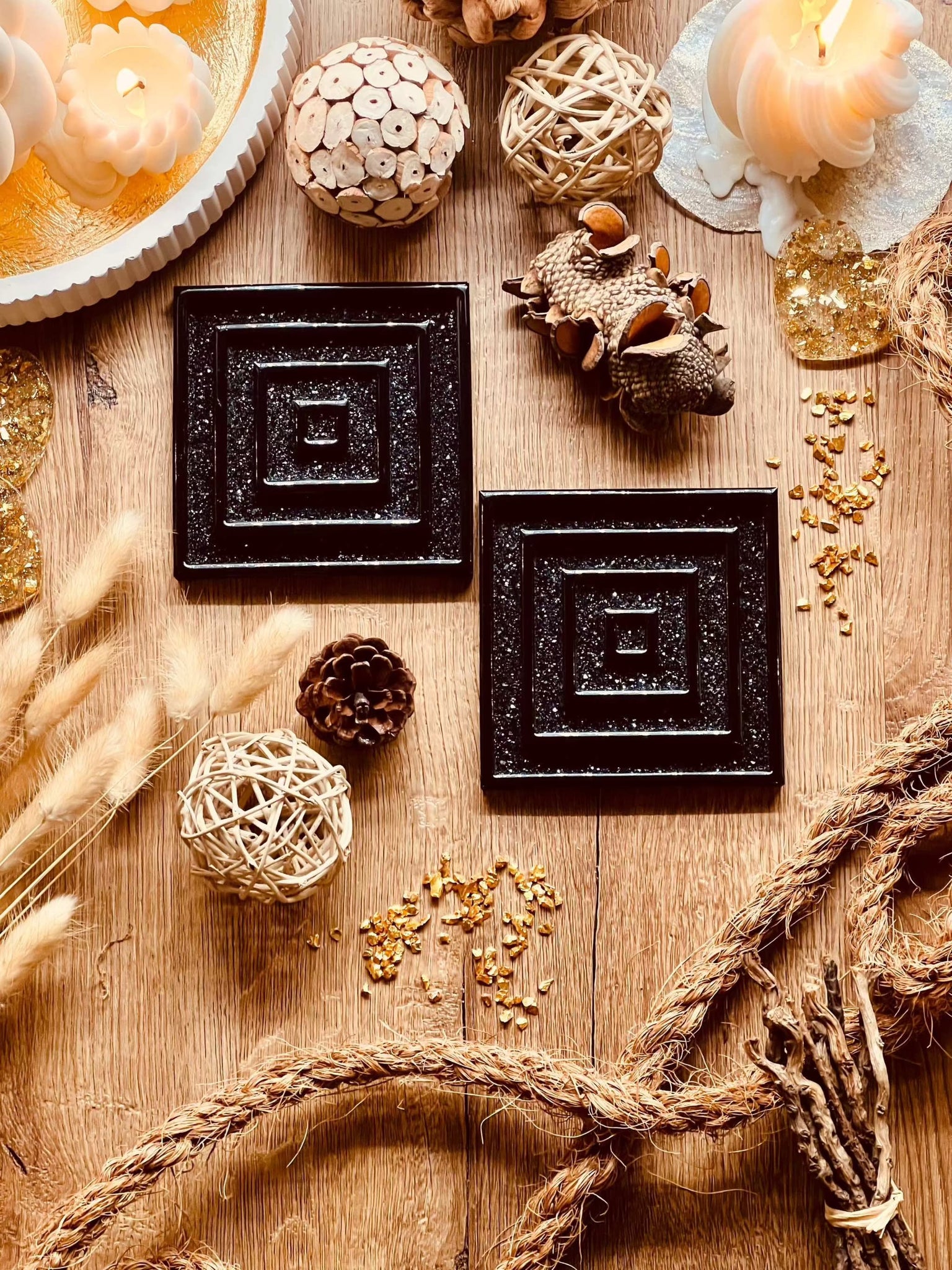 Handgemachte Untersetzer aus Resin in schwarz im 2-teiligen Set. Alle meine Artikel sind einzigartige Unikate. Diese Untersetzer sind die perfekte Dekoration auf jedem Tisch und ein individuelles Geschenk für deine Liebsten. Maße ca. 10x10cm